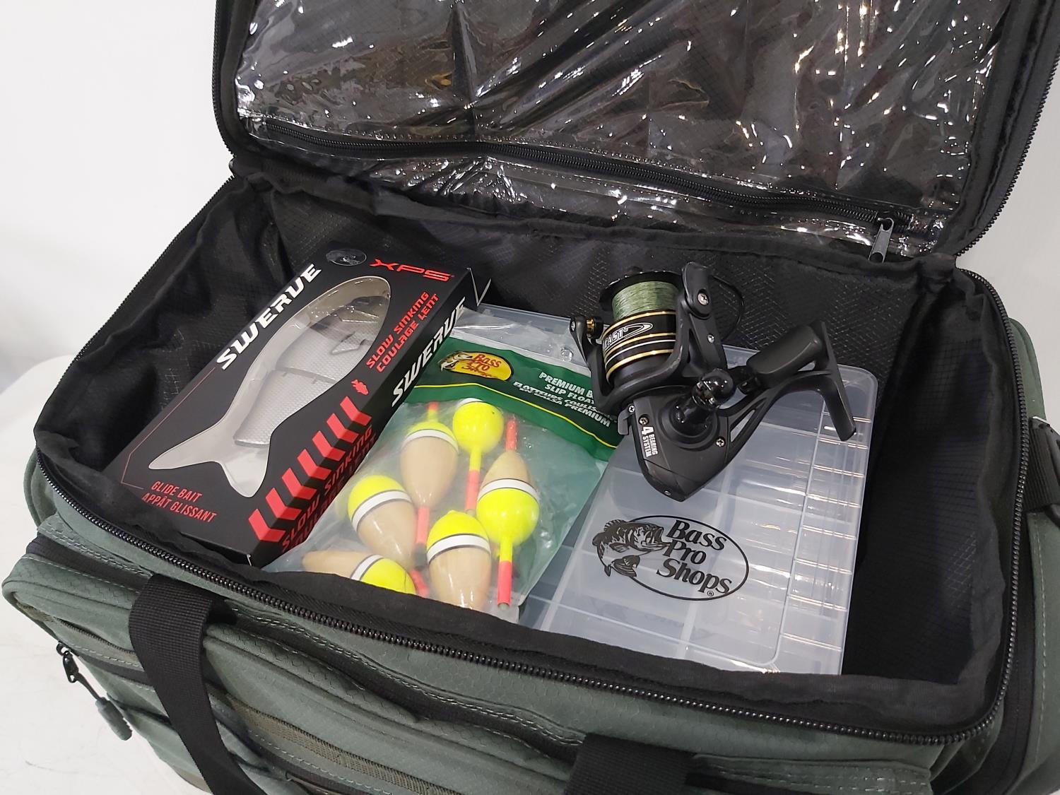 1312 Bass Pro Shops 3700 Tackle Bag, Megacast Spinning Reel, Fishing Lure and Balsa Slip Floats