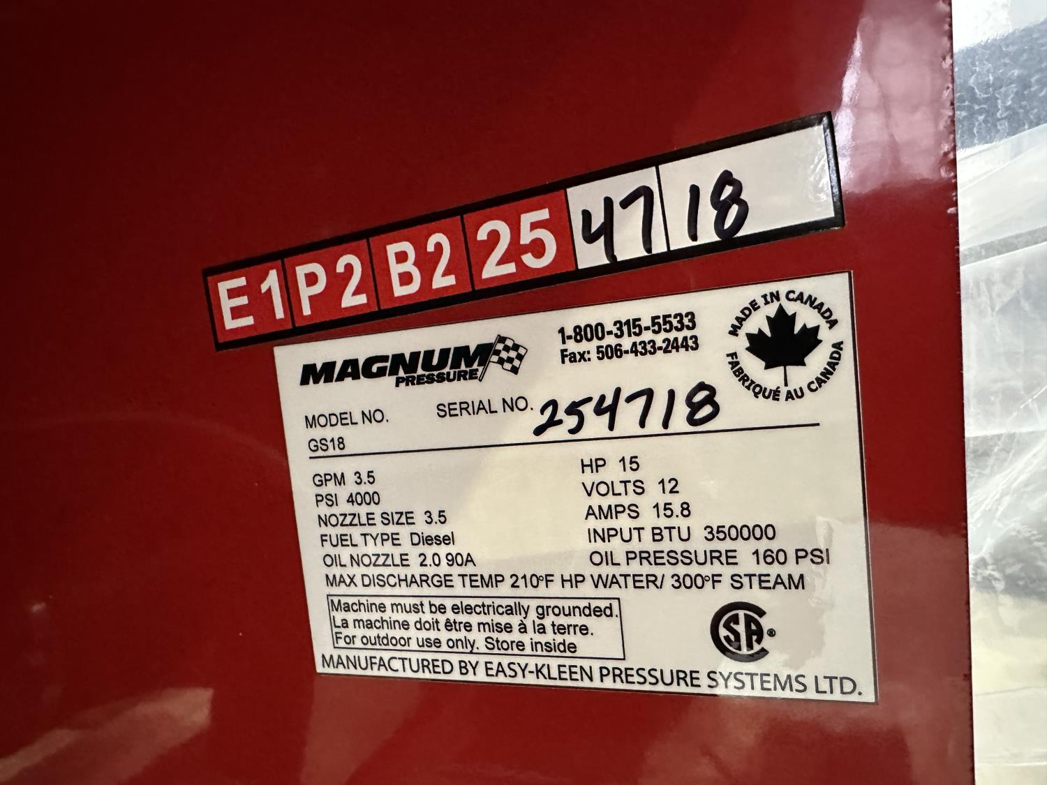 3.5 GPM at 4000 PSI, 15 HP, gasoline engine, electric start, 12 volt burner, oil/diesel fired burned/thermostat, schedule 80 coil with stainless steel housing, fully welded, powder coated frame, 10 gallon poly fuel tank, 30' hose and wand