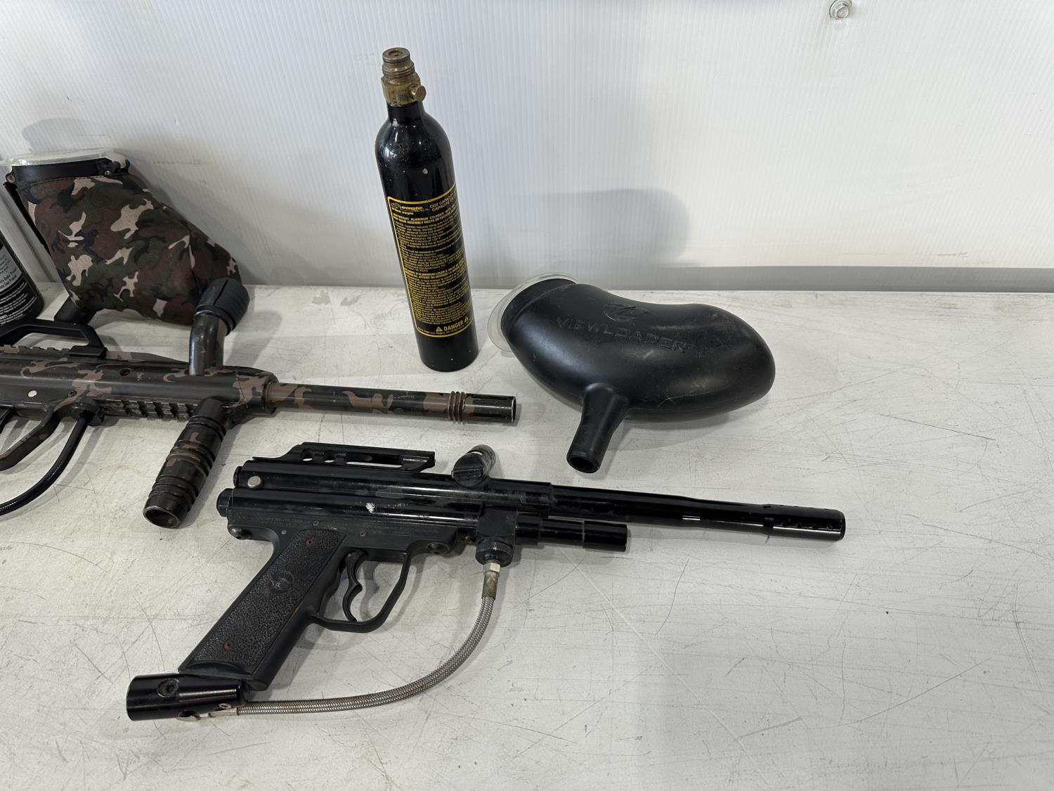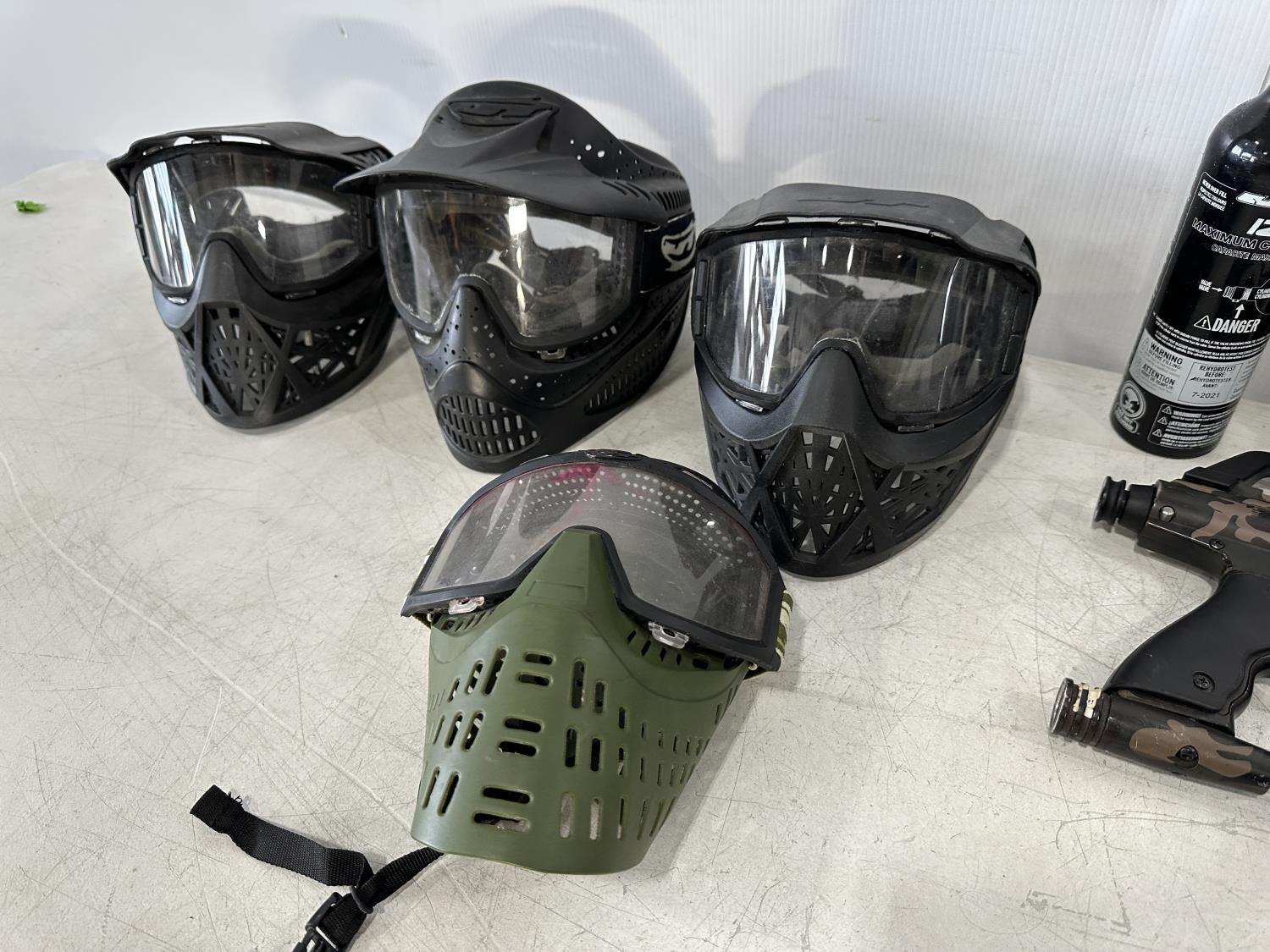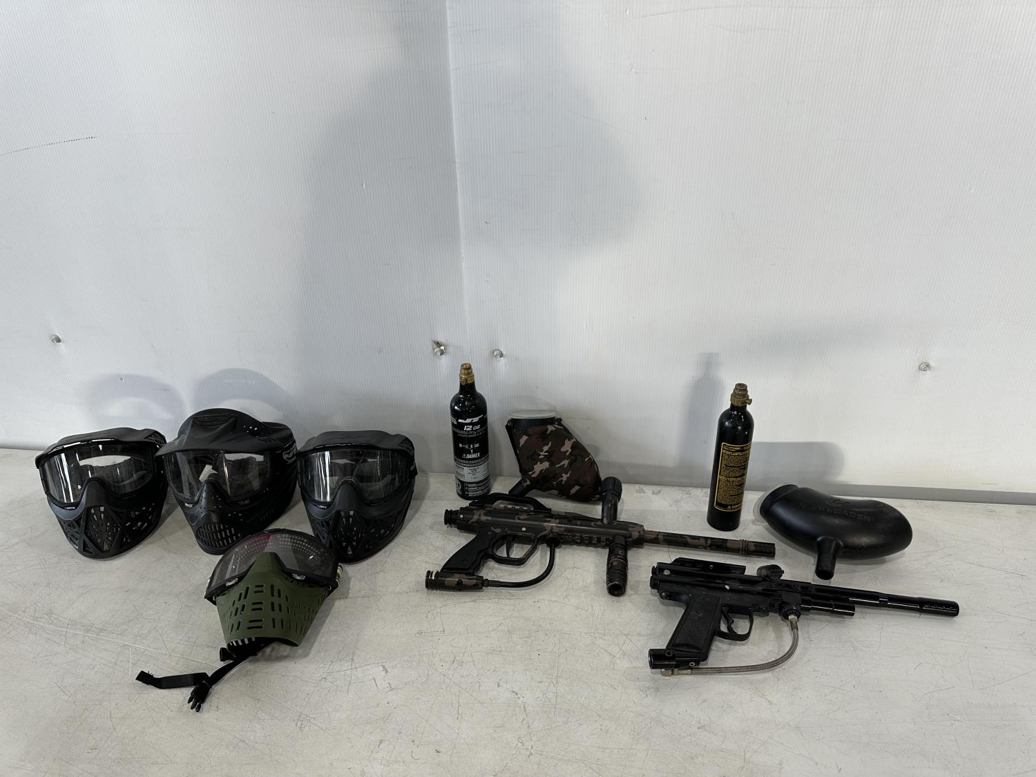 (2) paintball guns, (4) masks, (2) cylinders and (2) hoppers