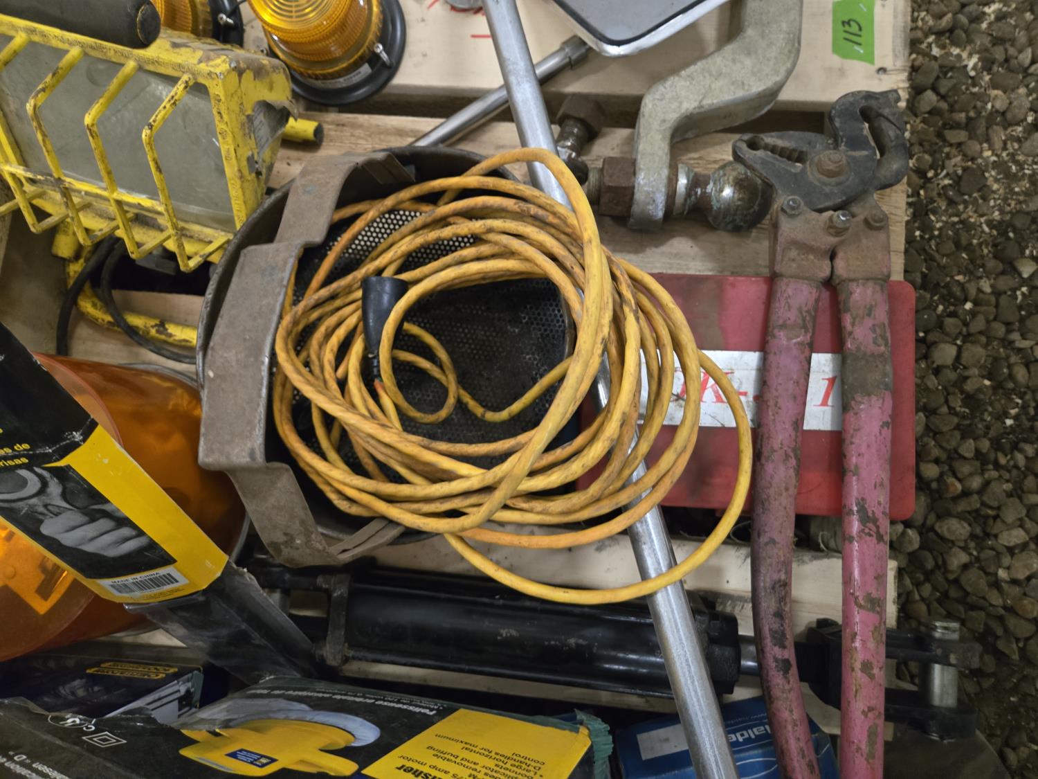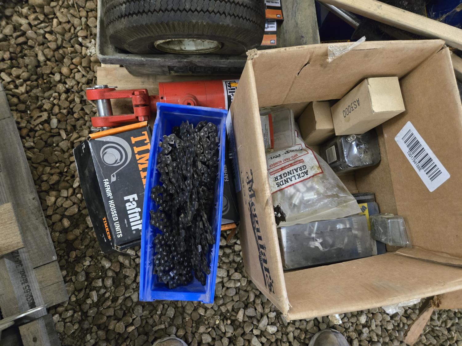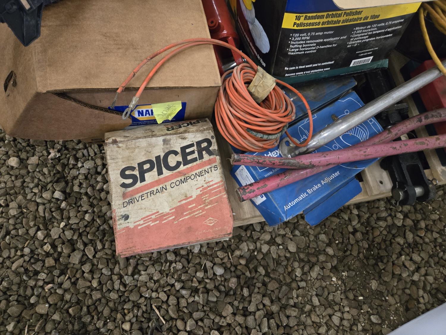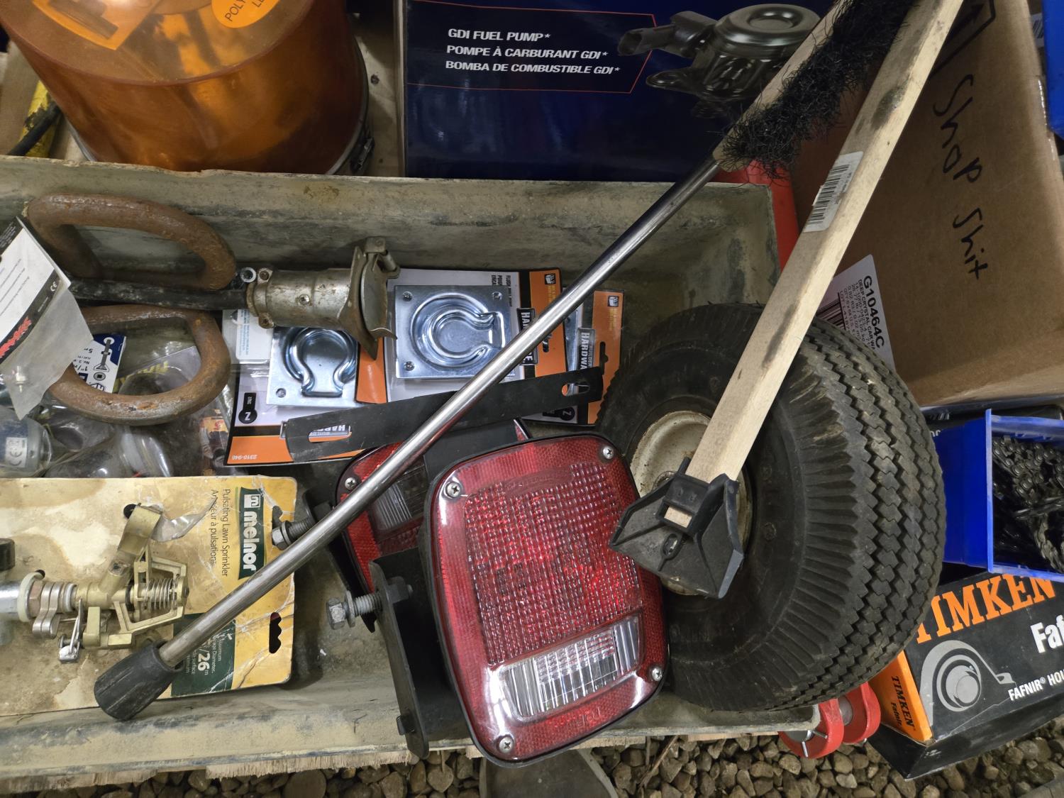 miscellaneous bearings, lights, fuel pump, chain saw chains, wheelbarrow wheel, (2) snow brushes, (2) power washer wands, extension cord, 10 inch orbital sander, brake adjuster, miscellaneous parts
