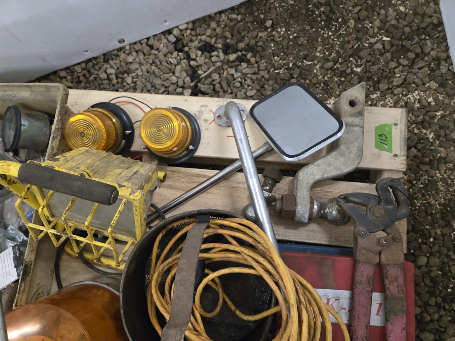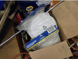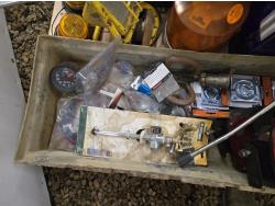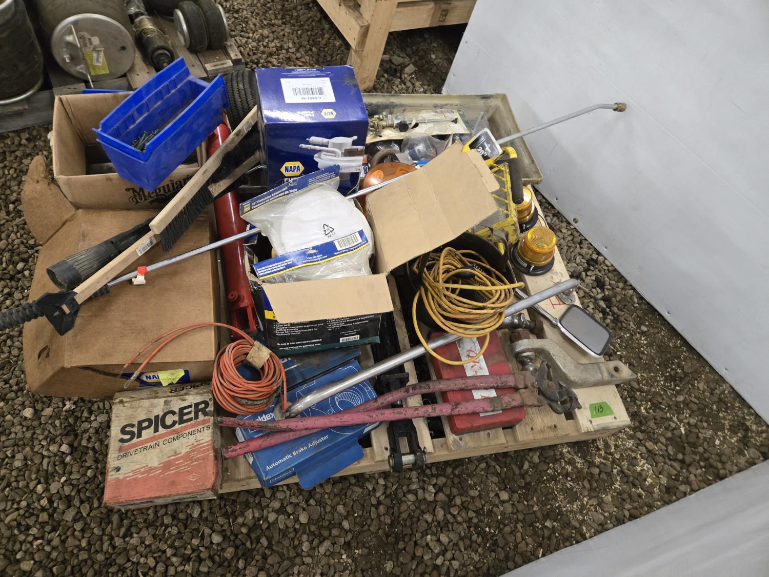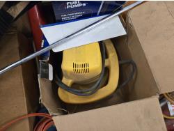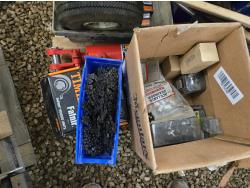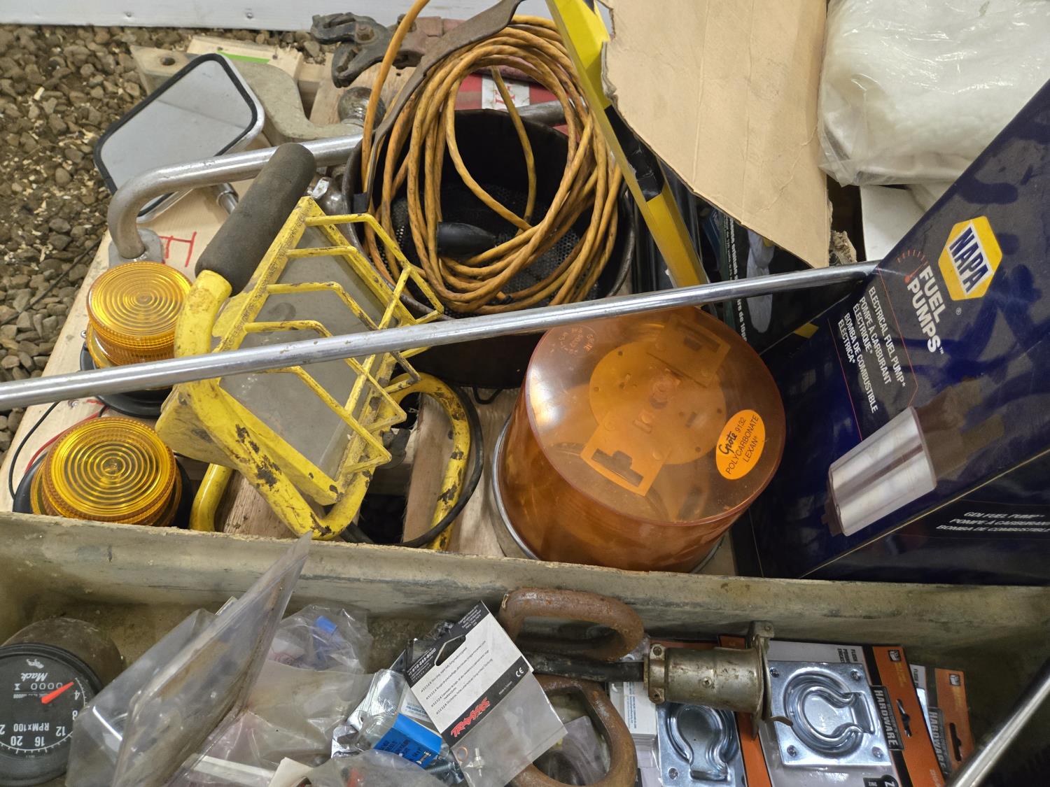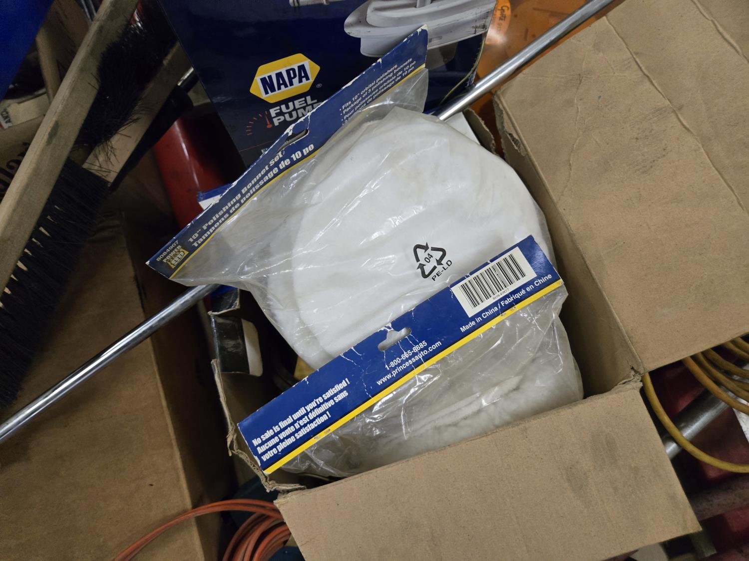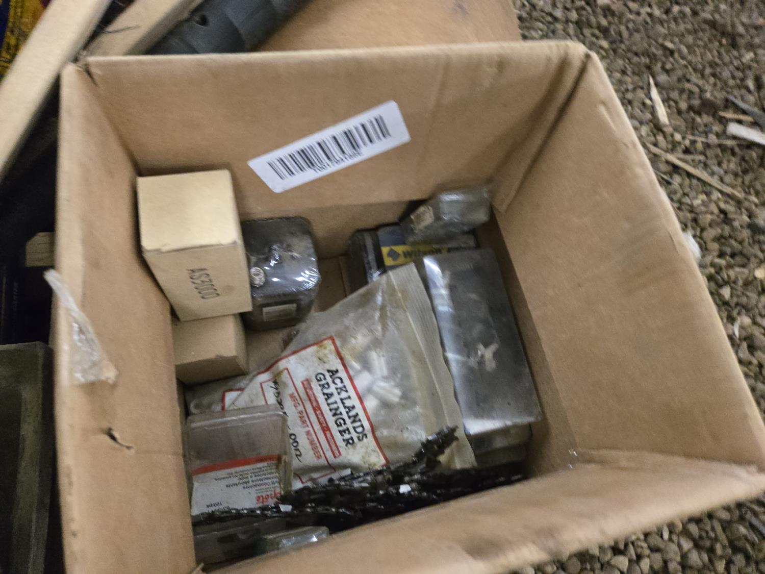 miscellaneous bearings, lights, fuel pump, chain saw chains, wheelbarrow wheel, (2) snow brushes, (2) power washer wands, extension cord, 10 inch orbital sander, brake adjuster, miscellaneous parts
