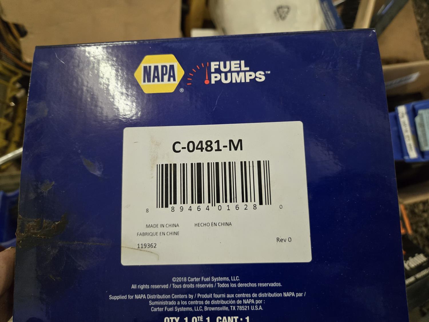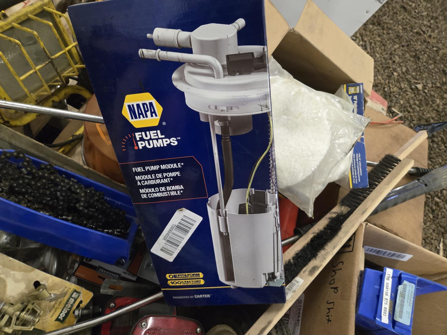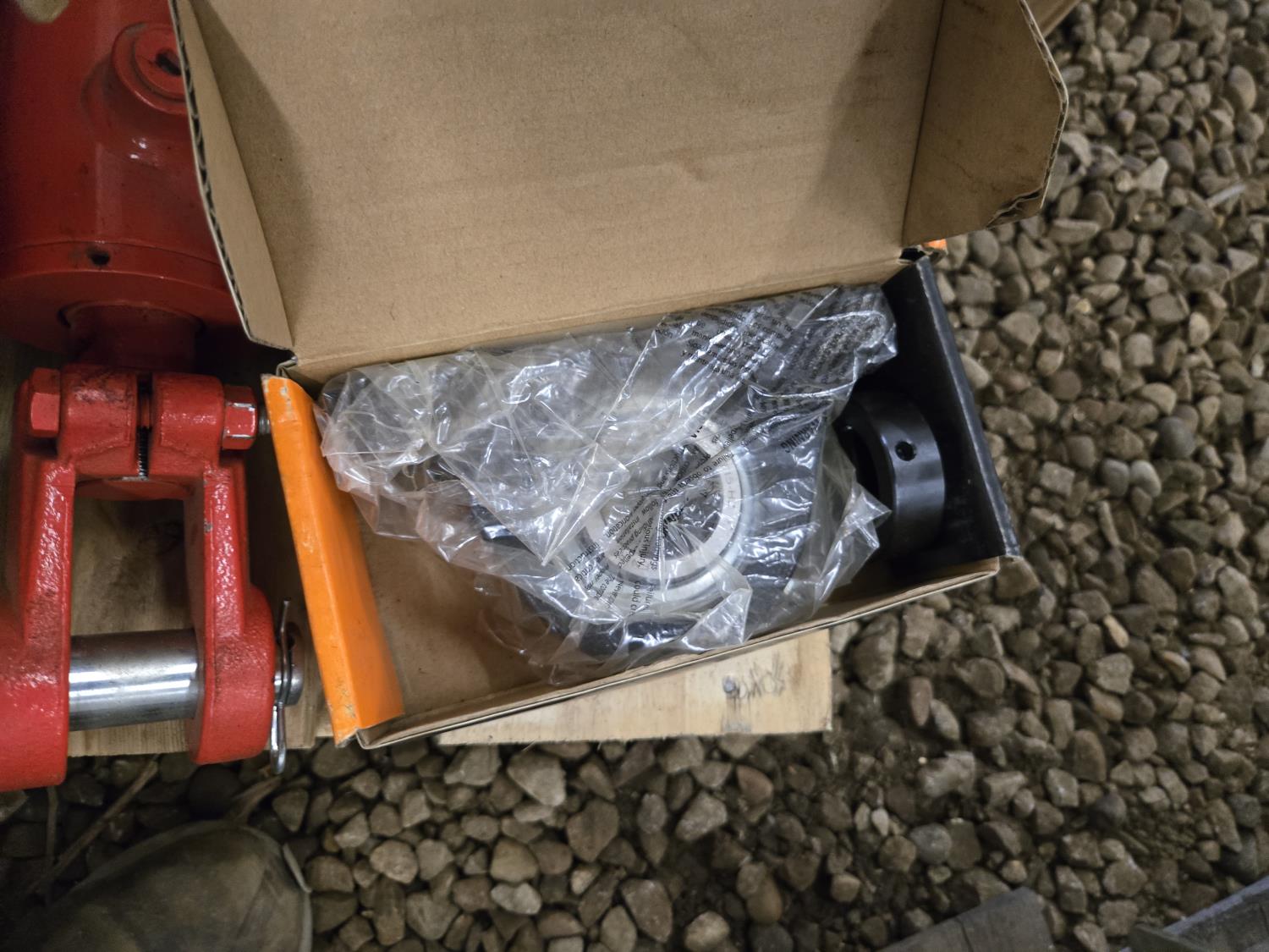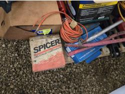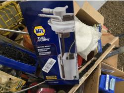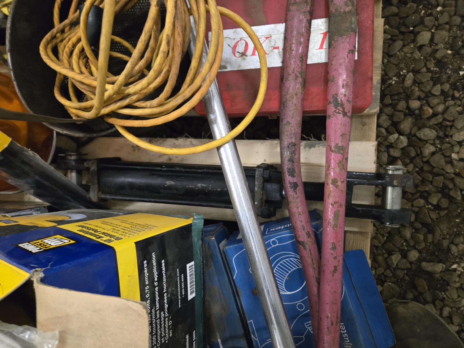 miscellaneous bearings, lights, fuel pump, chain saw chains, wheelbarrow wheel, (2) snow brushes, (2) power washer wands, extension cord, 10 inch orbital sander, brake adjuster, miscellaneous parts