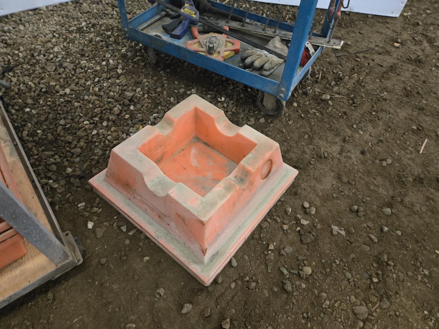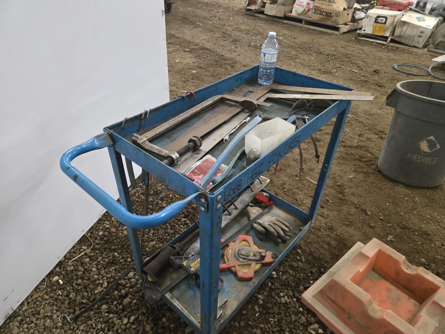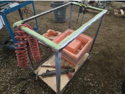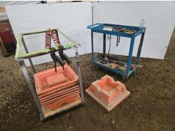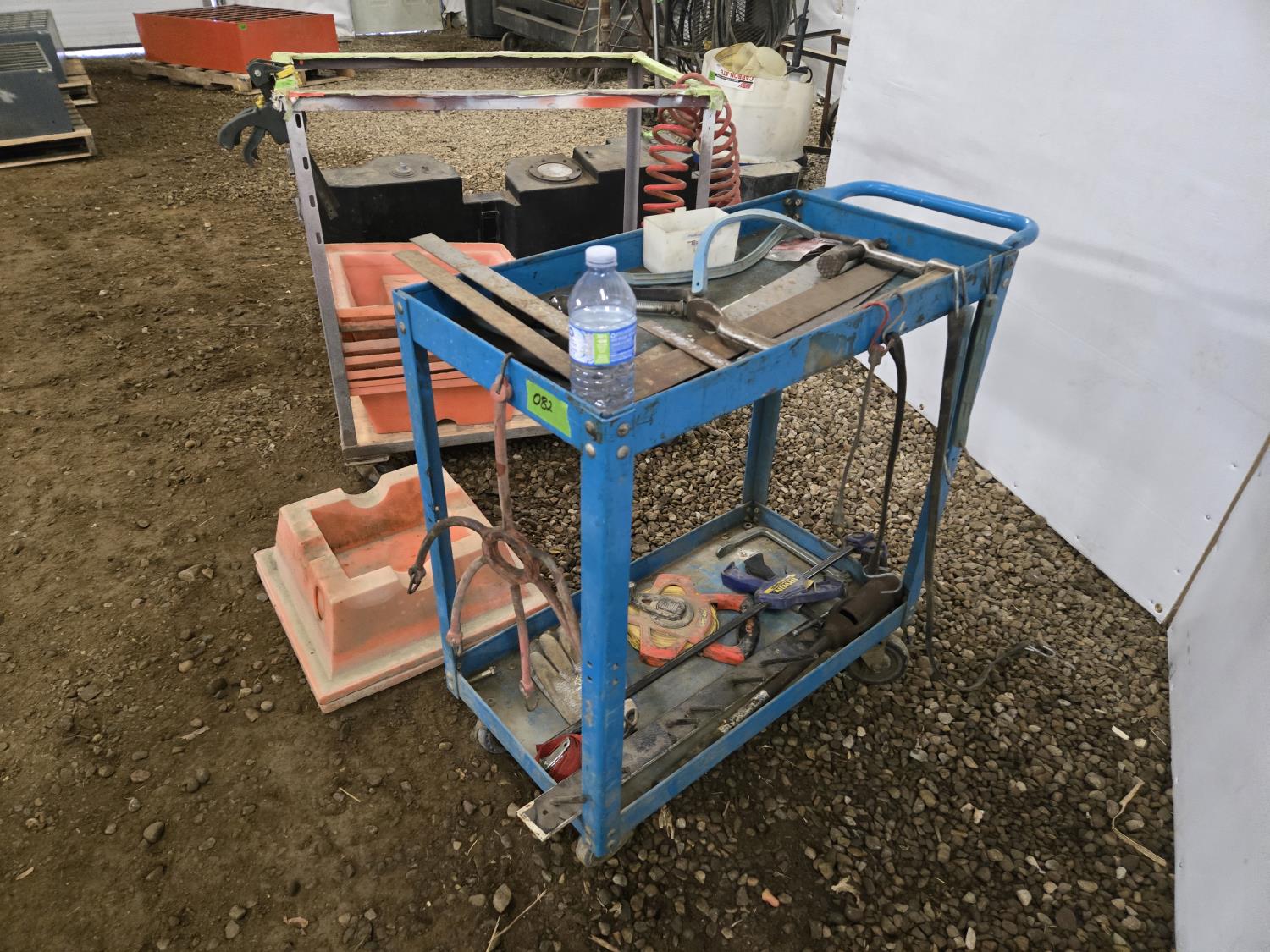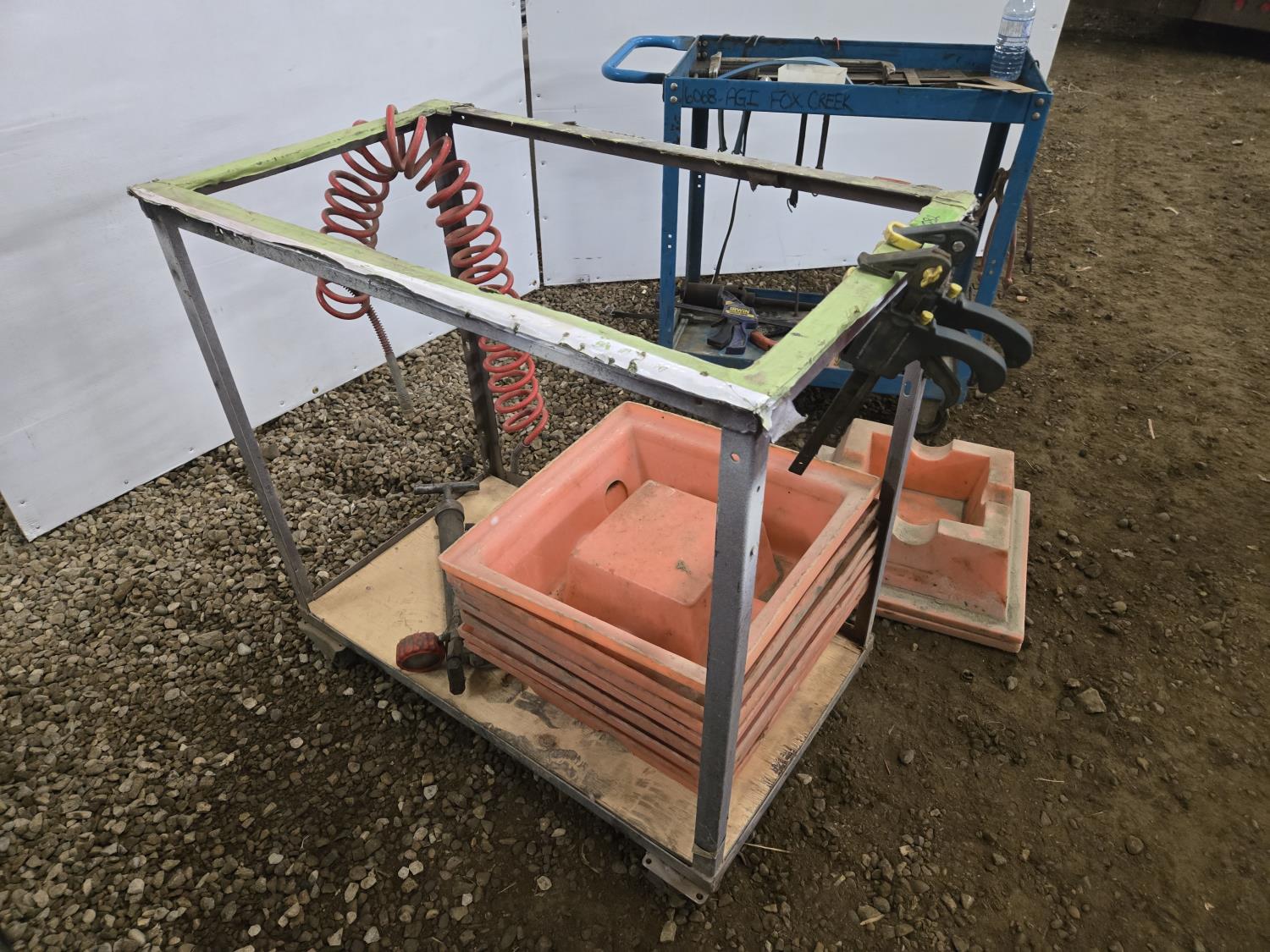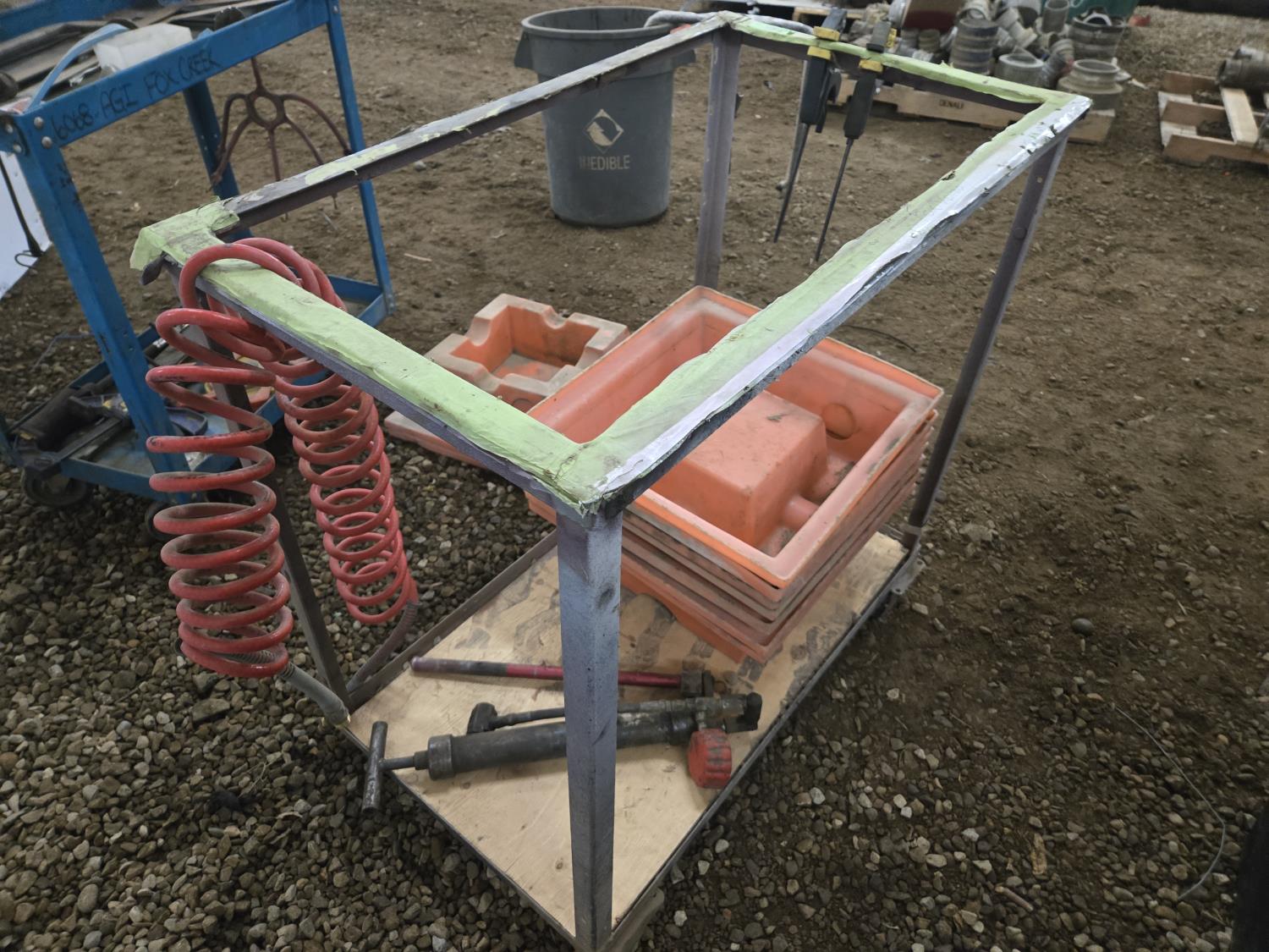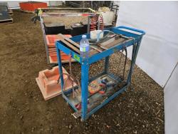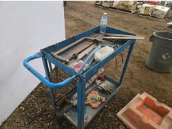 21 inch X 36 inch X 35 inch high welded frame, 30 inch X 16 inch X 32 inch high mechanics cart, qty of spill trays, miscellaneous hand tools, squares, clamps, air hose, grease gun, tape measure, propane torch