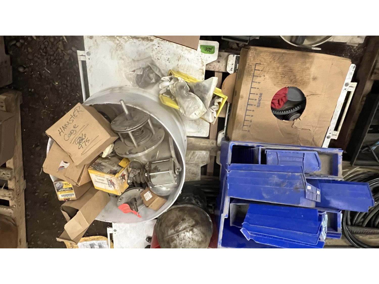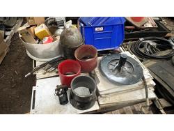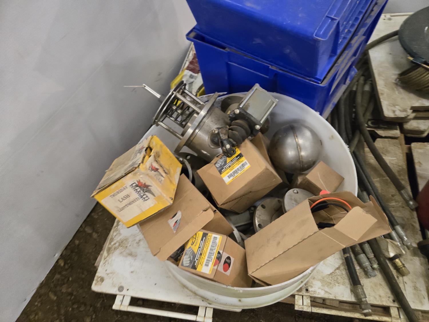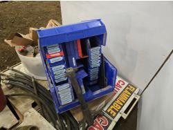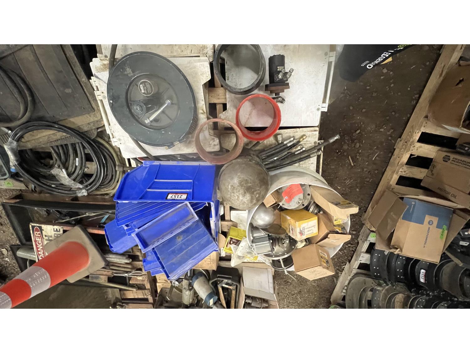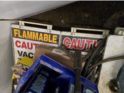 Poly parts boxes, qty of road construction signs, heater motors, miscellaneous vehicle parts