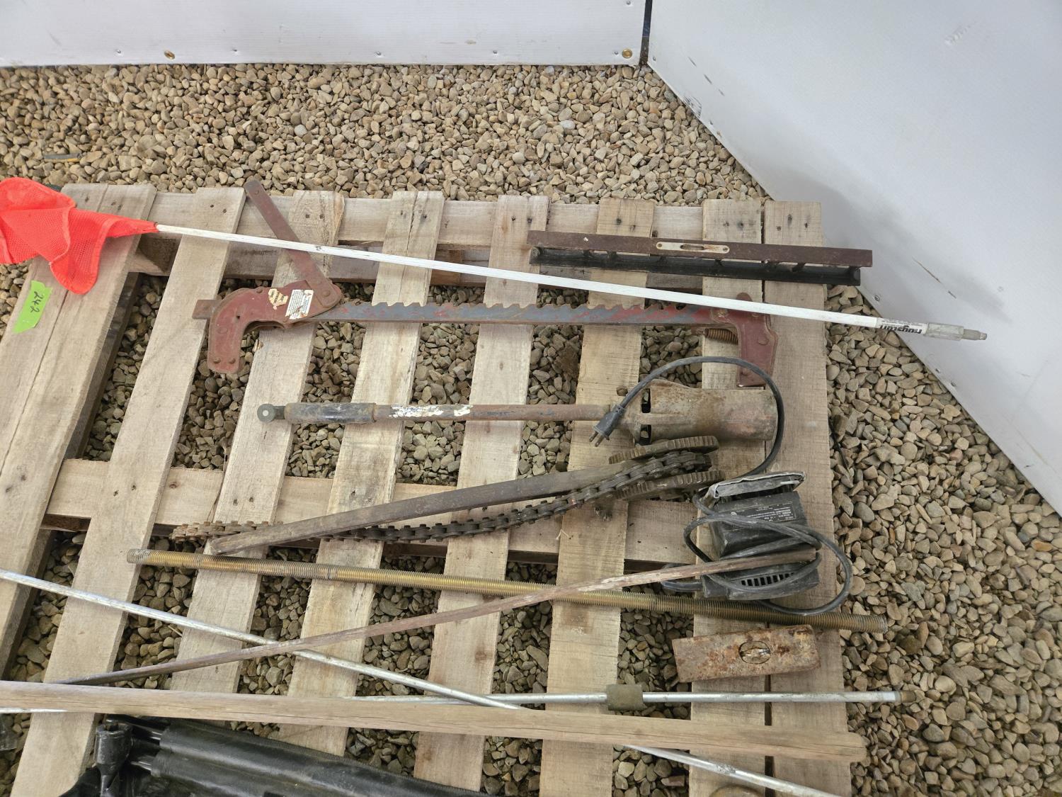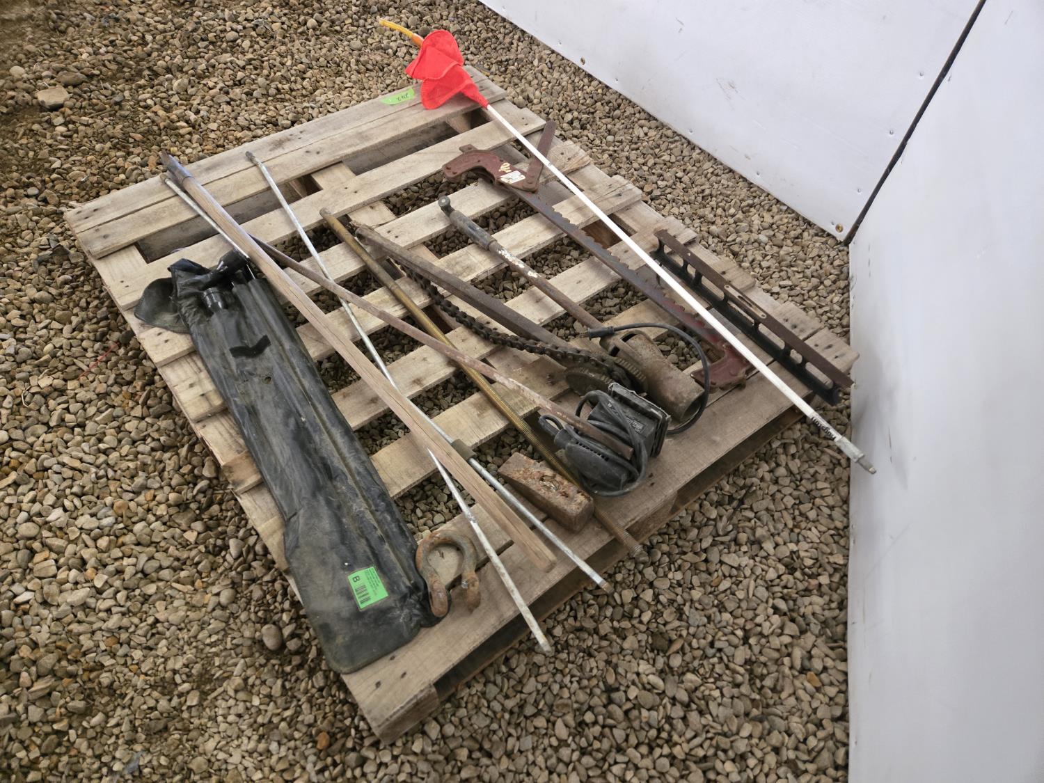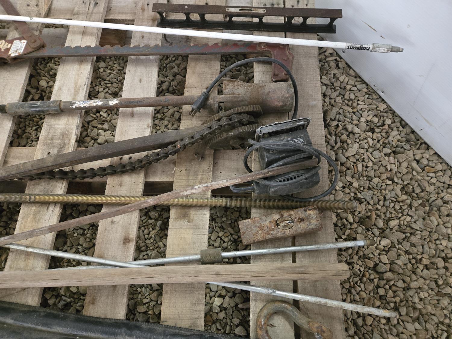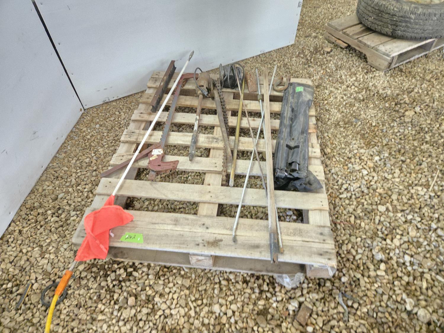 tiger torch, wheel wrench, wire stretcher, chain pipe wrench, level, threaded rod