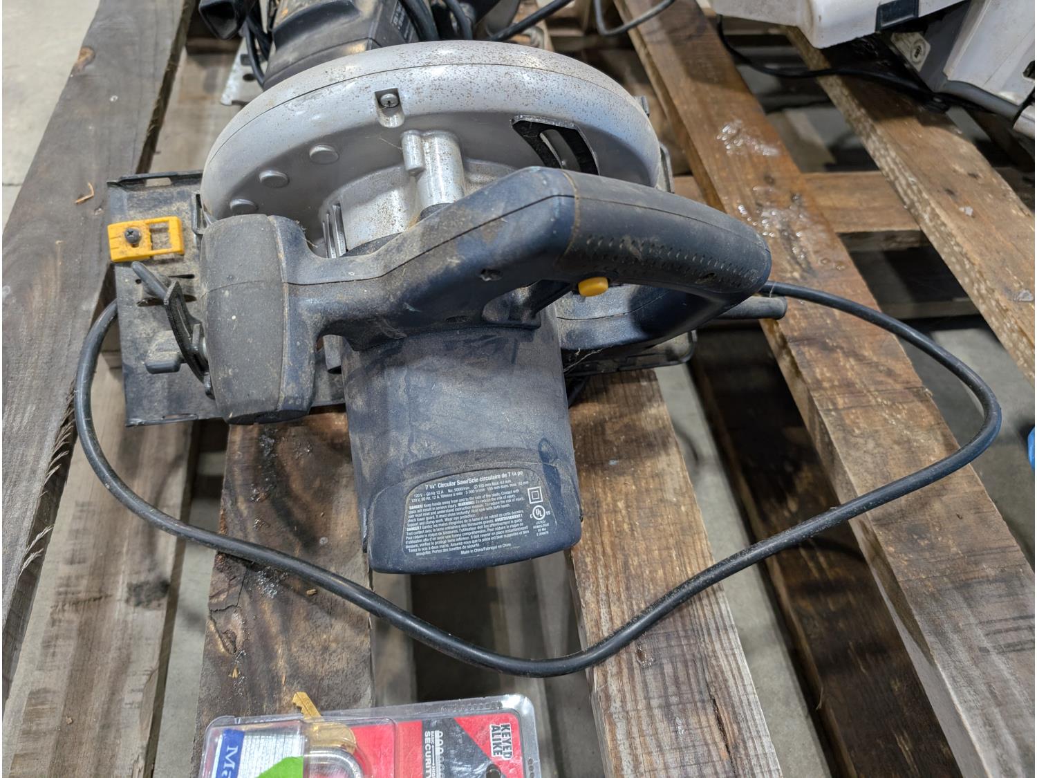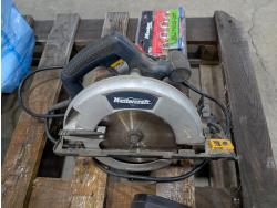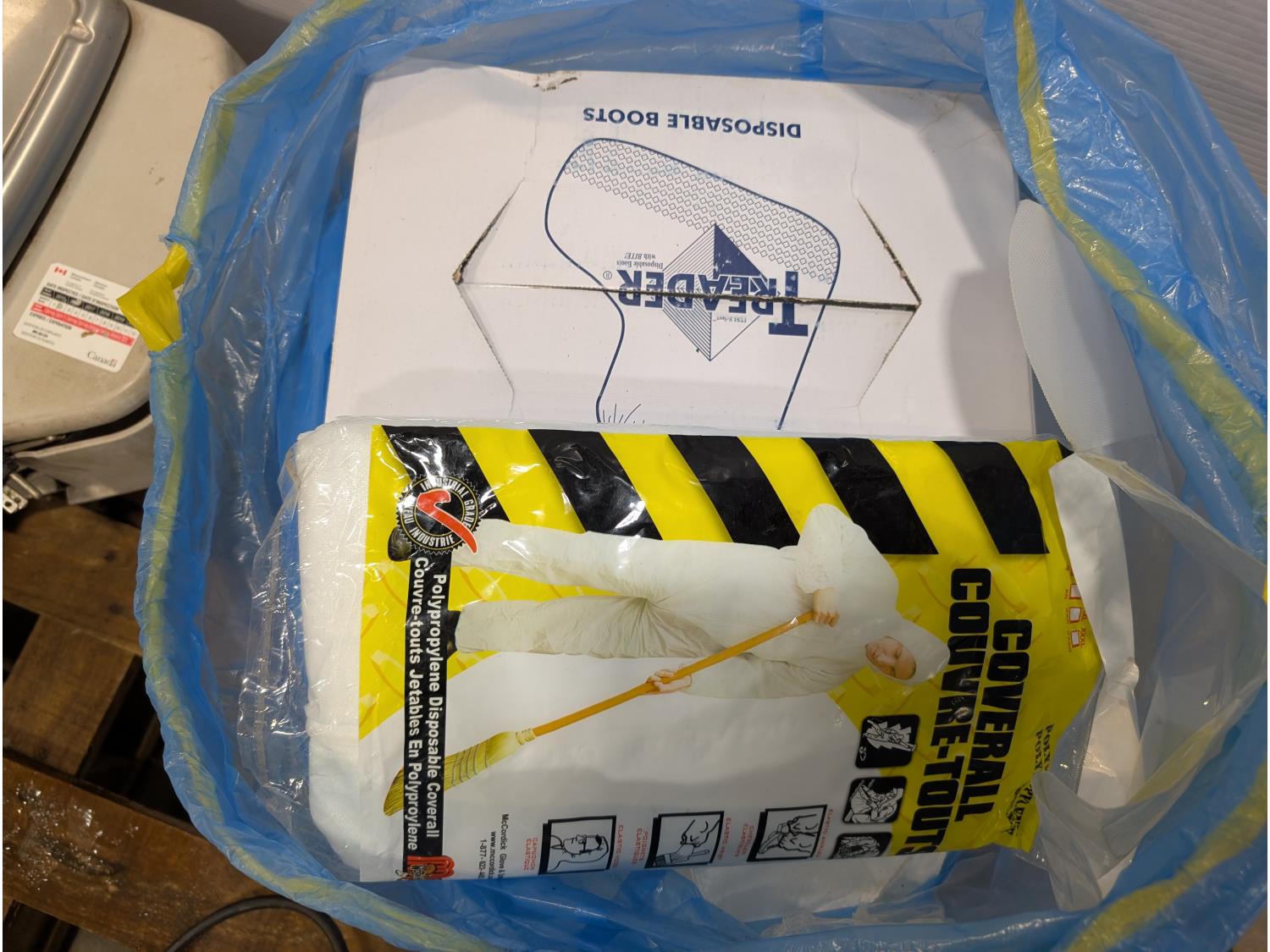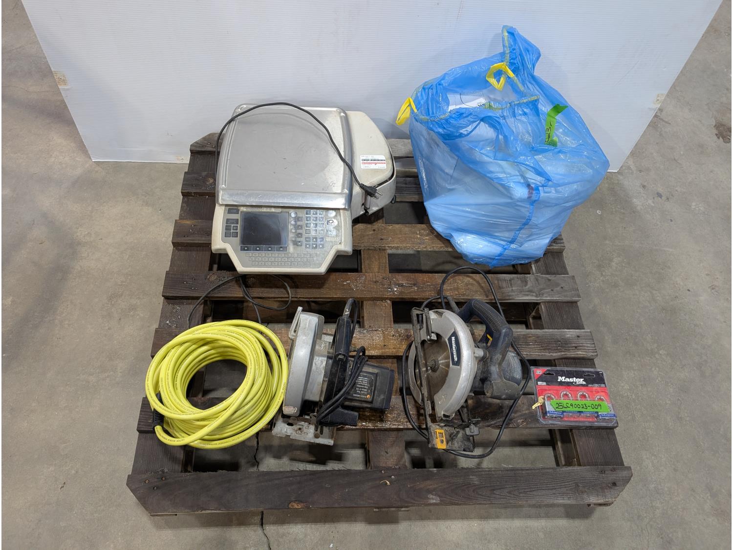 Hobart scale, polypropylene disposable coveralls, disposable boots, Master locks, (2) 7-1/4 inch circular saws