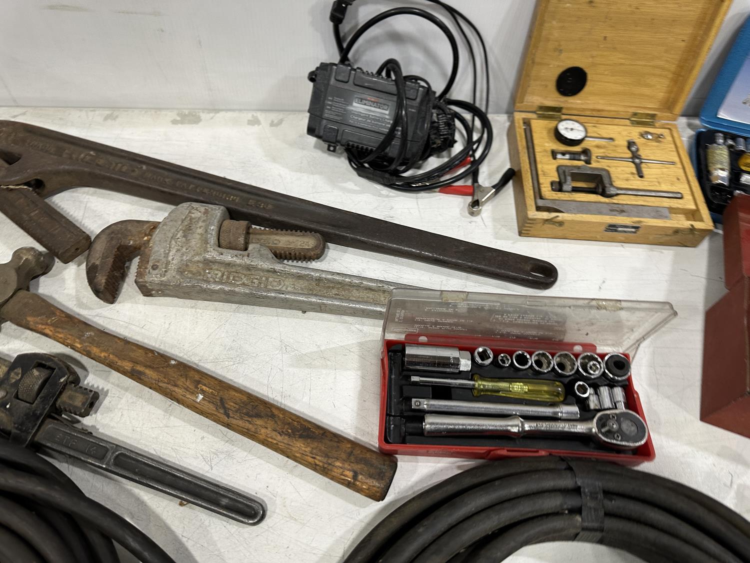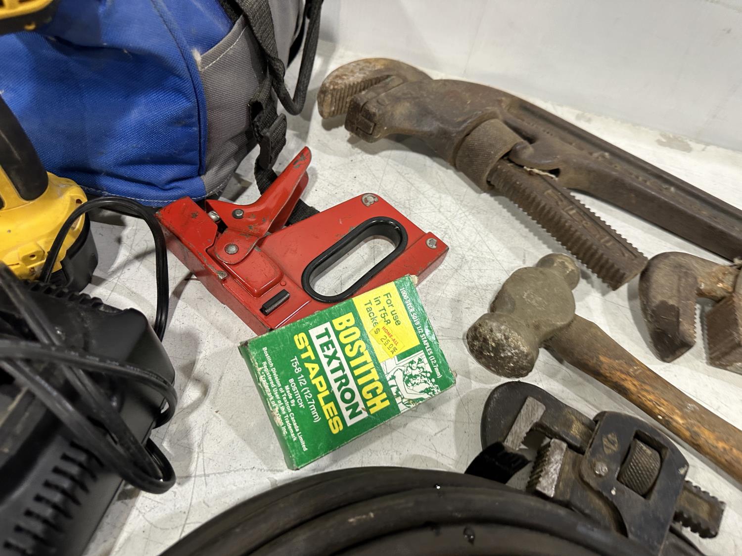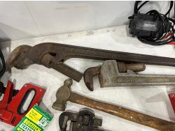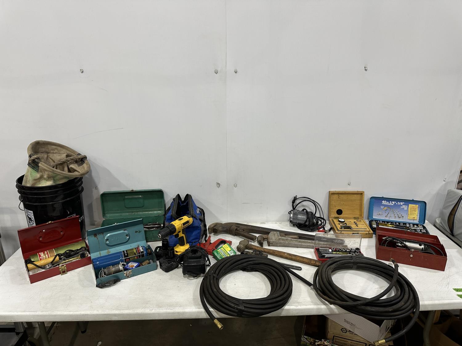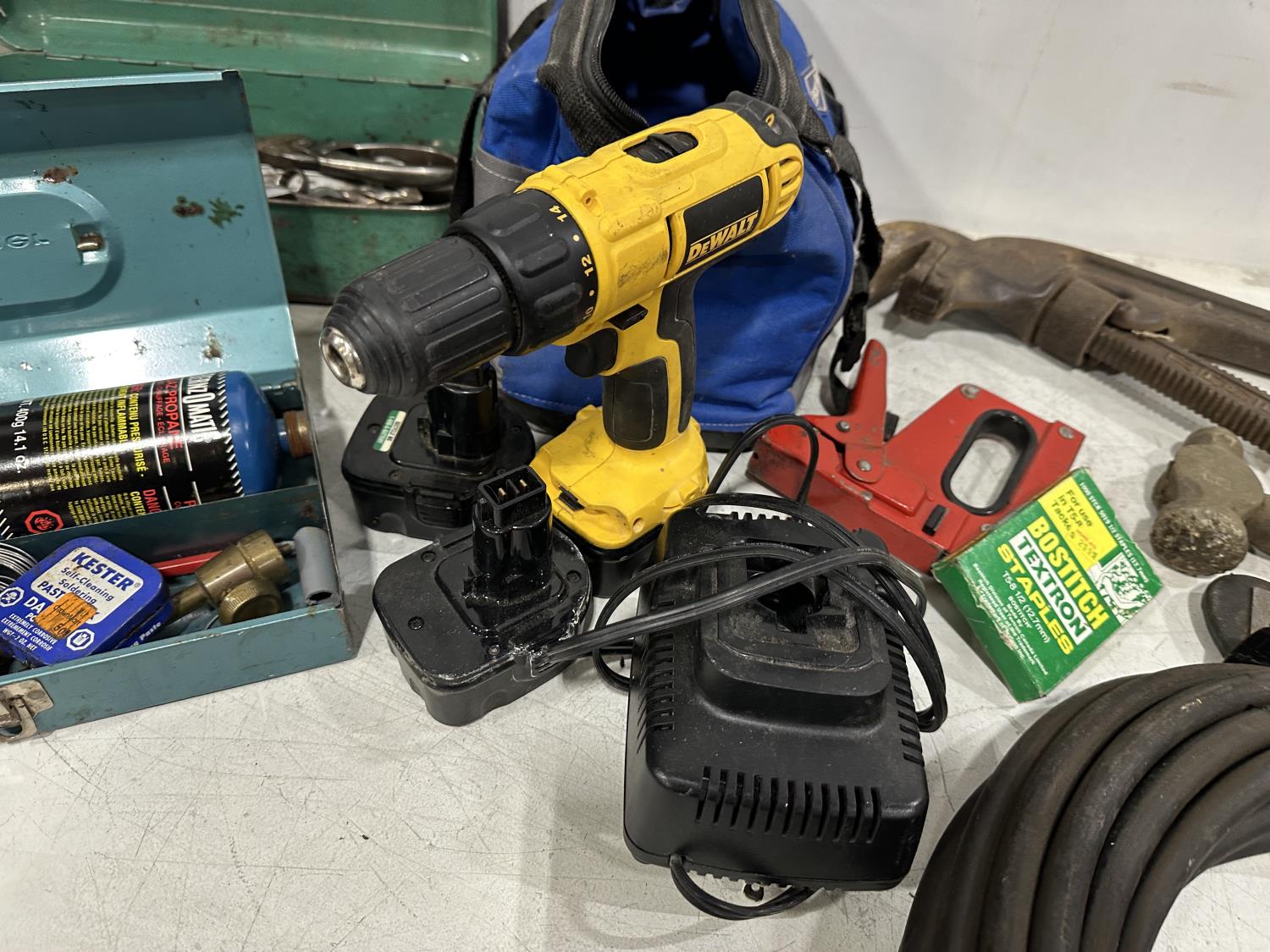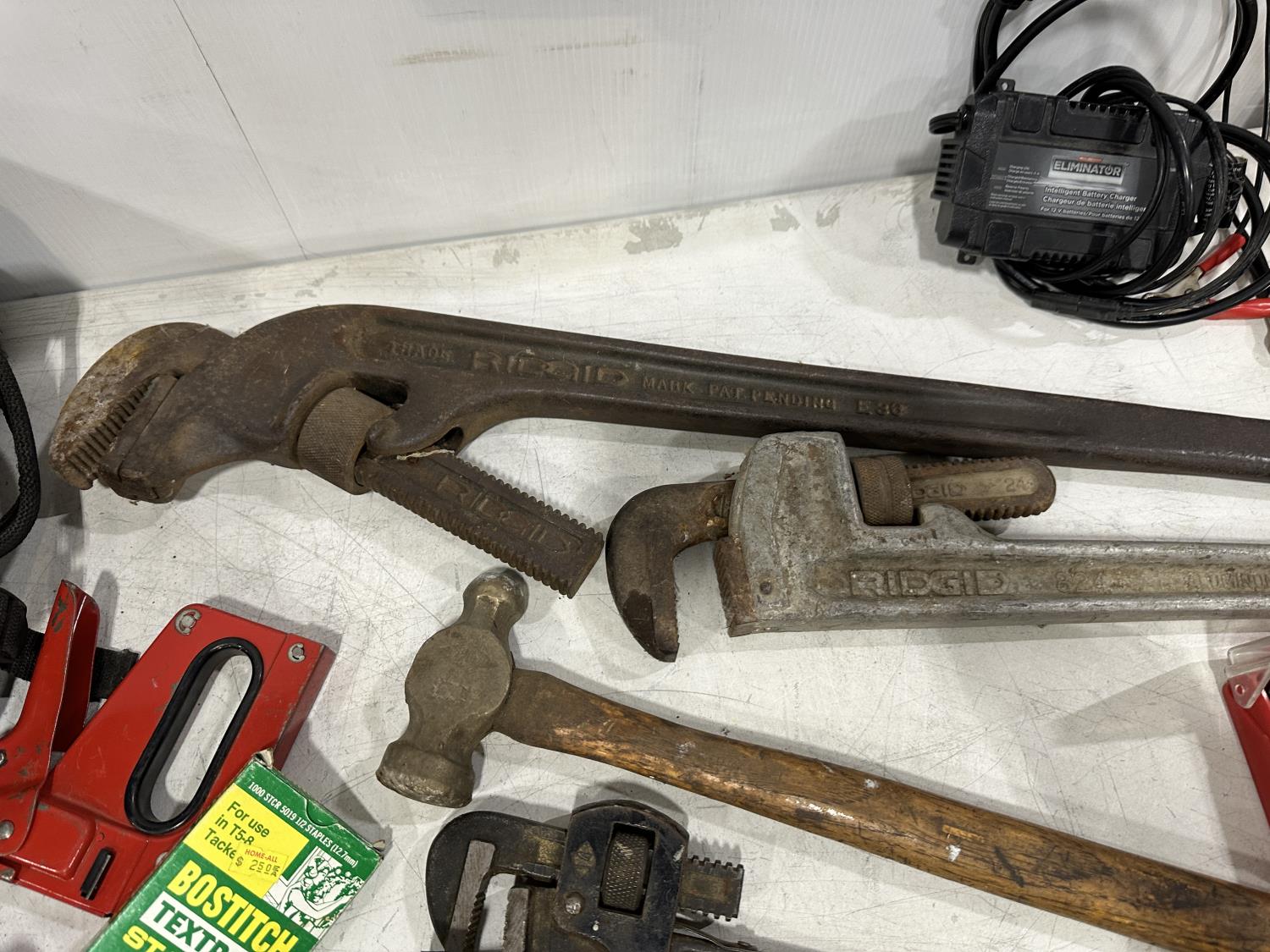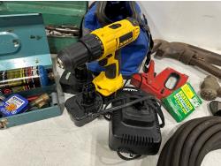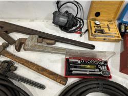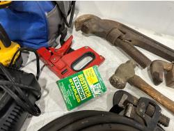 Eliminator intelligent battery charger, combination socket set, propane hoses, pipe wrenches, Dewalt drill, stapler