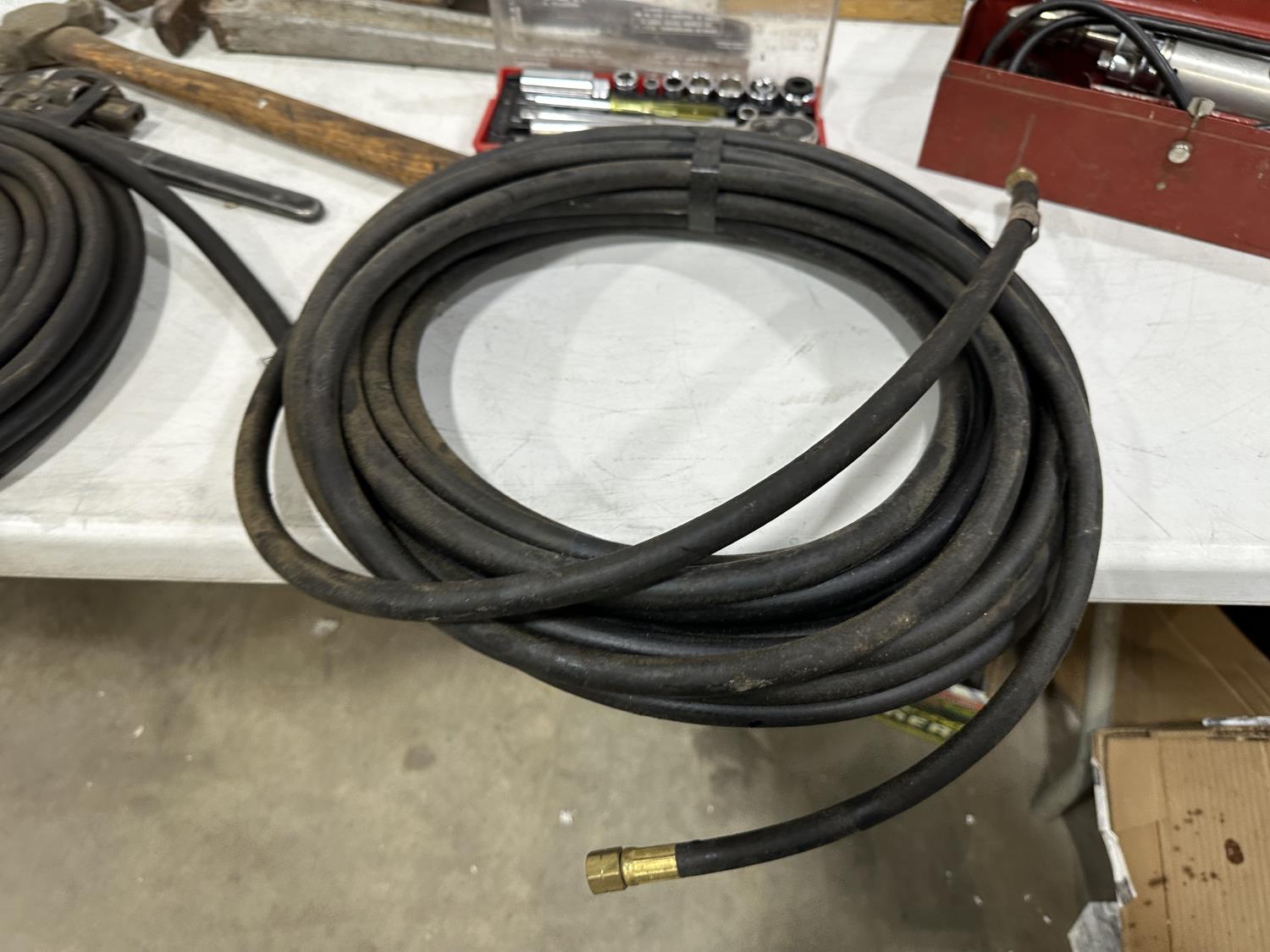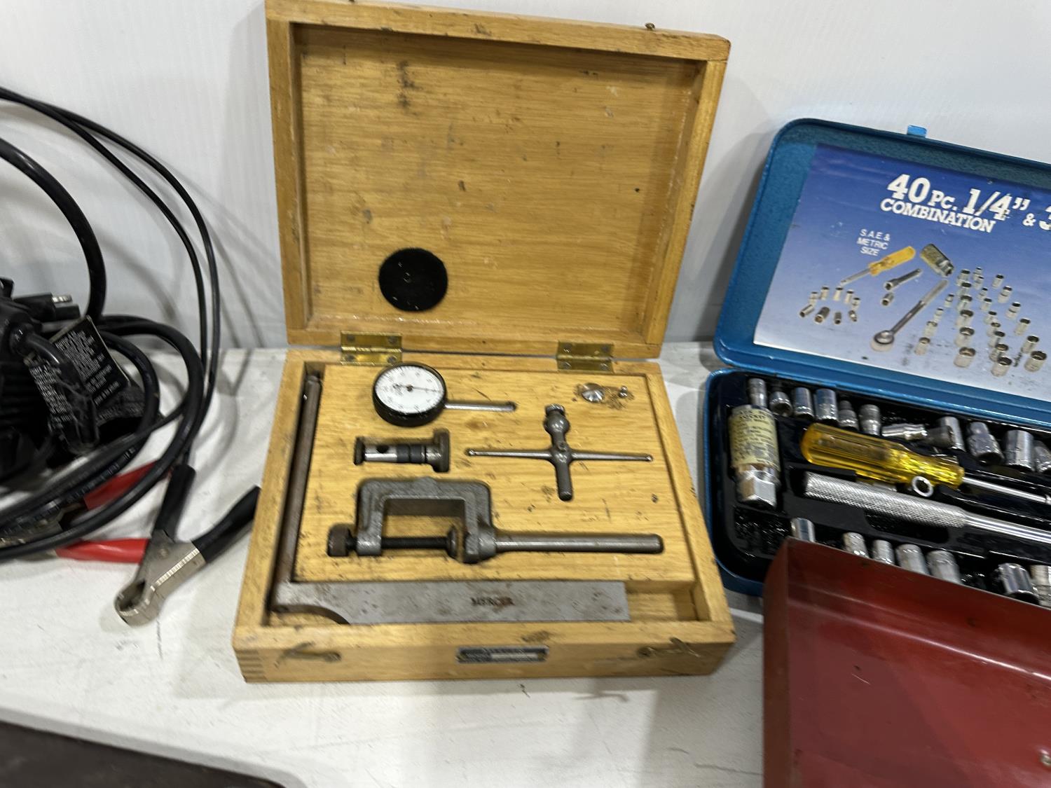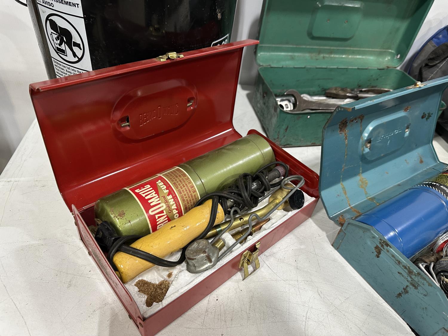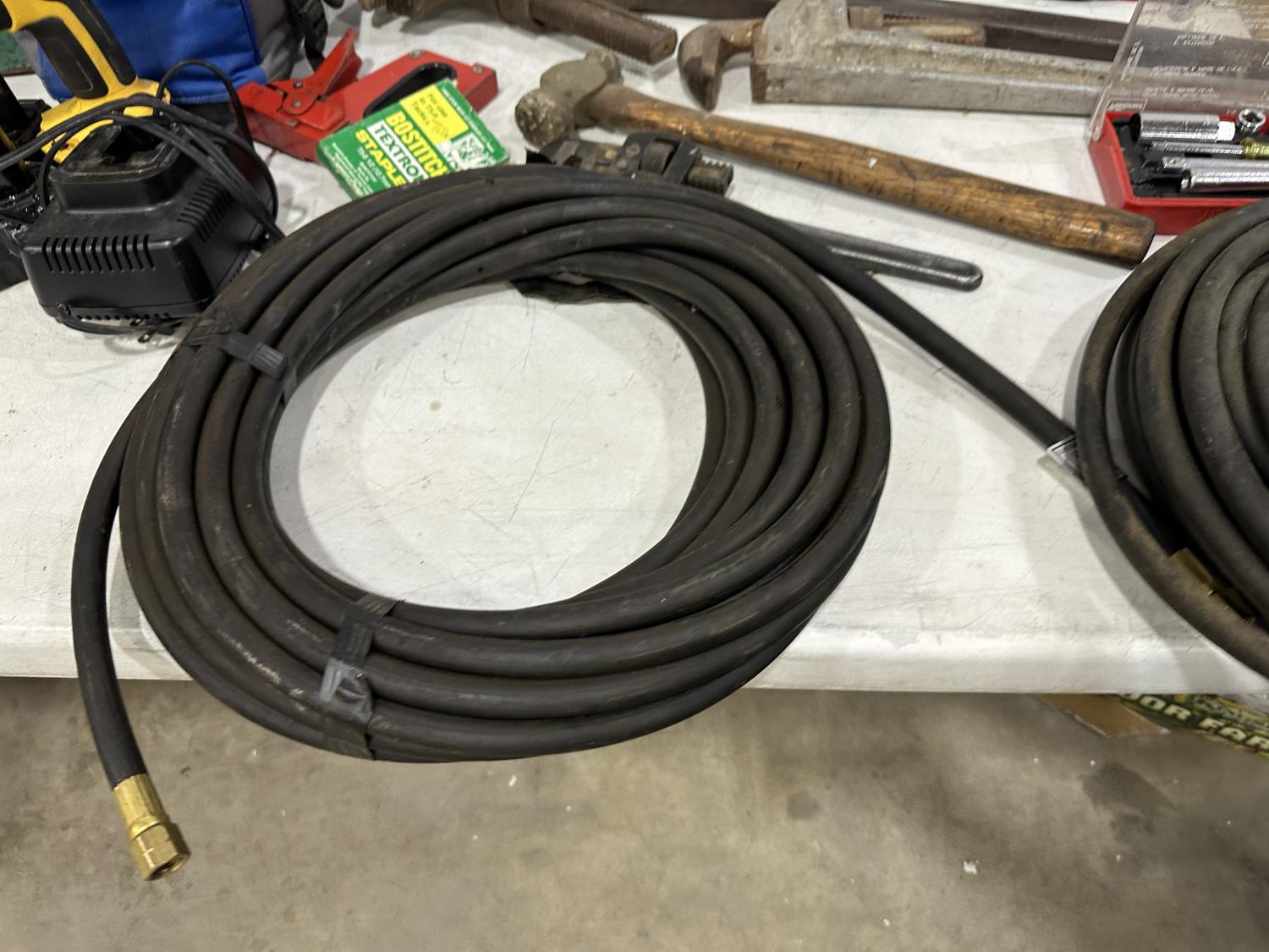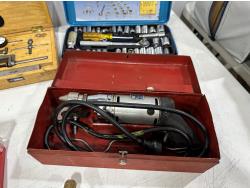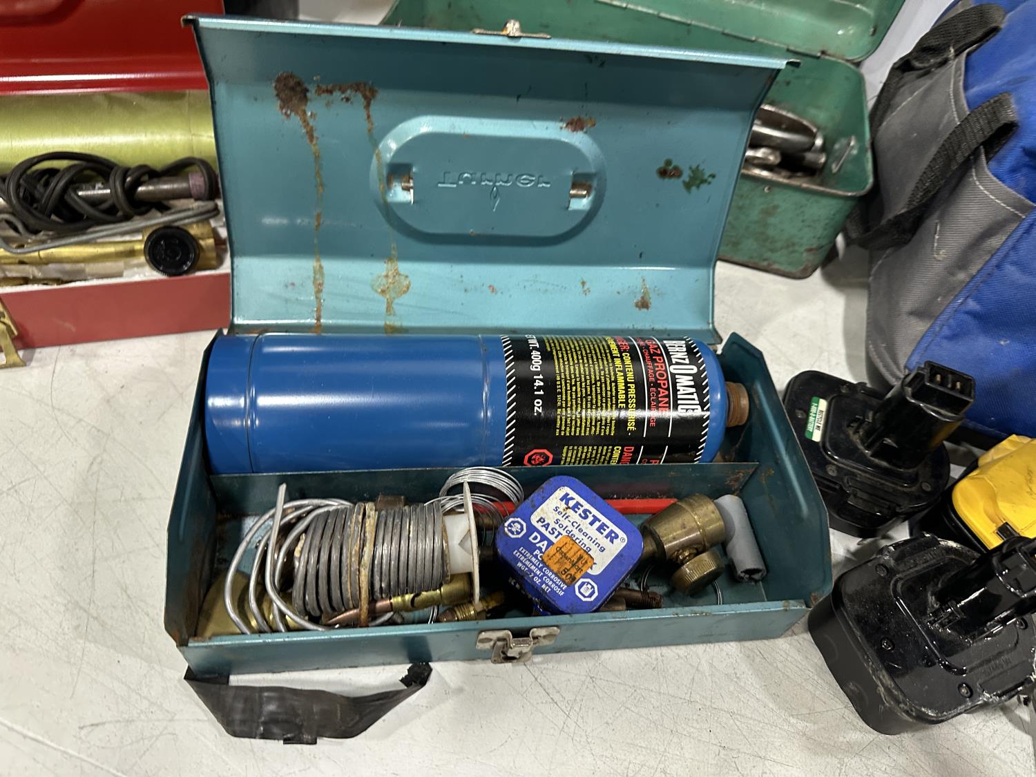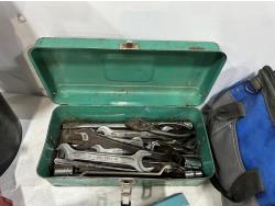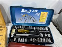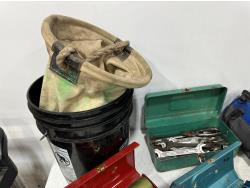 Eliminator intelligent battery charger, combination socket set, propane hoses, pipe wrenches, Dewalt drill, stapler
