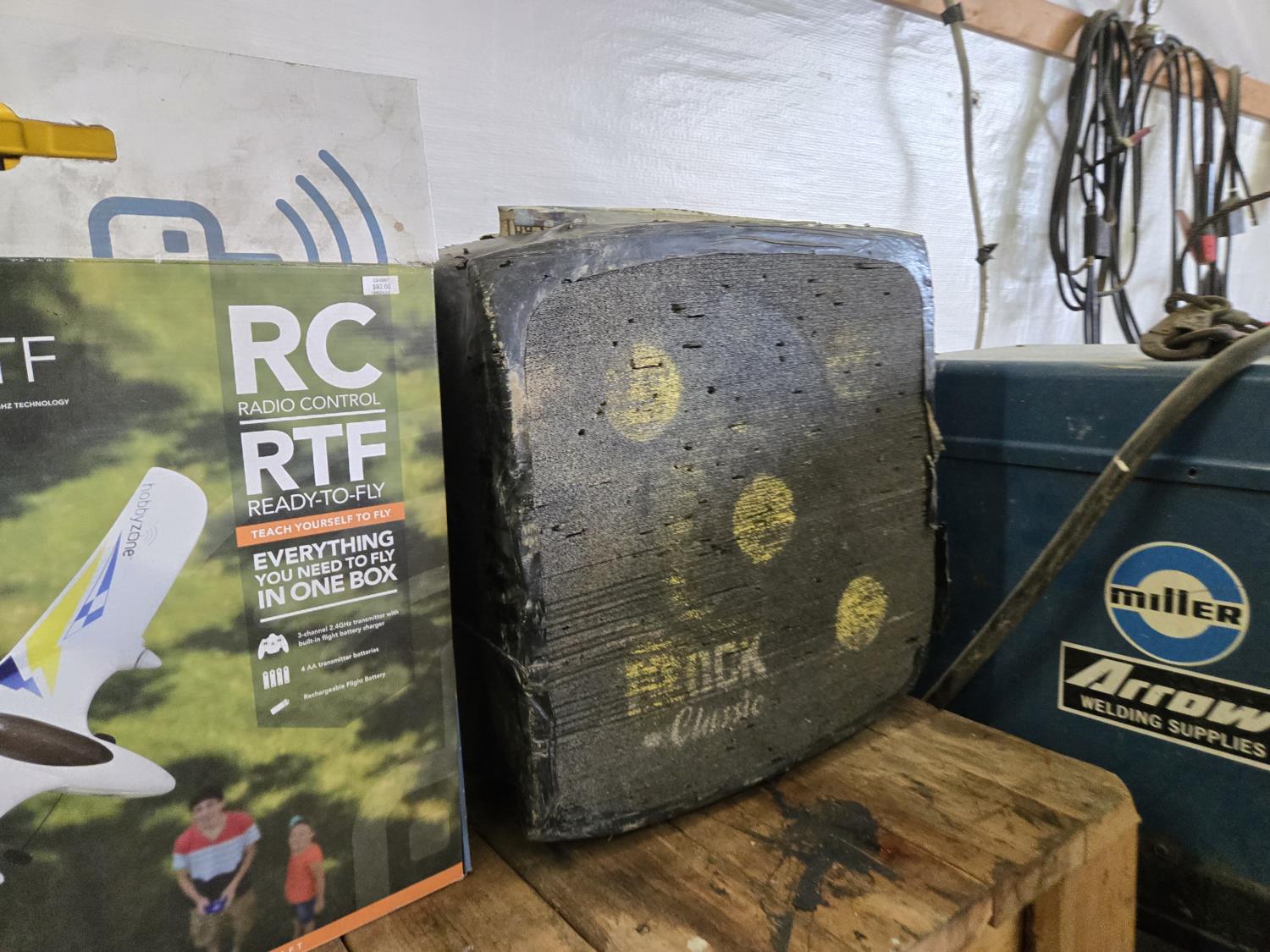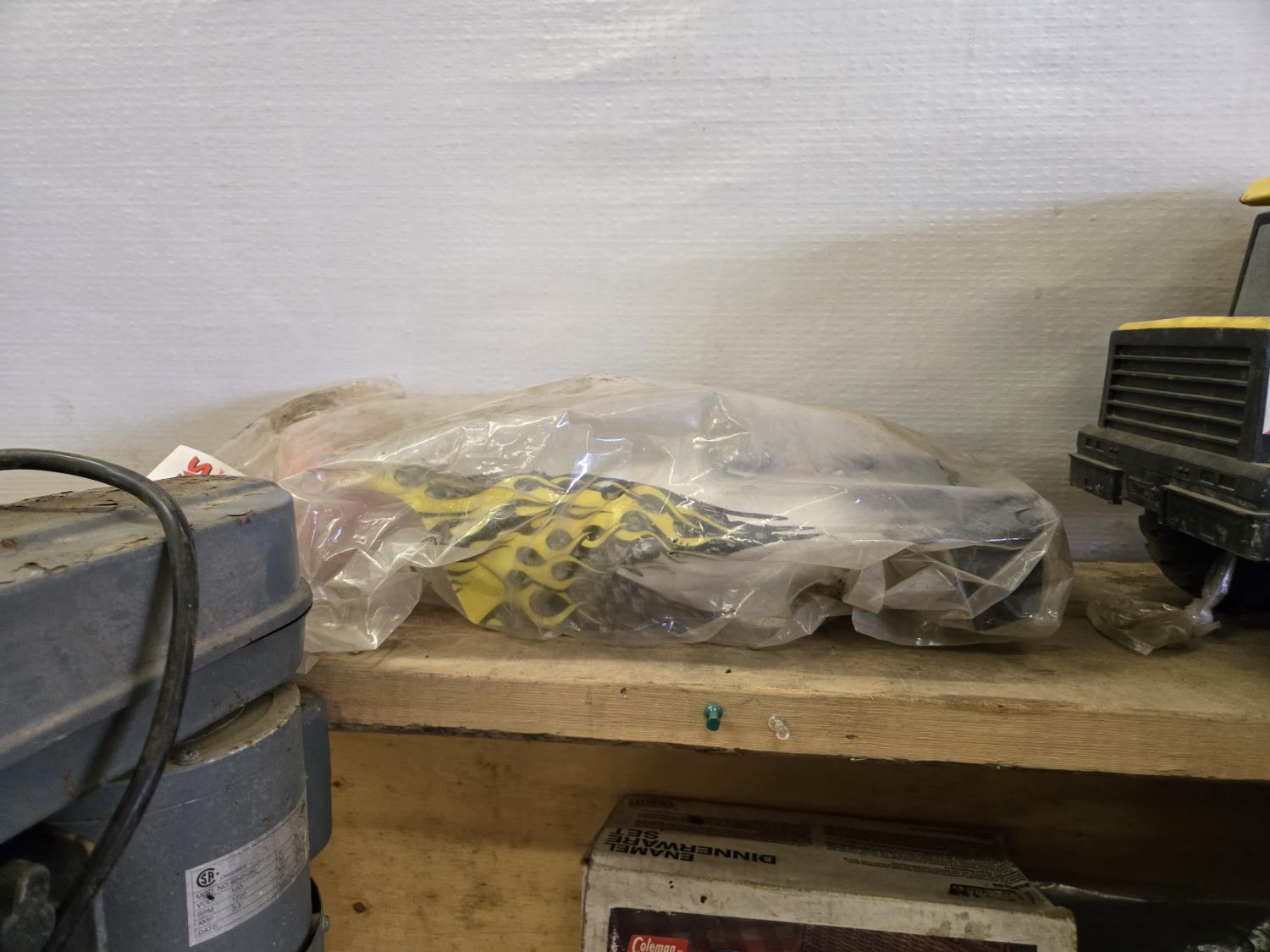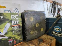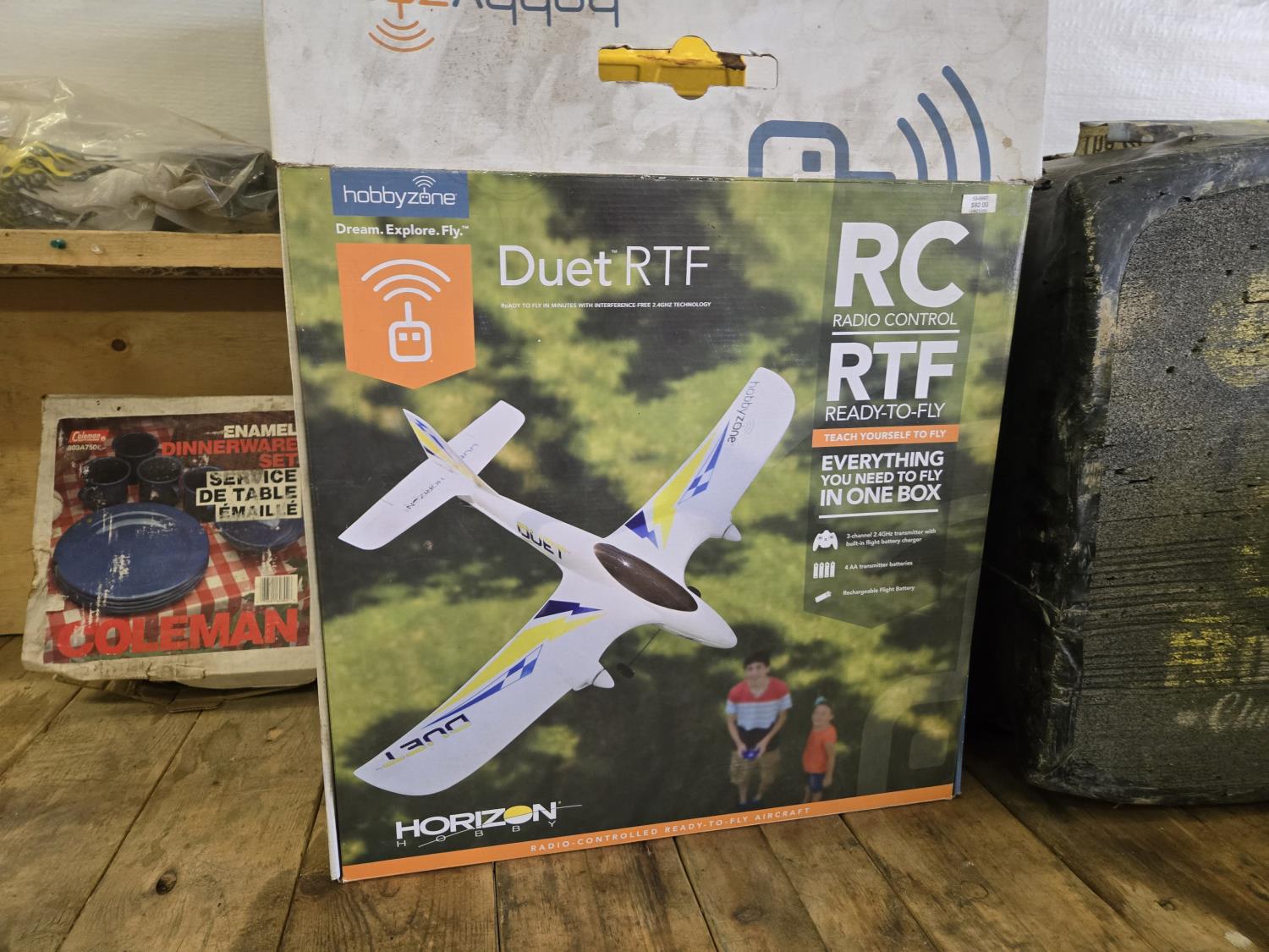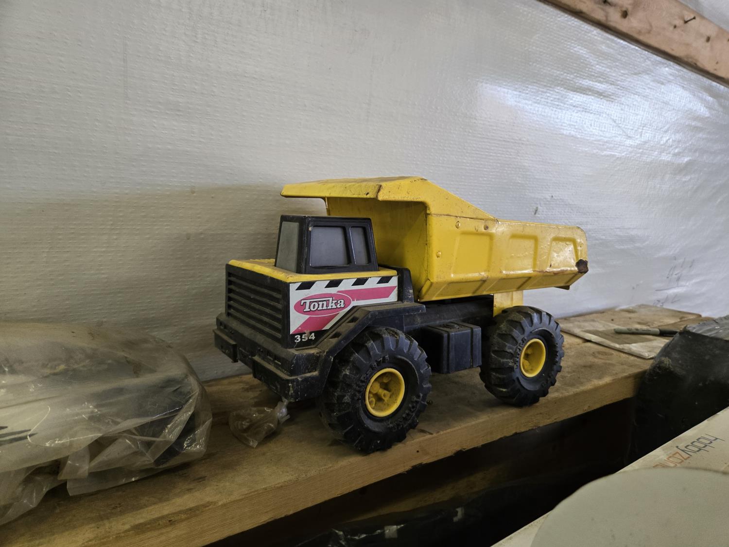 bench model drill press, Enamel dinner ware set, model plane, Tonka toy truck, archery target