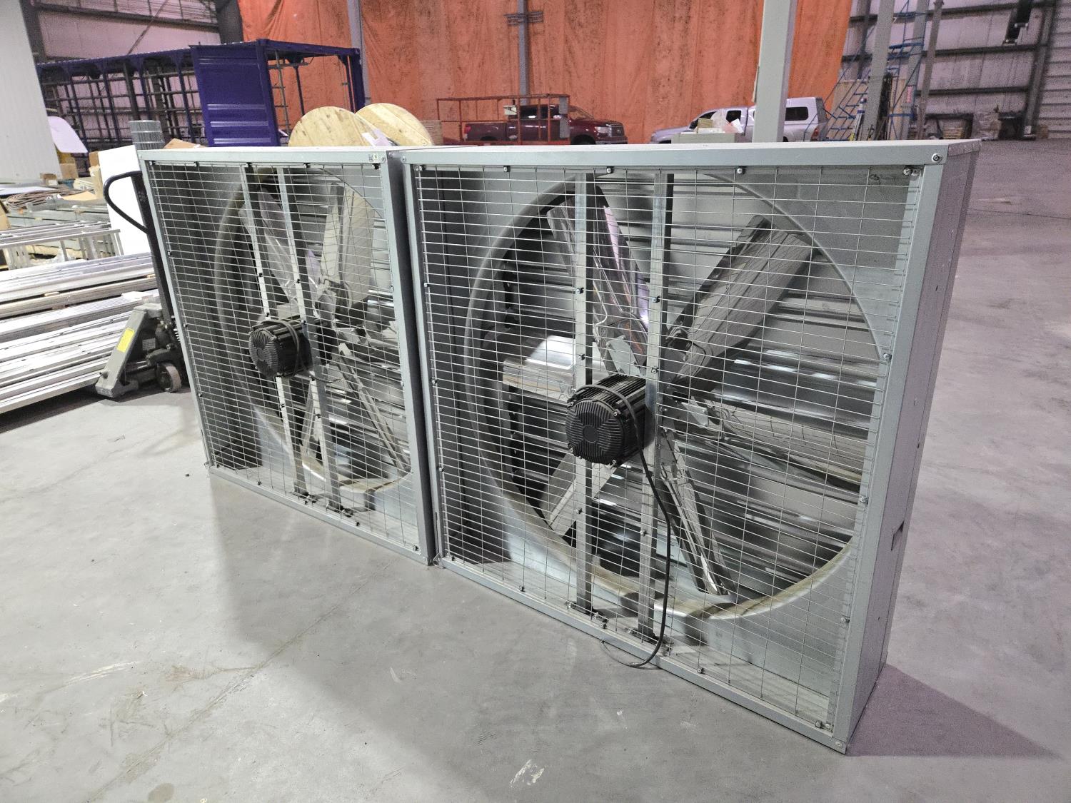 225 (2) Complete 48 Inch Fans with Housings, Wire Mesh Screens, Louvers & Motors (Unused)