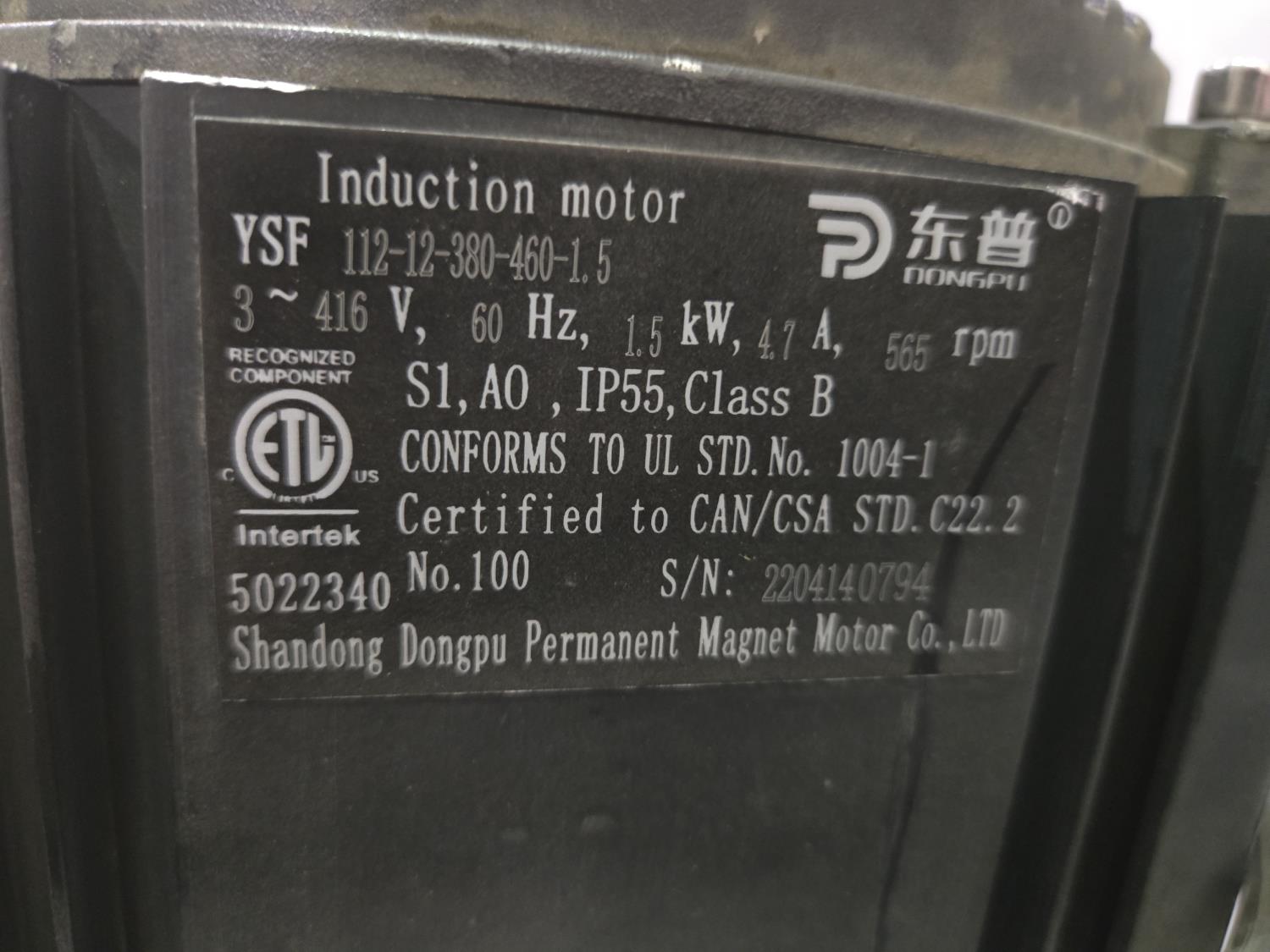 Frame dimensions 54-1/4 inch wide X 54-3/4" high, 416V, 3 phase, 60 Hz, 15 Kw & 47 Amp, 565 RPM