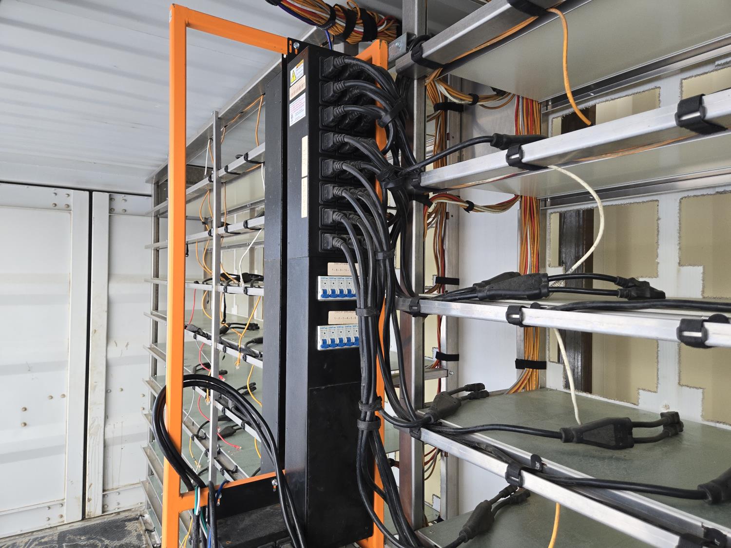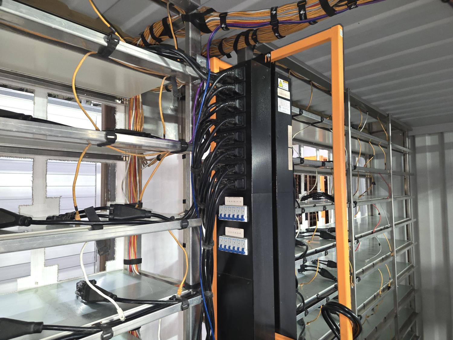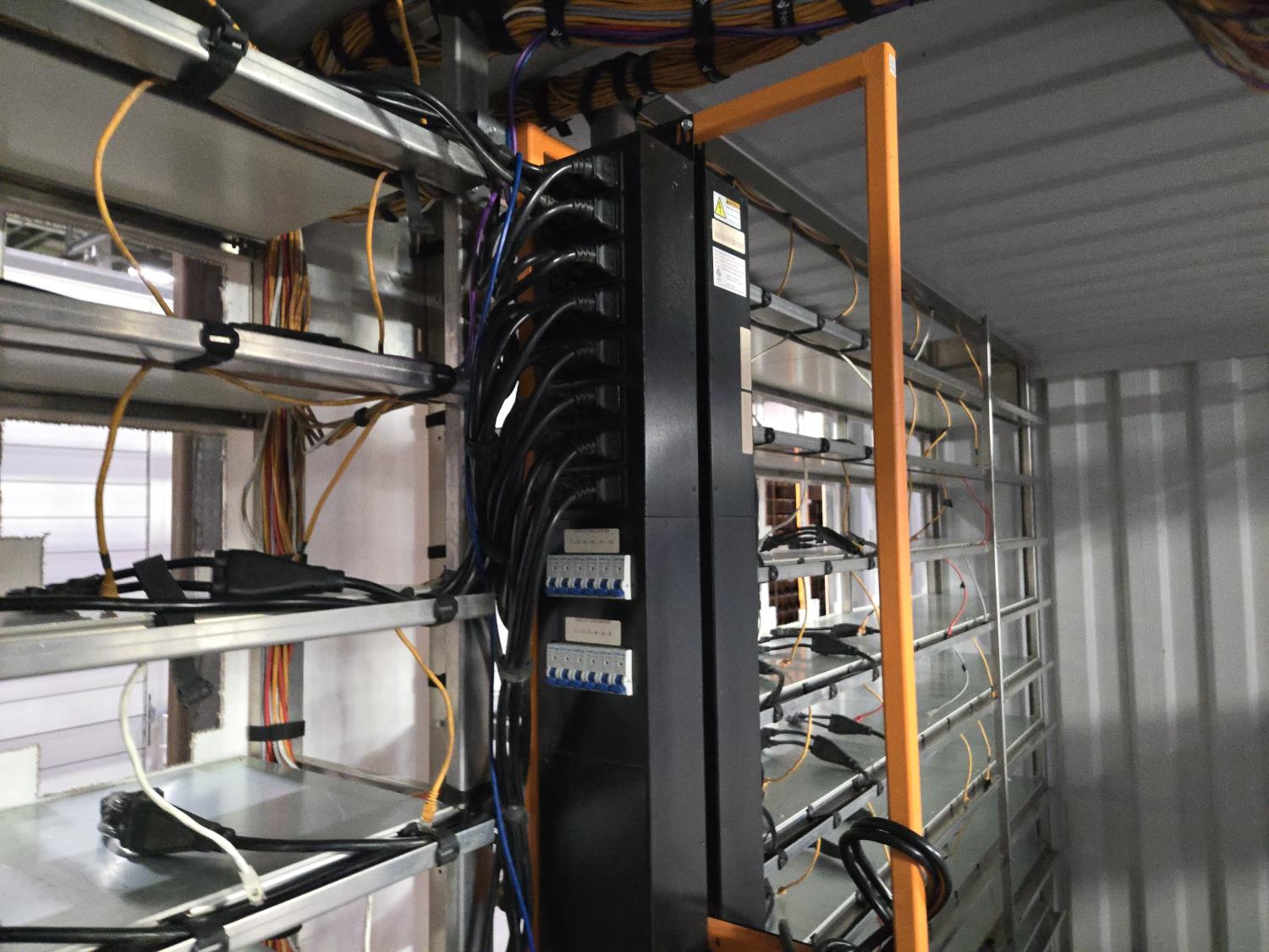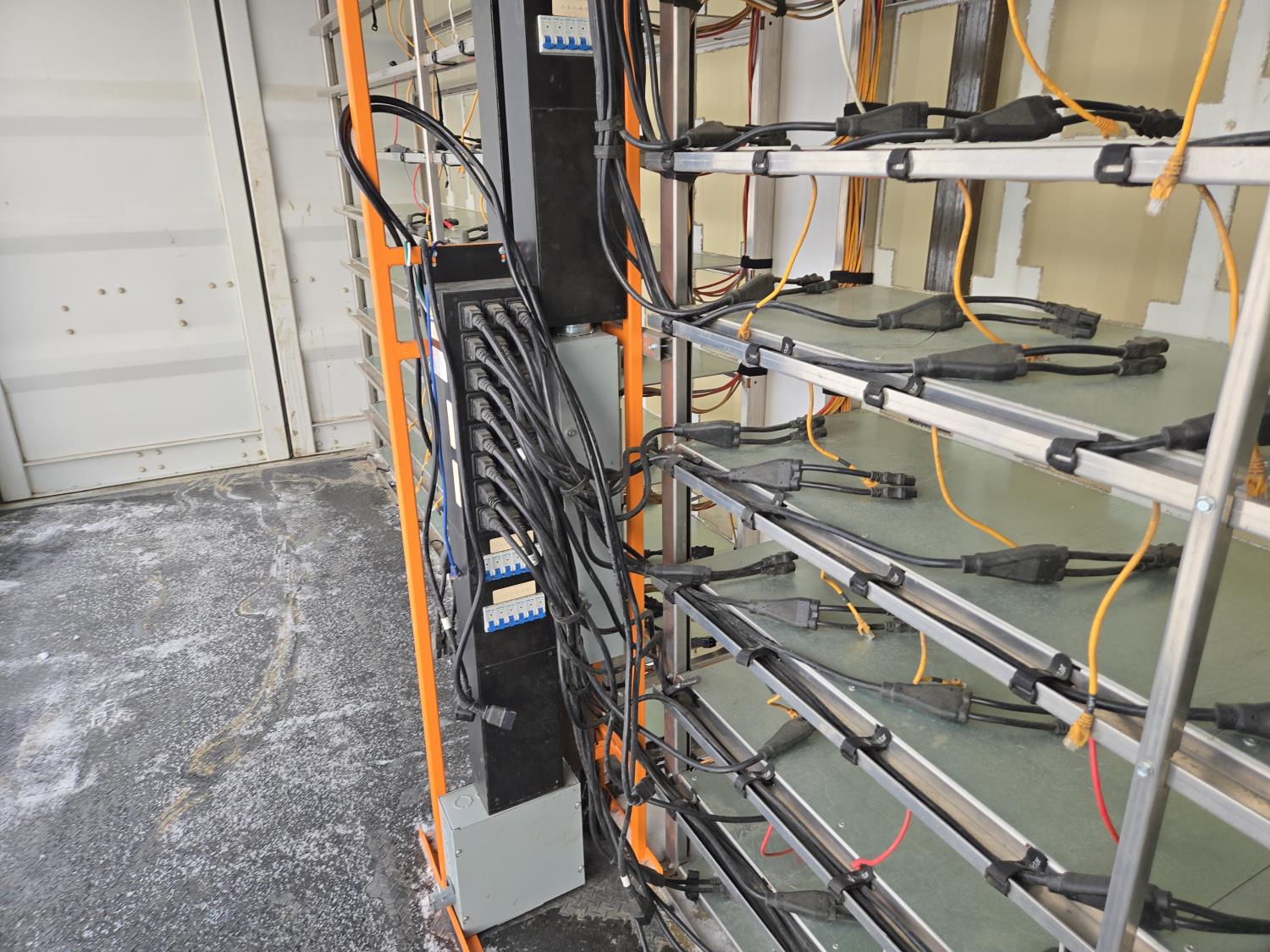 wired for 120 miners, shelving for 180 miners, (3) PDU's, Cisco 3750 switches, (3) motion actived LED lighting