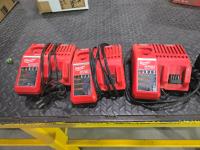 (3) Milwaukee M12/M18 chargers, (1) DeWalt 12V/20V charger