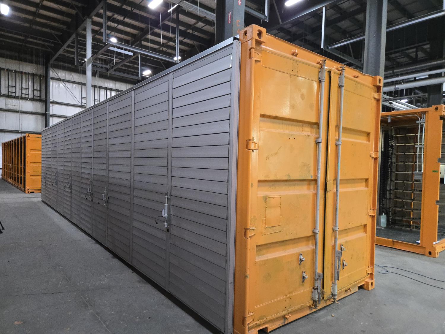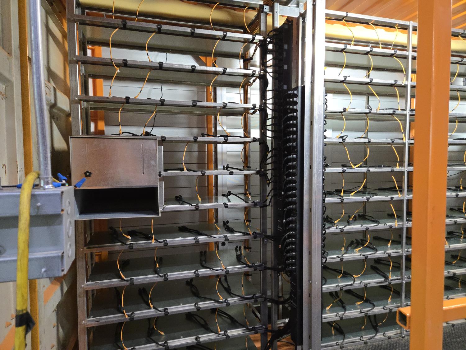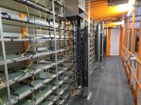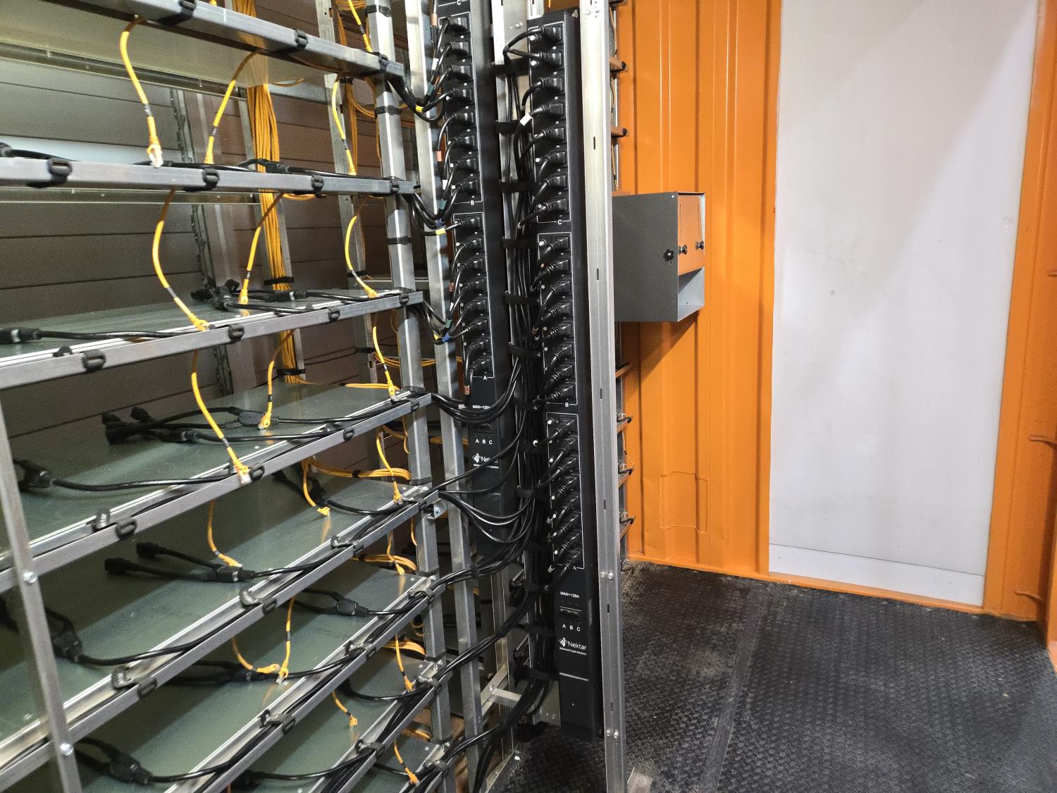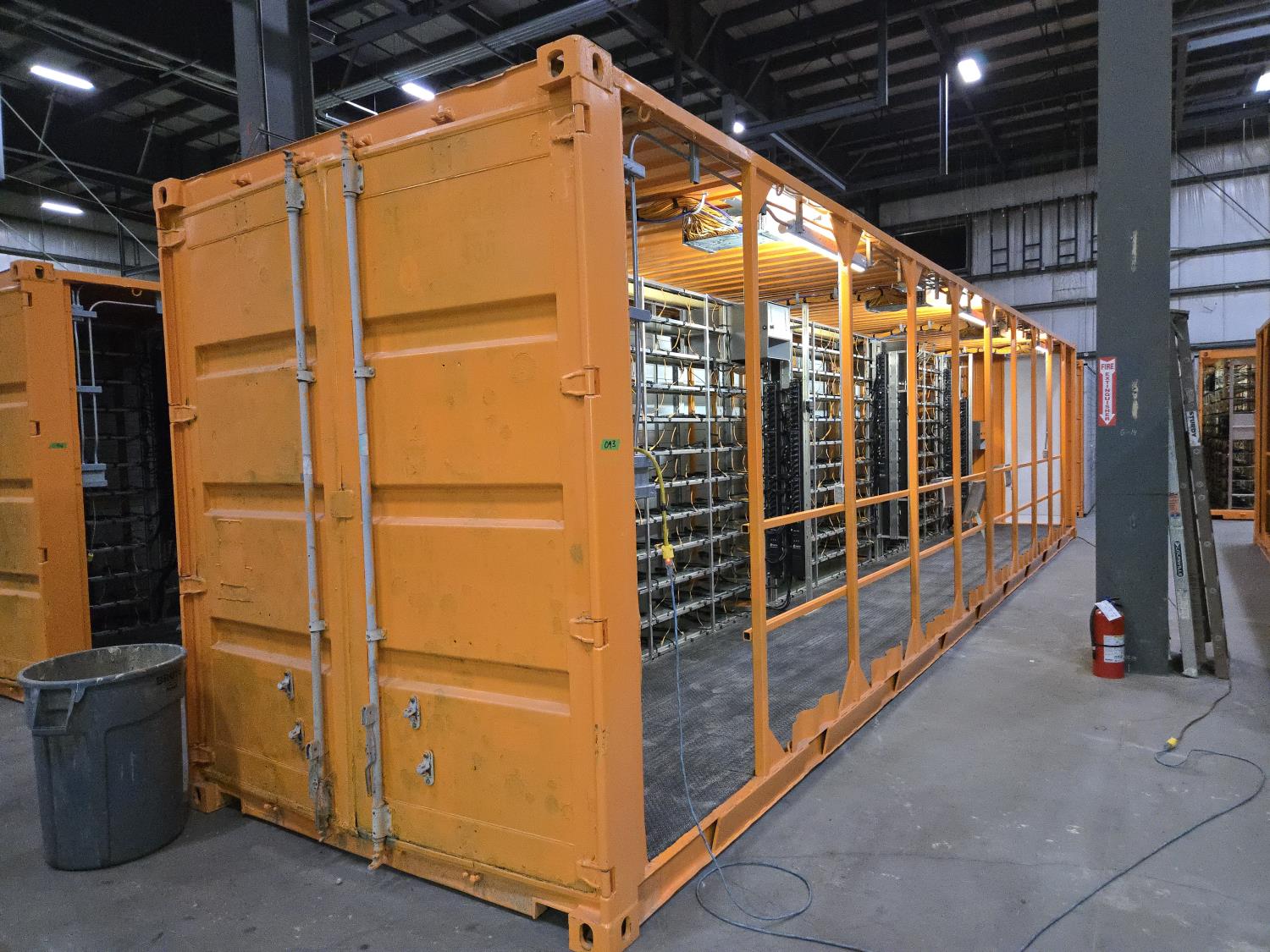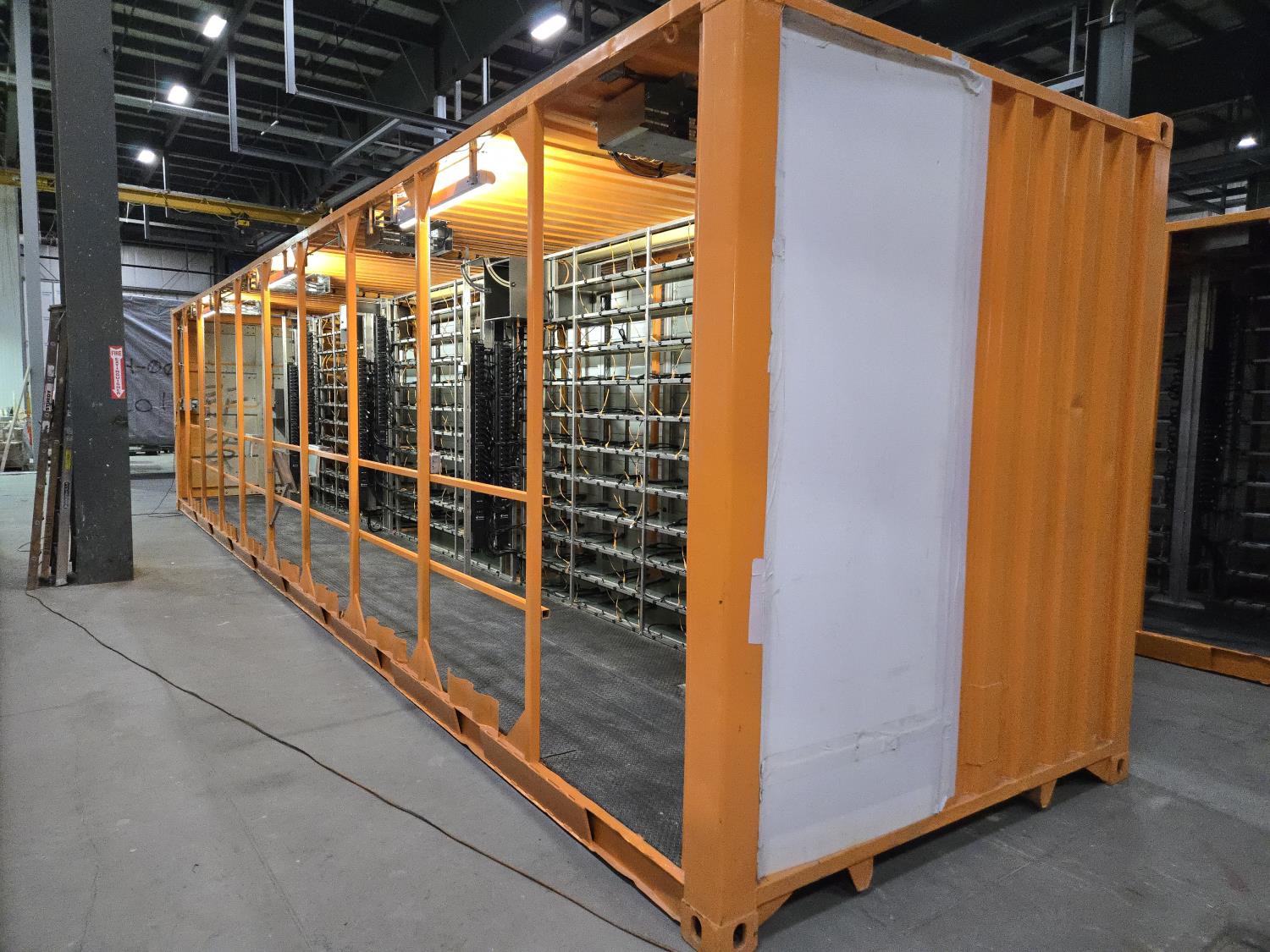 1.2 Mega watt, installed shelving for (360) miner locations, (15) PDU's with (24 ports and C19 outlets, 125 Amp, 3 phase, 240/415 volts, 3P beaker, individual overload protector for each outlet, 125A terminal box and input cable from bottom), (360) C19 to C20 cables, (360) Cat 5E ethernet cables, (8) Cisco 3750 switches, 48 ports, (6) 24 volt DC 12.5 amp motorized louvers, (4) Infinity airlift warm air recirculation fans 100-240 volt AC and 100W max, rubber grip flooring, laptop table, miner blank guards, (5) 204 volt duplex receptacle plugs, (3) 120 volt motion activated overhead LED lights, 9 ft 6 inch high, reinforced to allow stacking, Paint specs: sand blasted prior to painting, Cloverdale A35 Armourshield urethane paint with (2) heavy coats of paint direct to metal 3- 5 mil thick