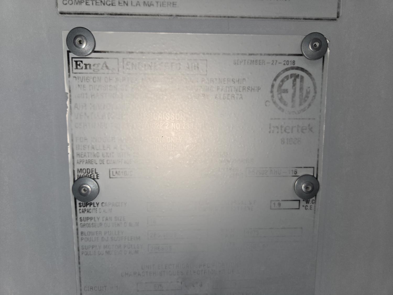 663 2018 EngA Engineered AIR LM10/C Air Handling Unit (Unused)