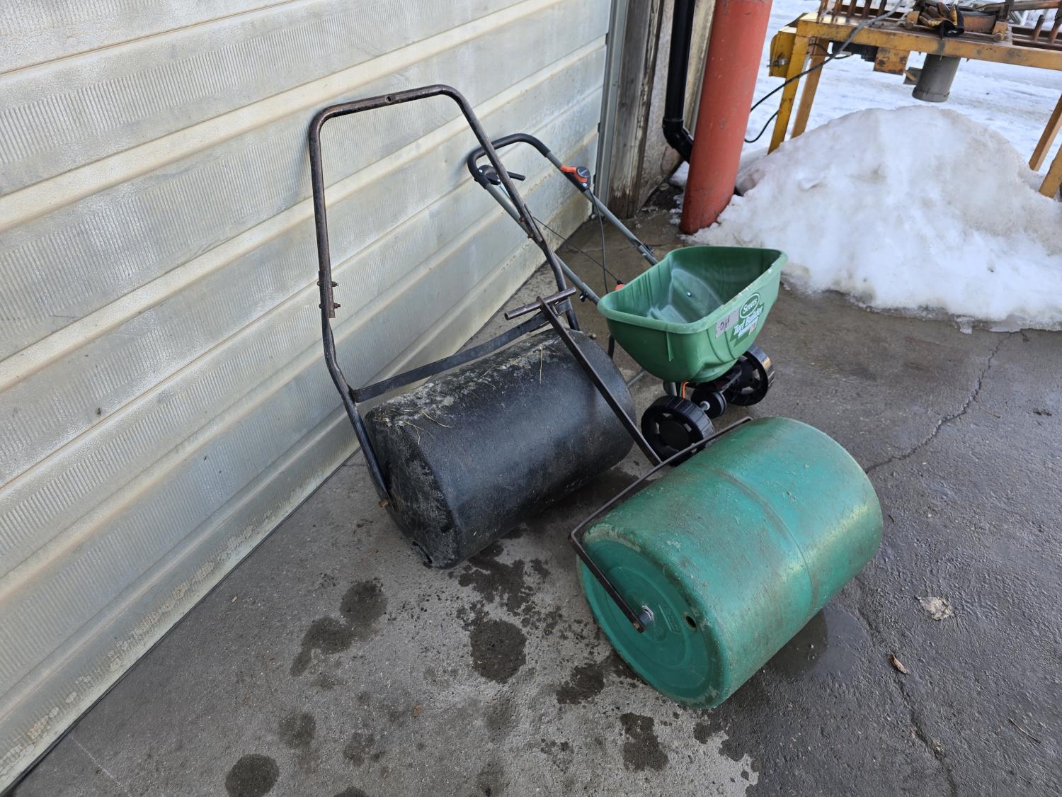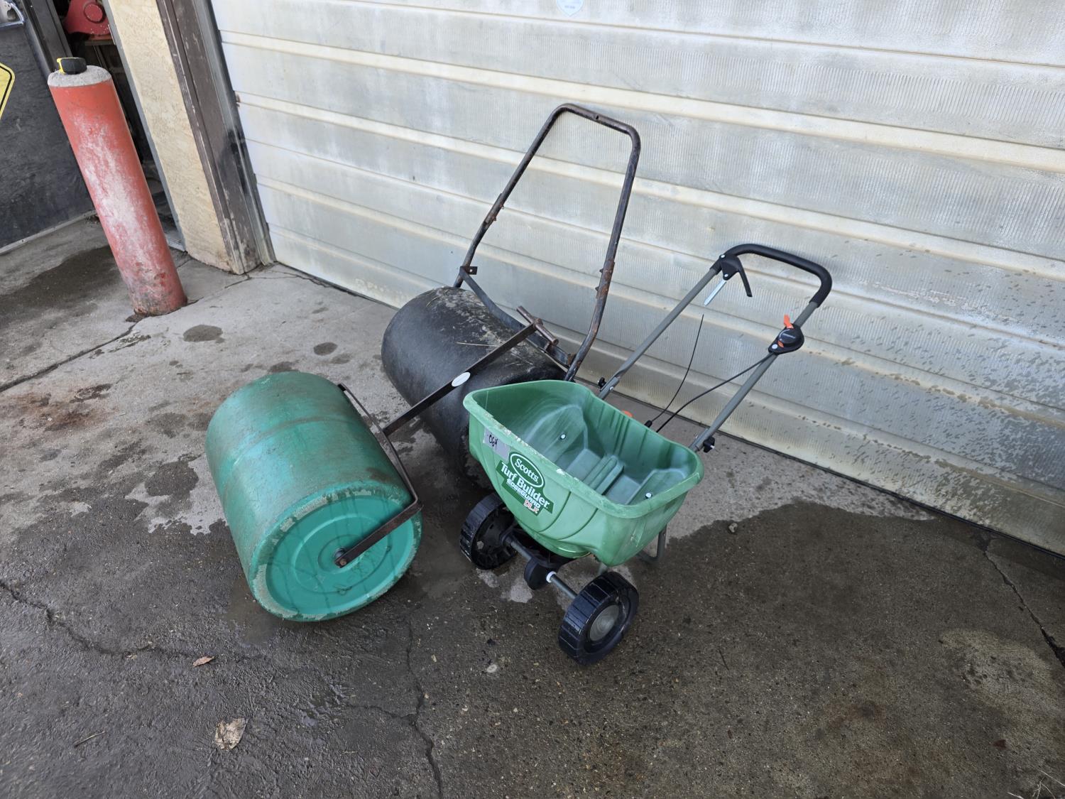 (1) 23 inch W lawn roller, (1) 24 inch W lawn roller, Scotts DLX Turf Builder broadcast spreader
