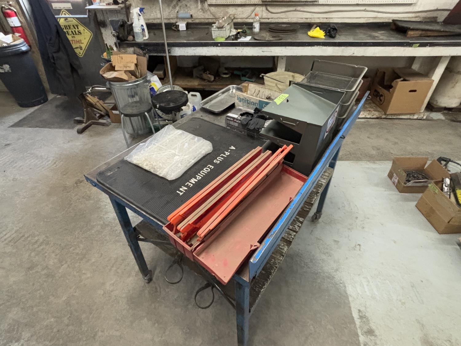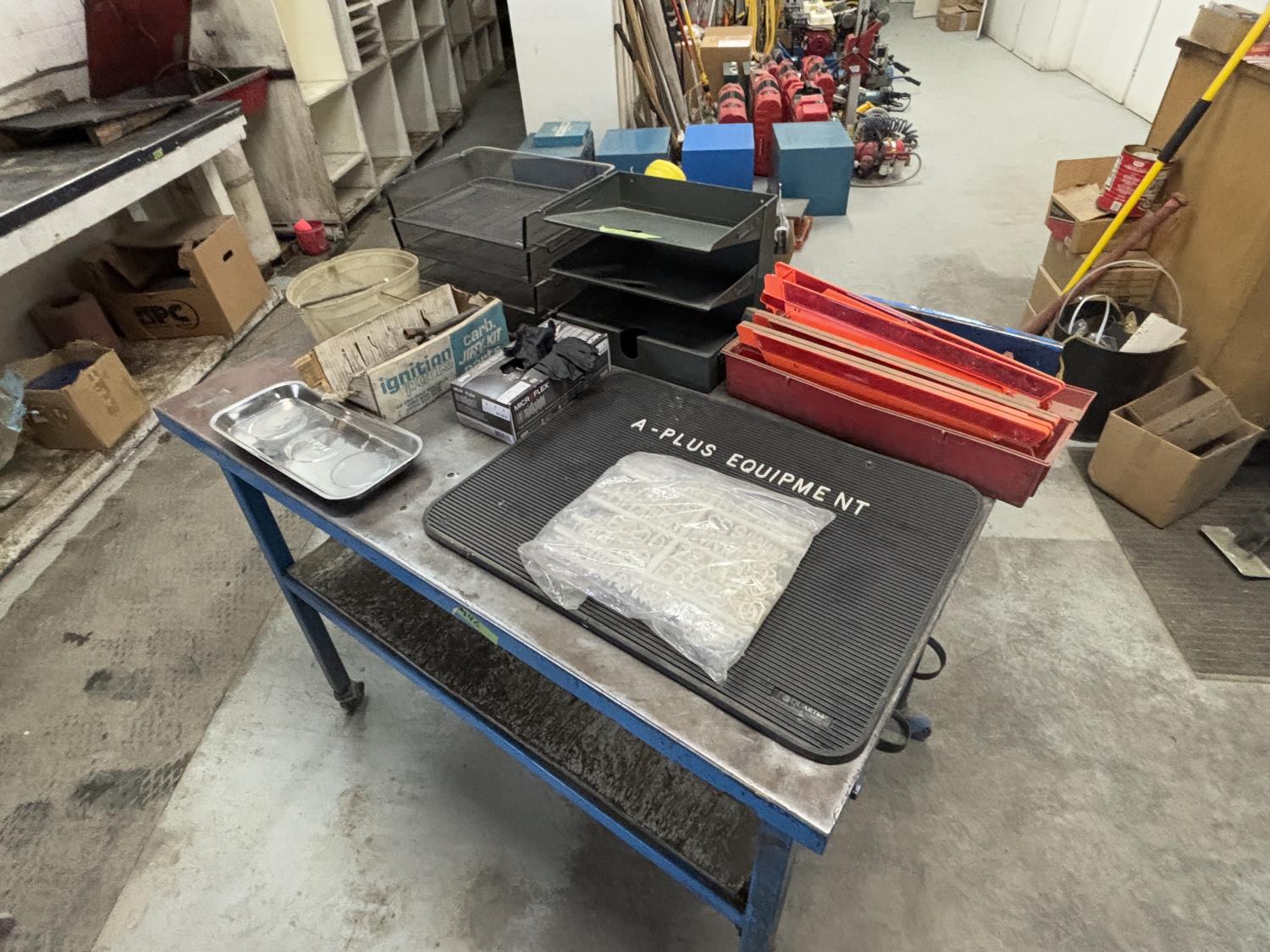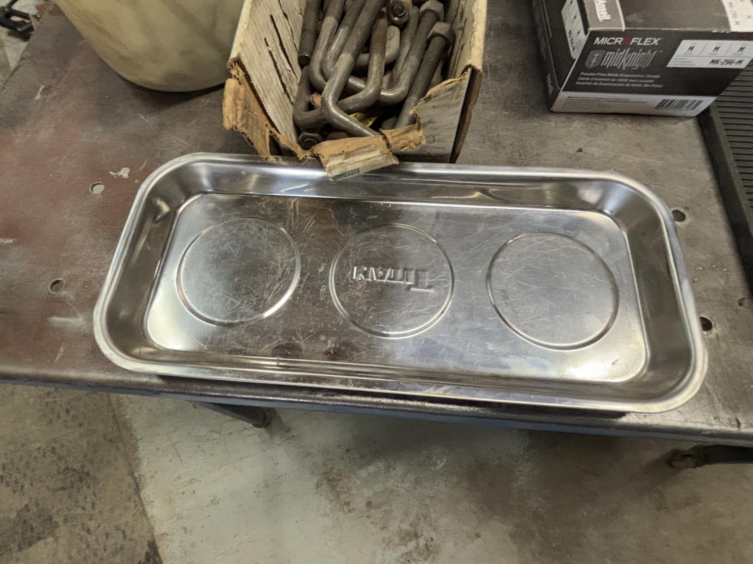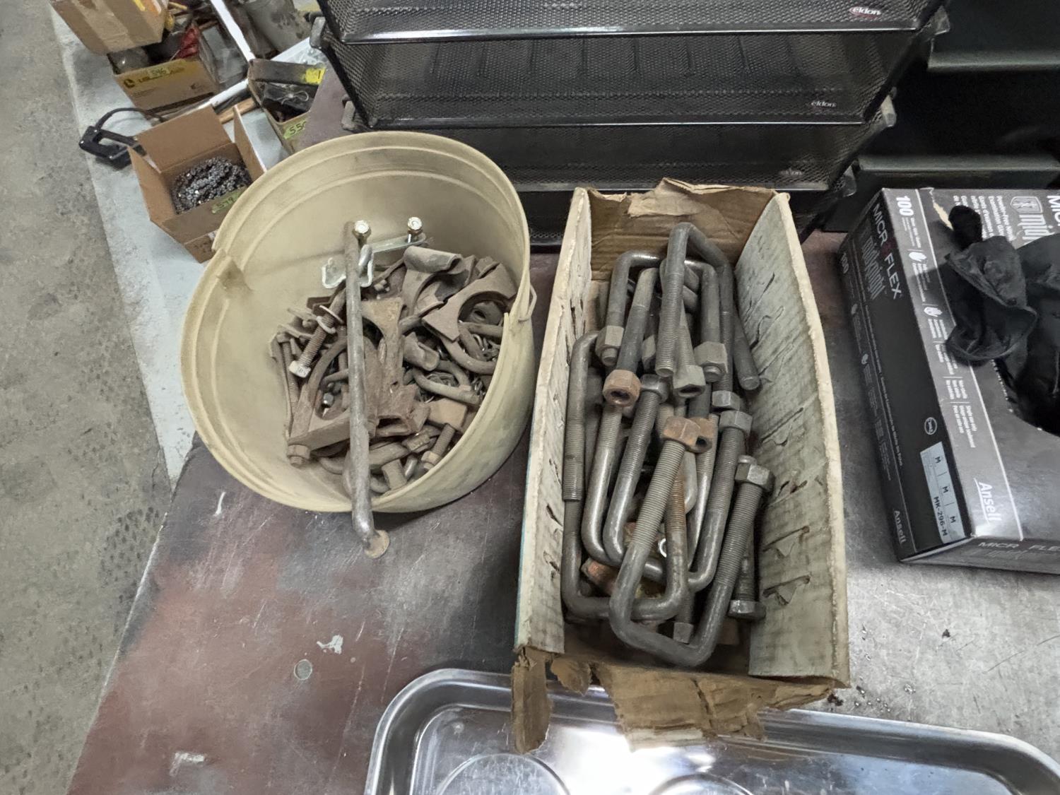 muffler clamps, u bolts, rubber gloves, magnetic tray, document trays, sign with letters and numbers, safety triangles