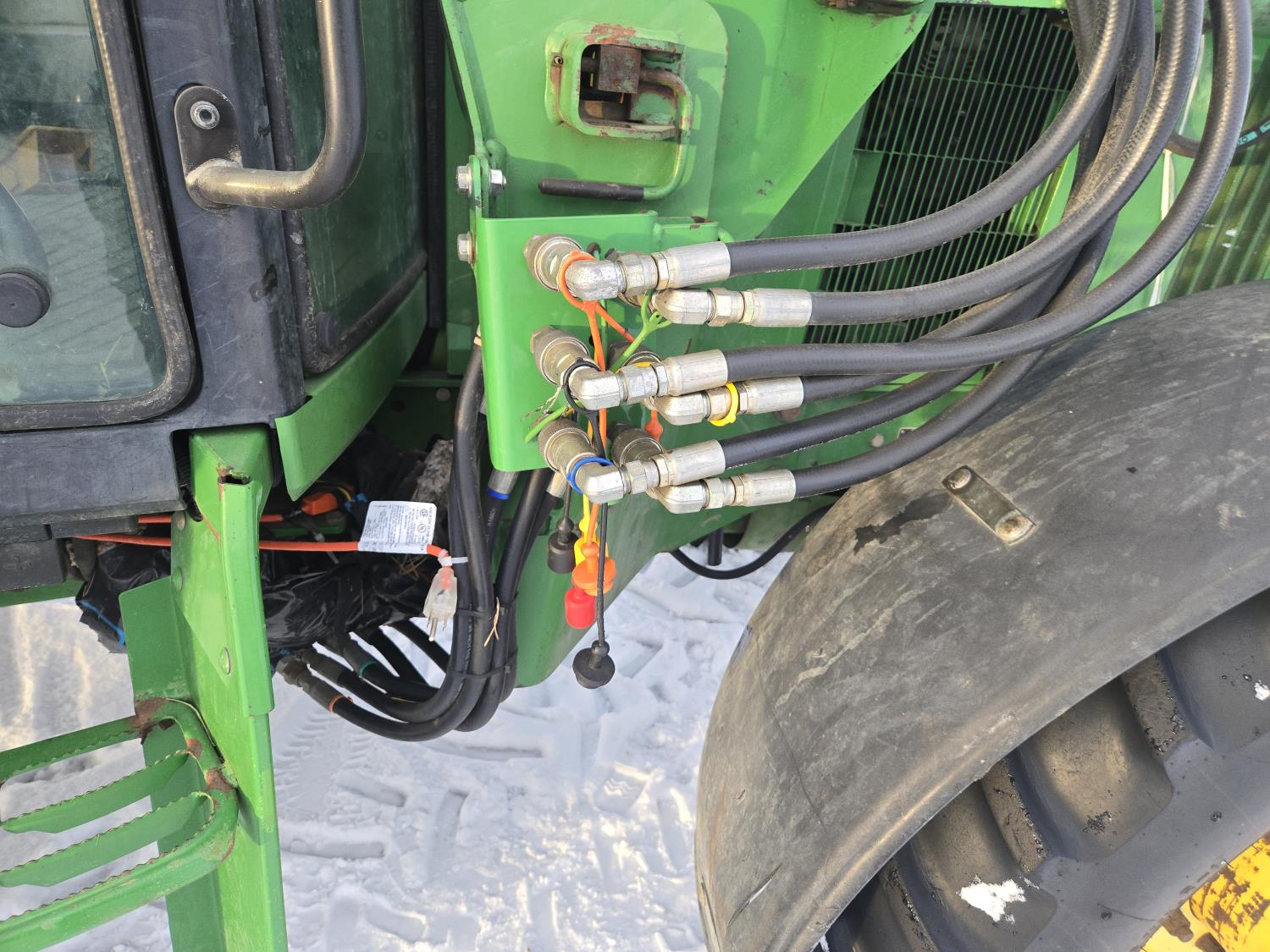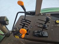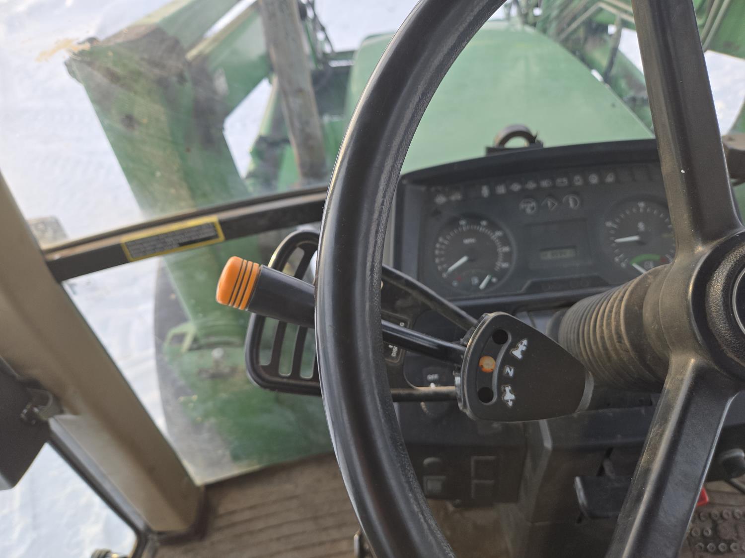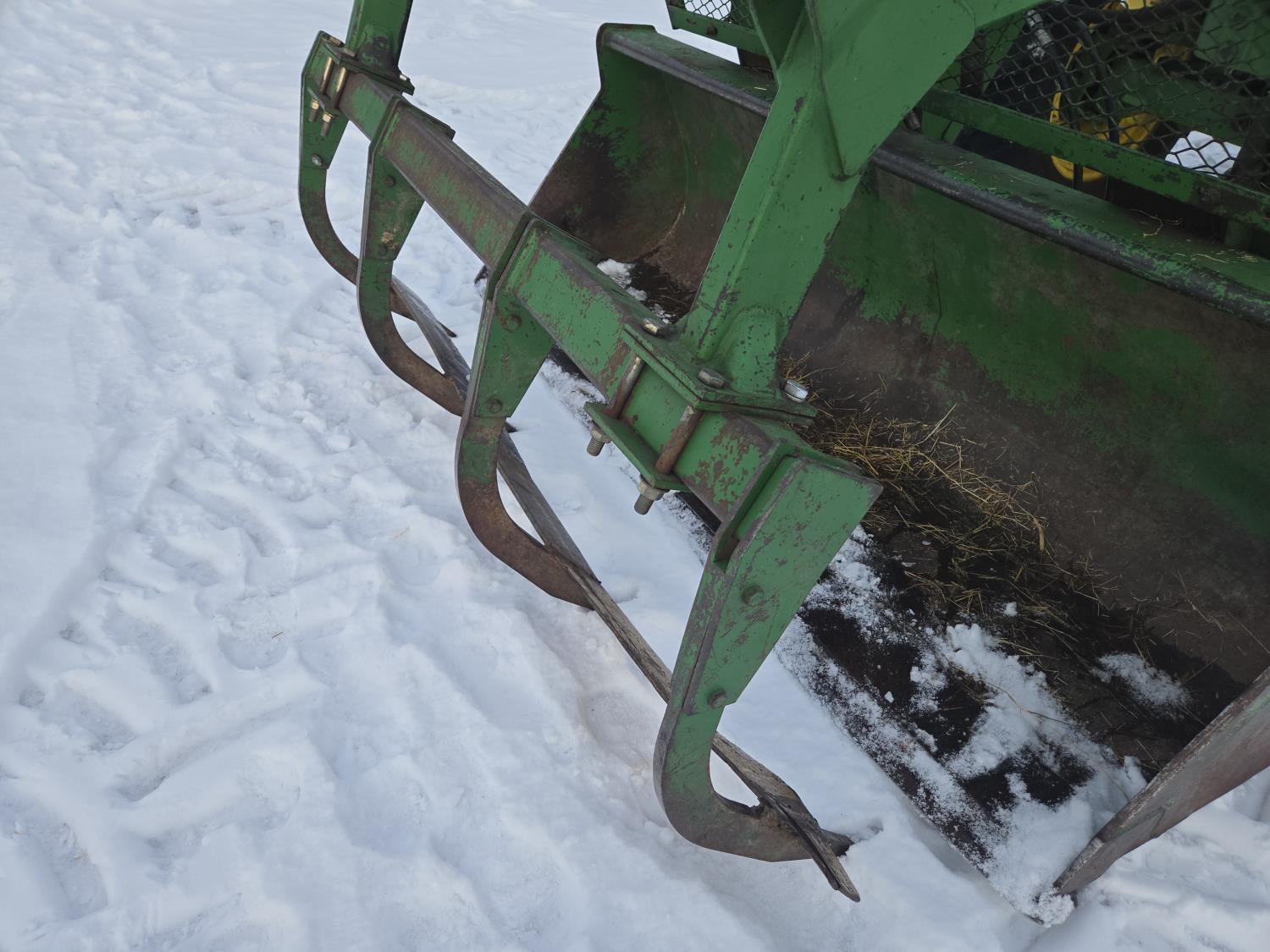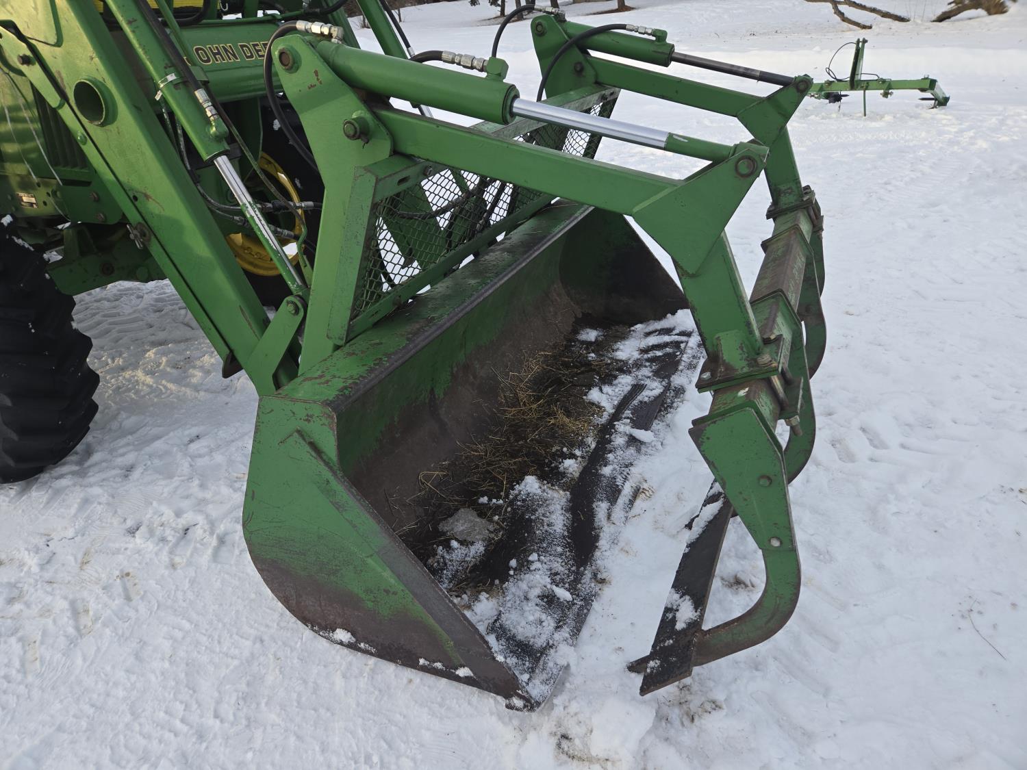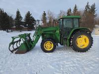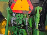 John Deere 640 loader, Q/A, 84 inch bucket, grapple, mid mount hydraulic connection, John Deere 4.5 L 4 cylinder 106 HP, diesel engine, 90 PTO HP, 16 speed partial power shift transmission, cab, left hand reverser, rear differential lock, joystick, A/C, buddy seat, 540/1000 PTO, 3 point hitch, 2 rear hydraulic outlets, 12.4-24 front tires, 18.4-34 rear tires