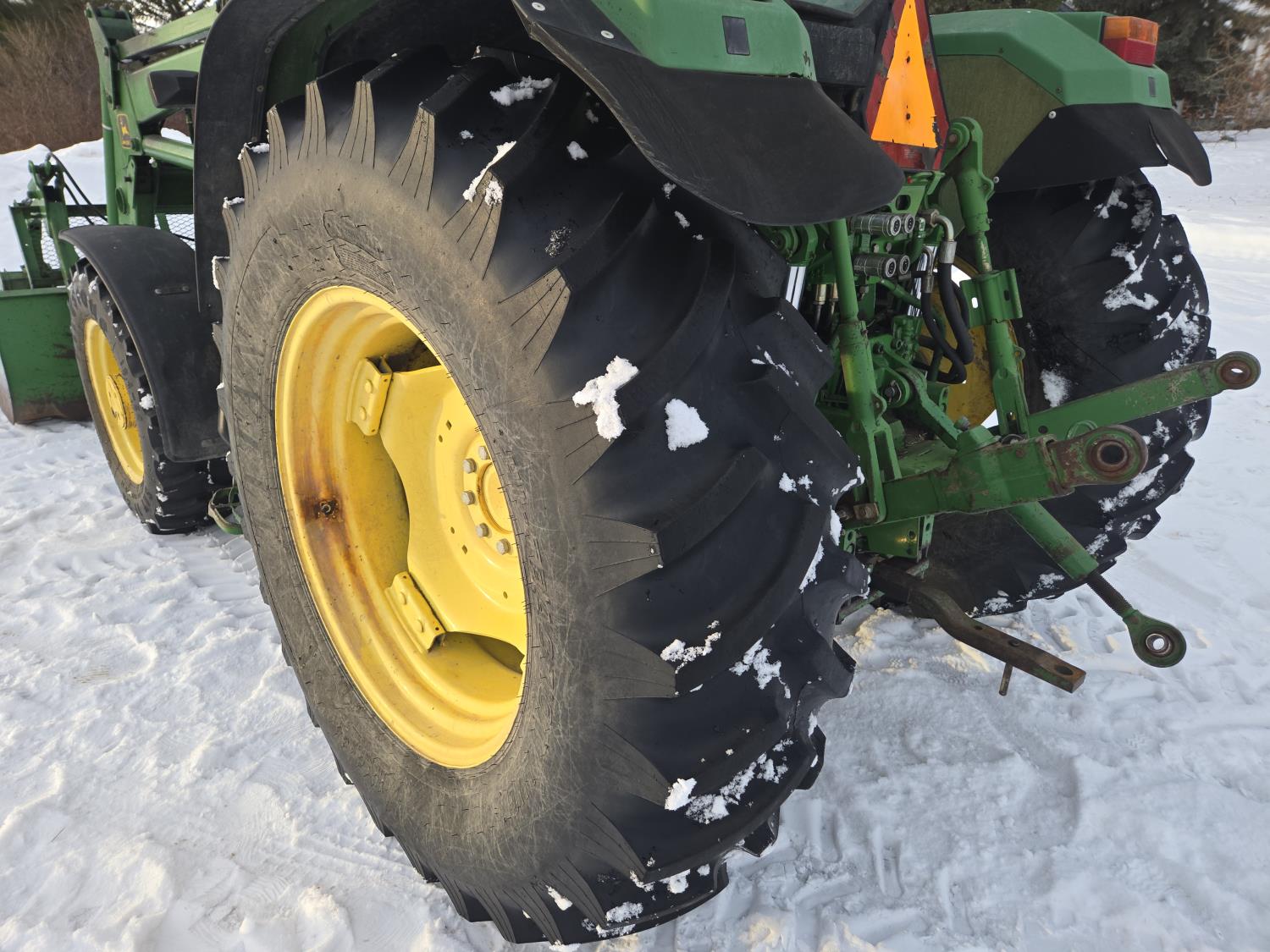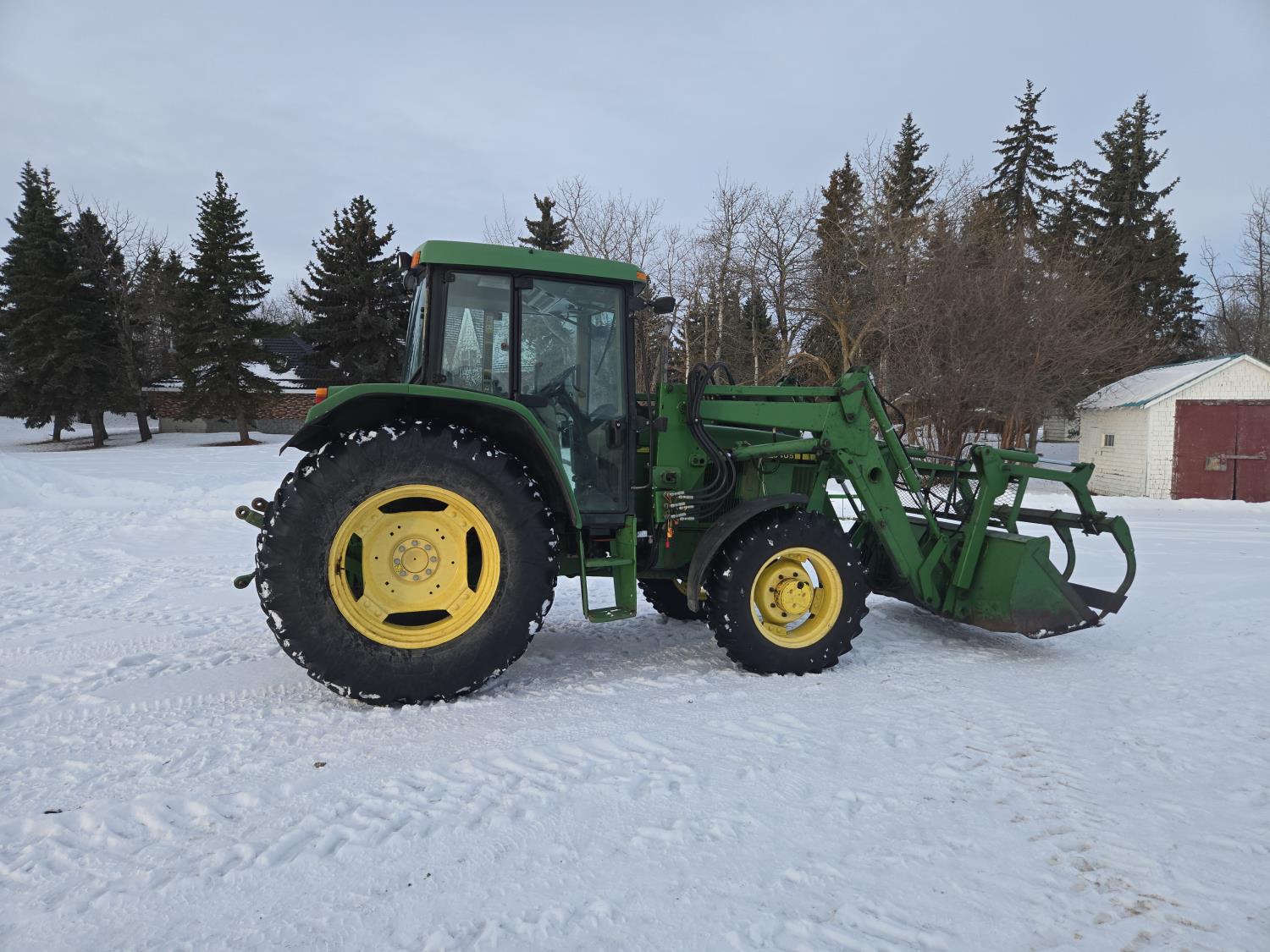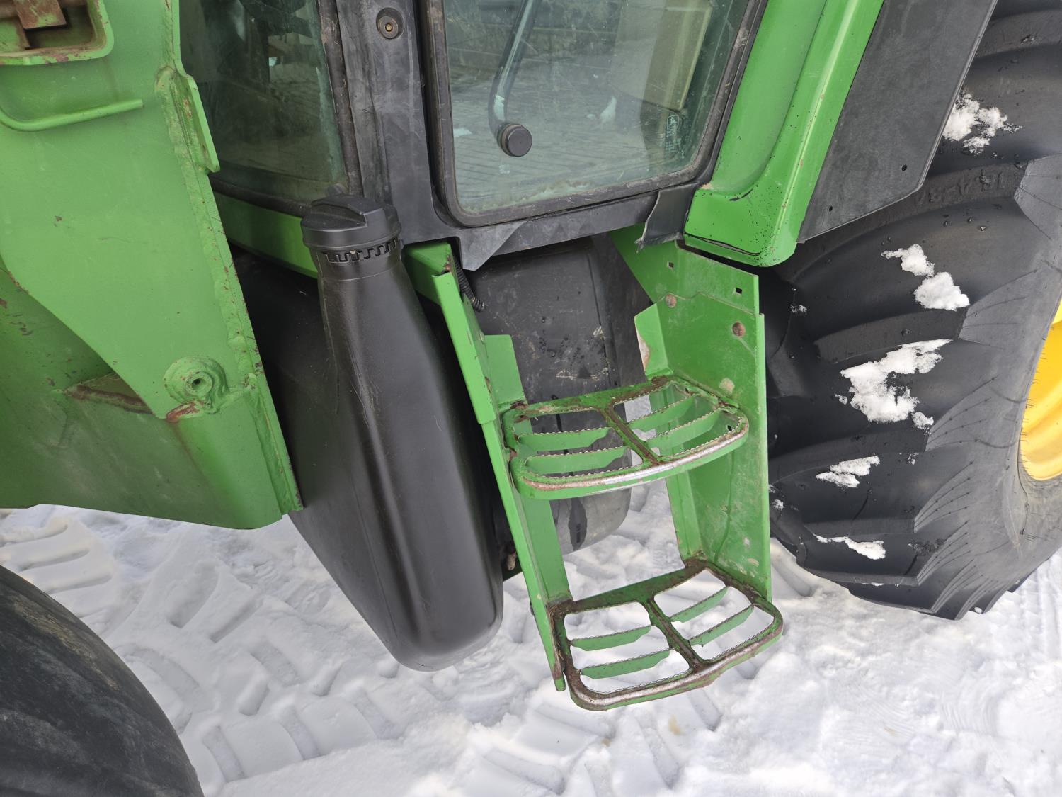John Deere 640 loader, Q/A, 84 inch bucket, grapple, mid mount hydraulic connection, John Deere 4.5 L 4 cylinder 106 HP, diesel engine, 90 PTO HP, 16 speed partial power shift transmission, cab, left hand reverser, rear differential lock, joystick, A/C, buddy seat, 540/1000 PTO, 3 point hitch, 2 rear hydraulic outlets, 12.4-24 front tires, 18.4-34 rear tires