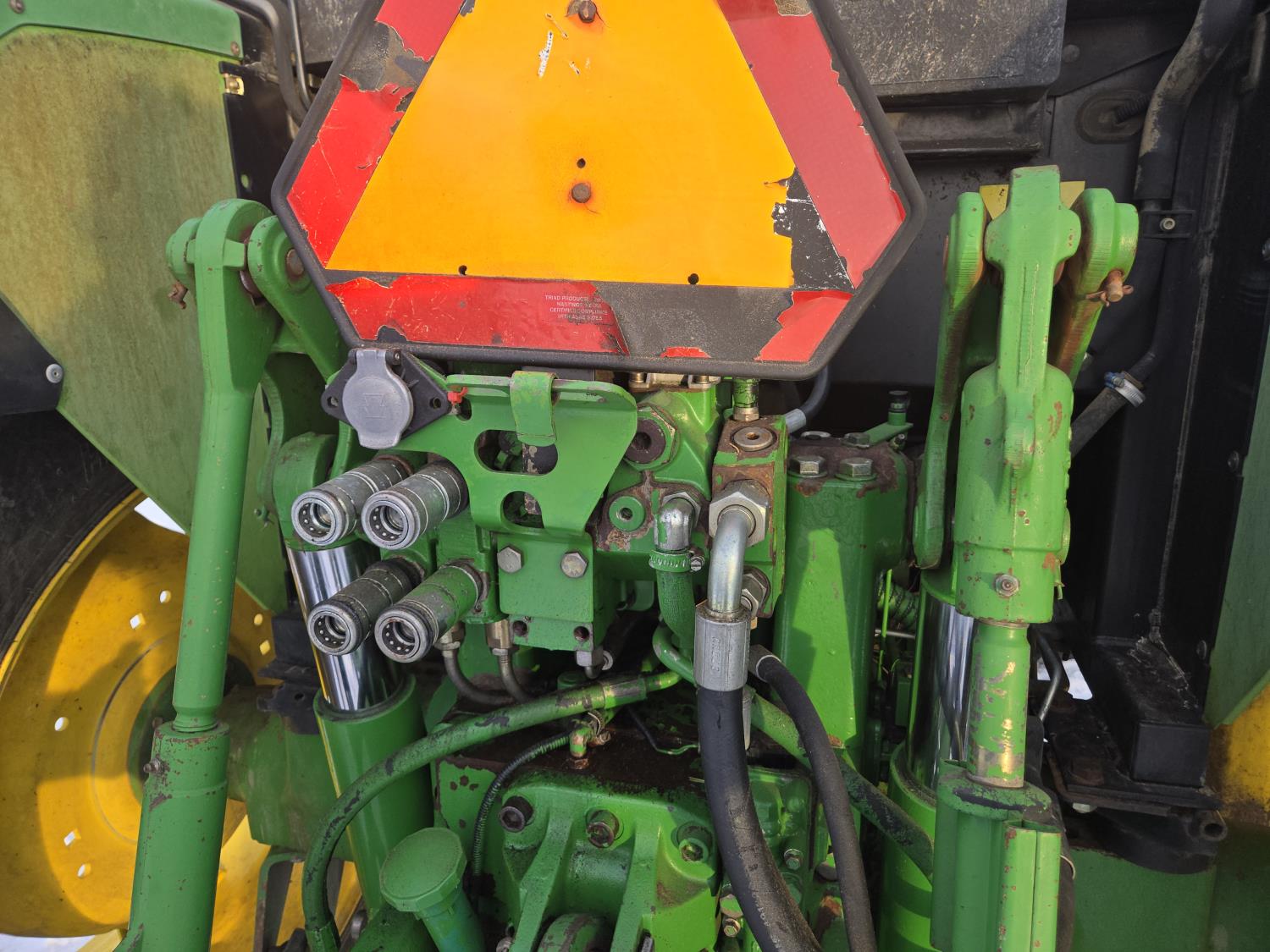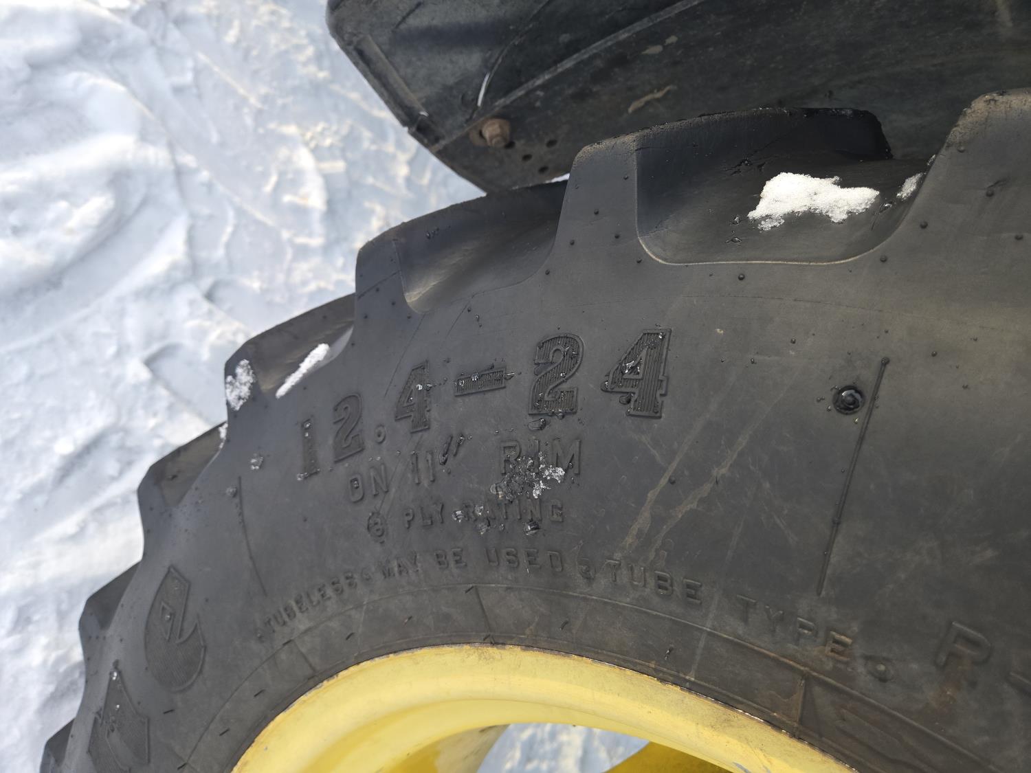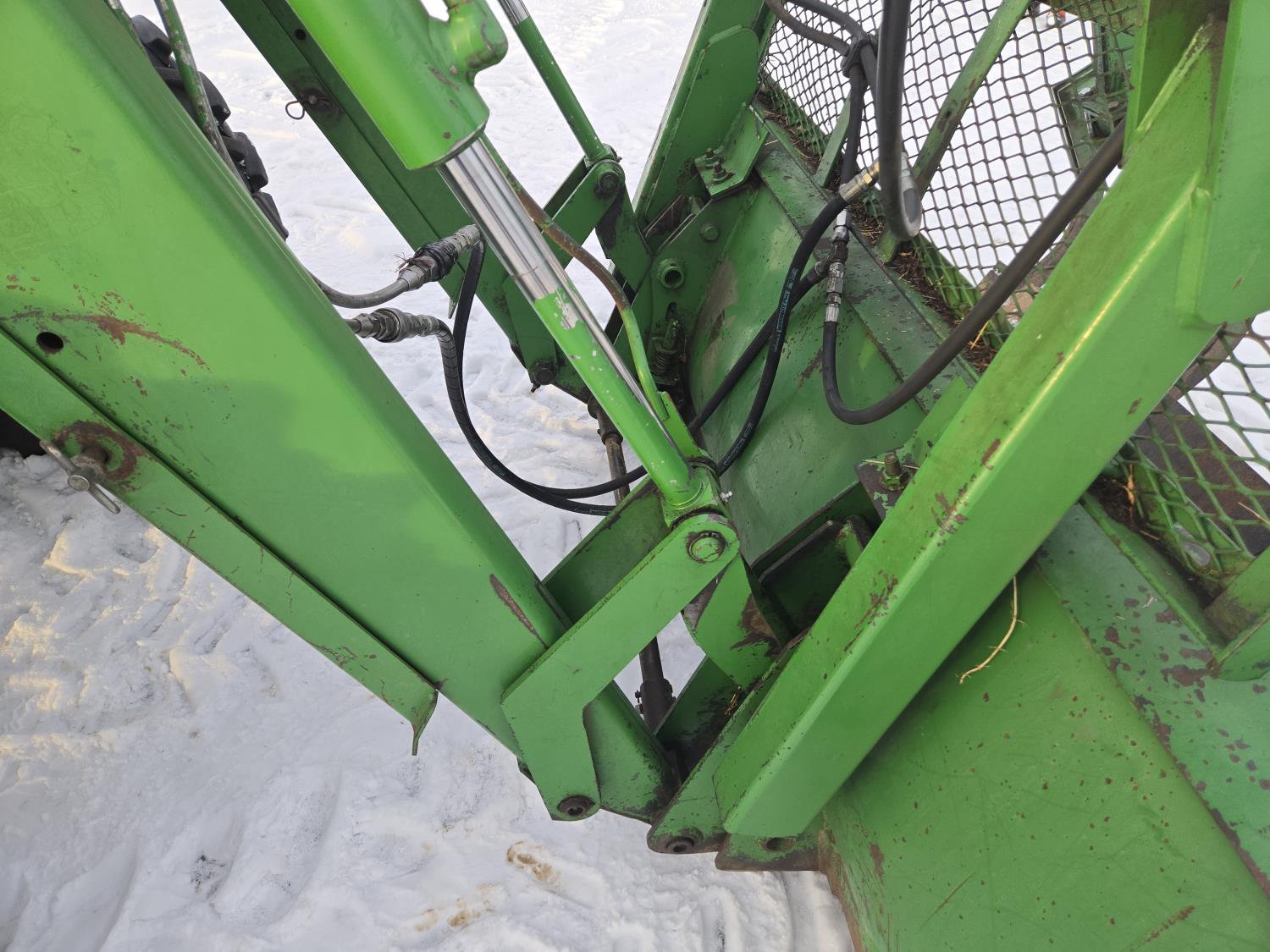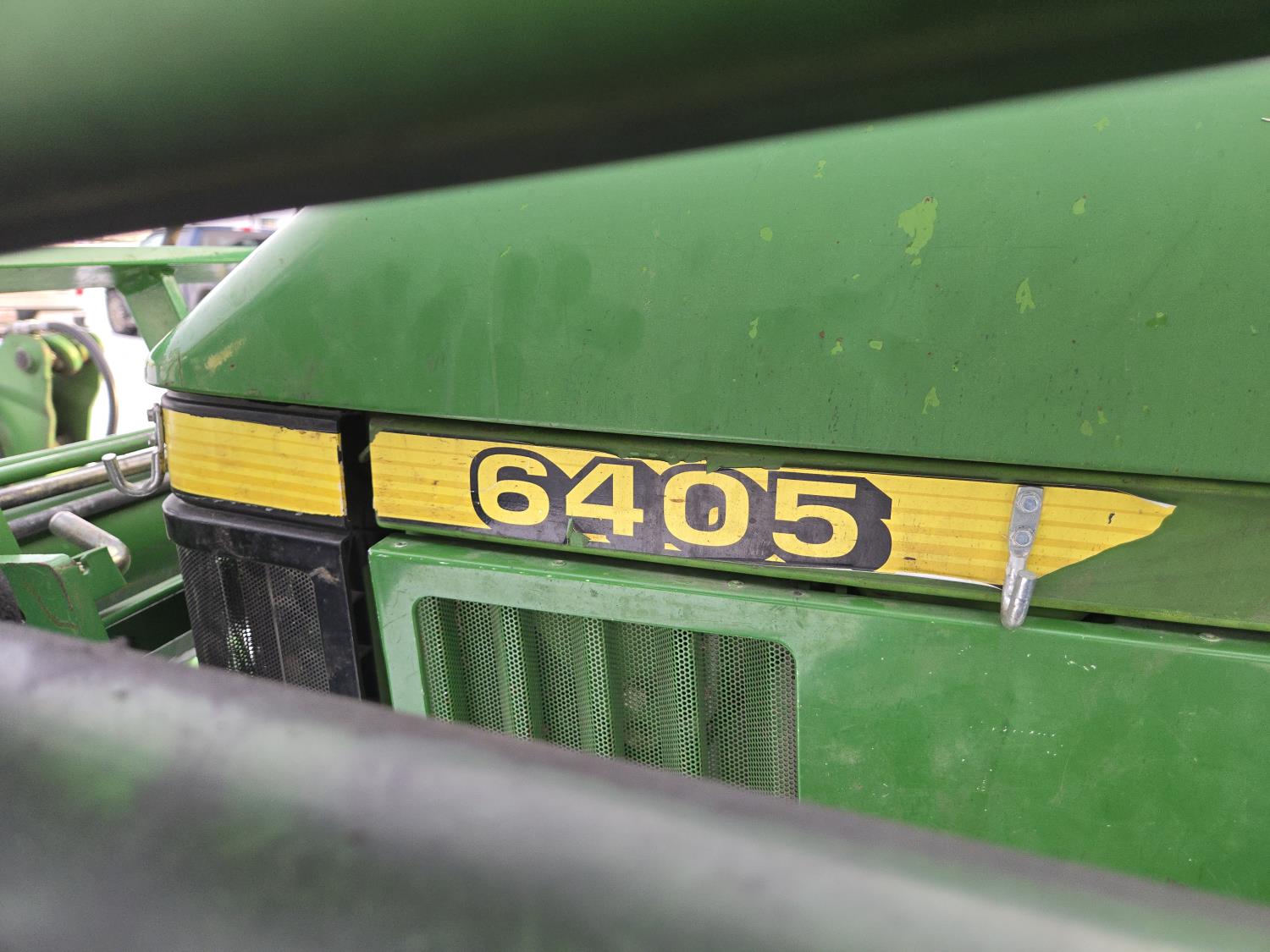 John Deere 640 loader, Q/A, 84 inch bucket, grapple, mid mount hydraulic connection, John Deere 4.5 L 4 cylinder 106 HP, diesel engine, 90 PTO HP, 16 speed partial power shift transmission, cab, left hand reverser, rear differential lock, joystick, A/C, buddy seat, 540/1000 PTO, 3 point hitch, 2 rear hydraulic outlets, 12.4-24 front tires, 18.4-34 rear tires