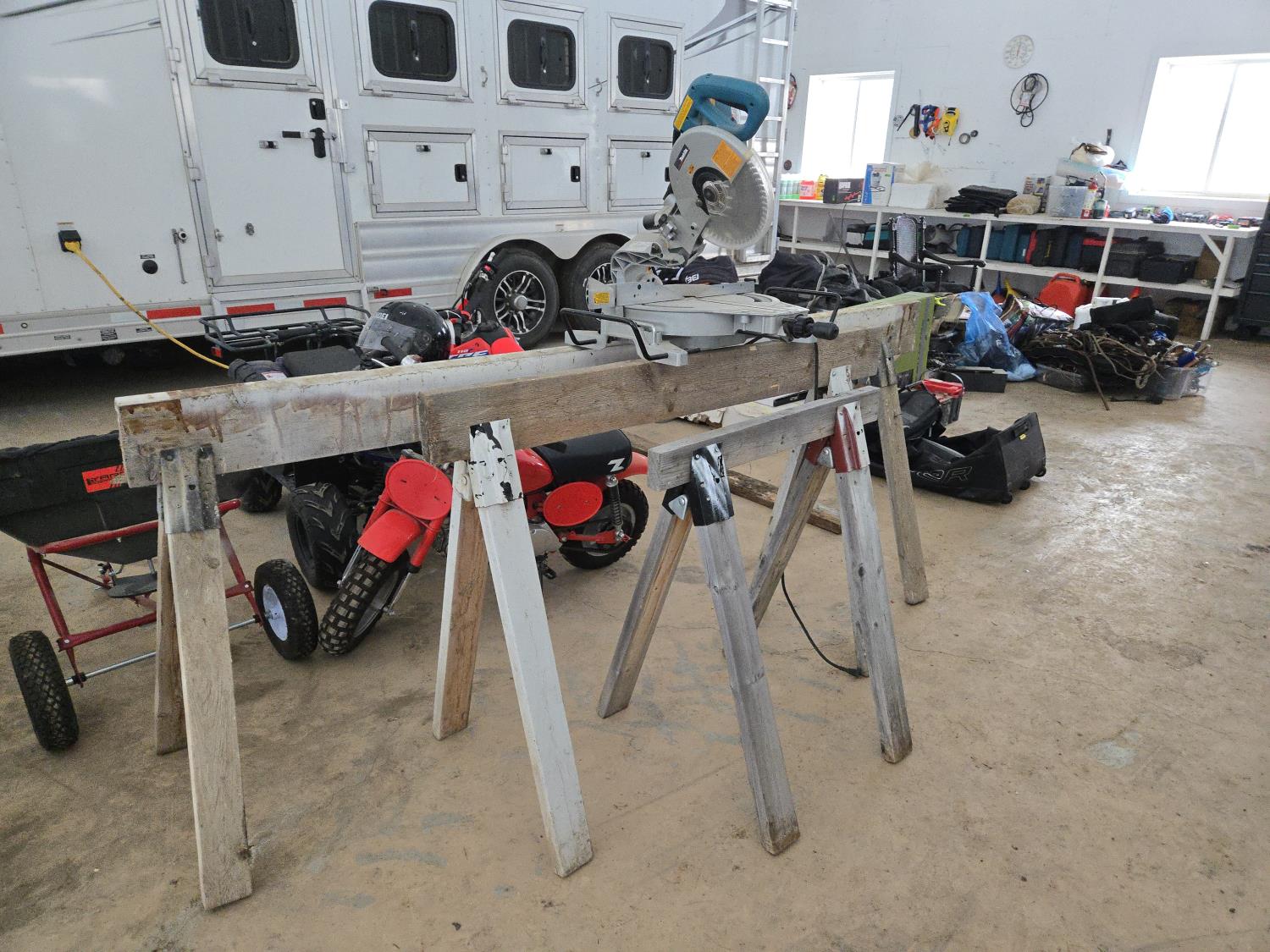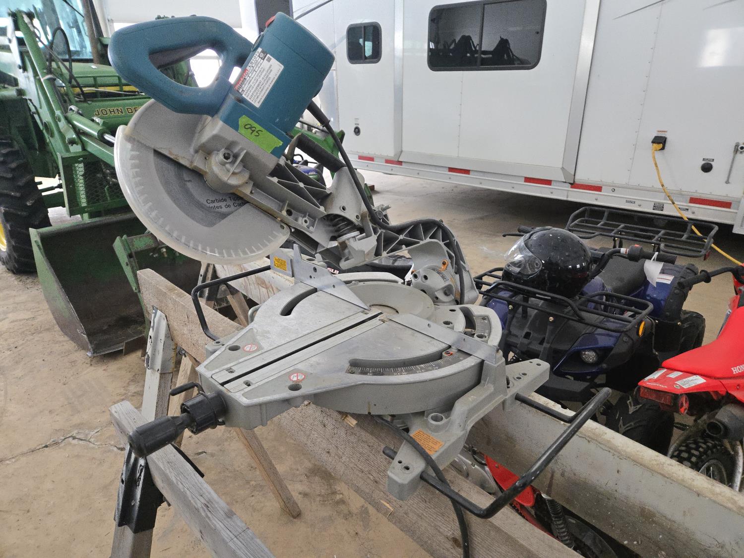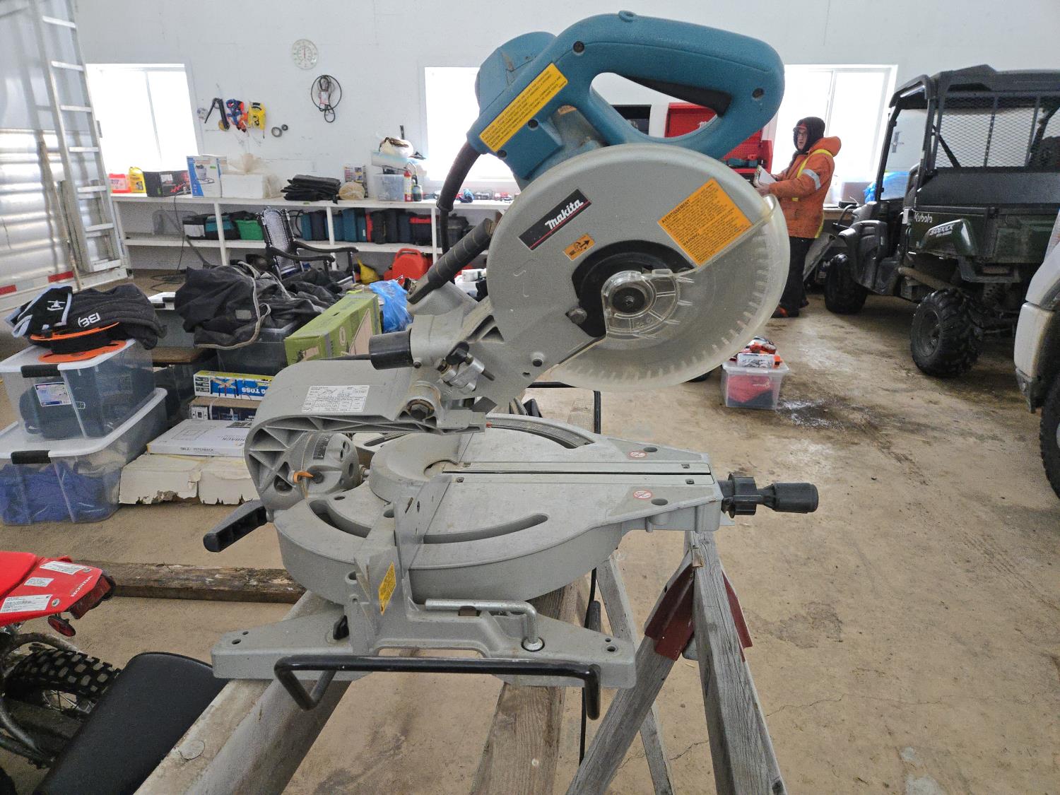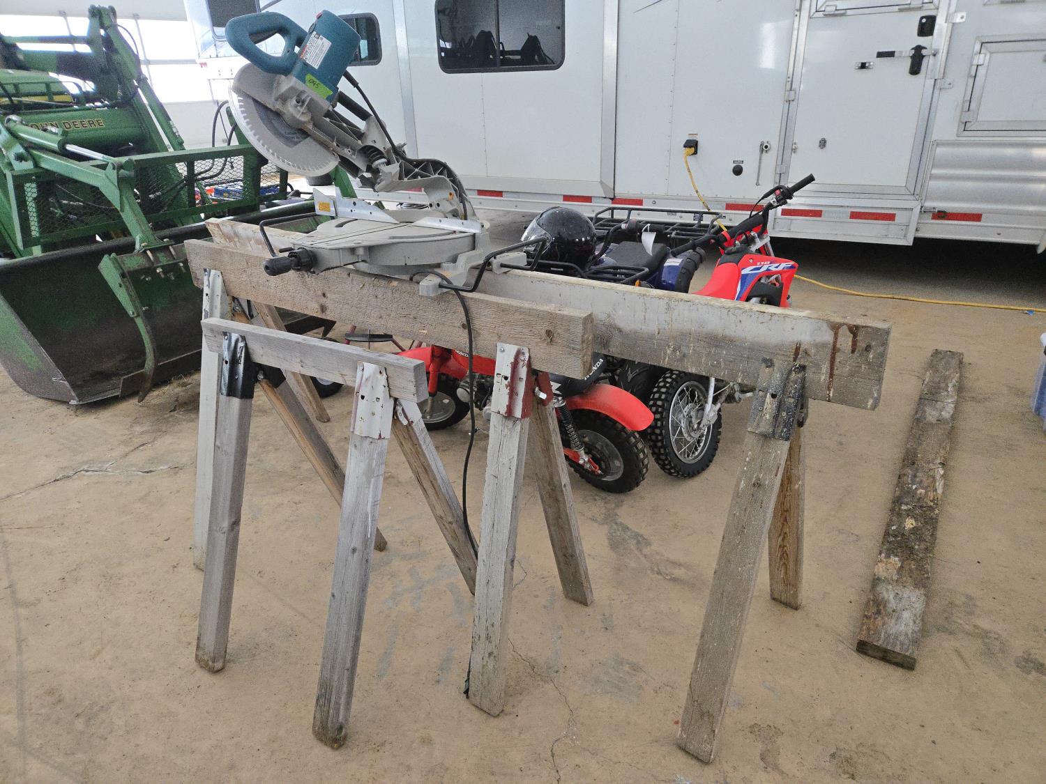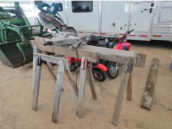 832 (3) Wooden Saw Horses & Makita 10 Inch Compound Miter Saw