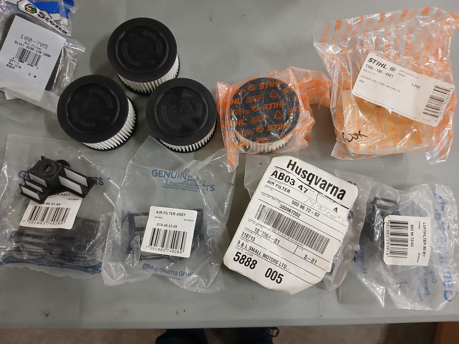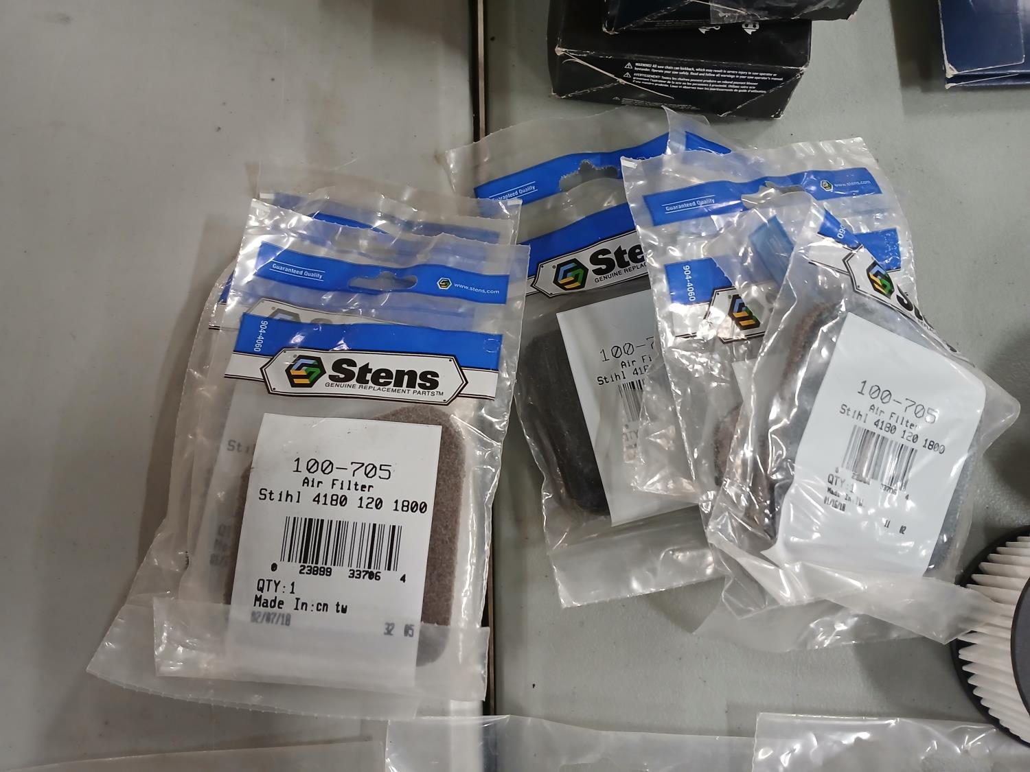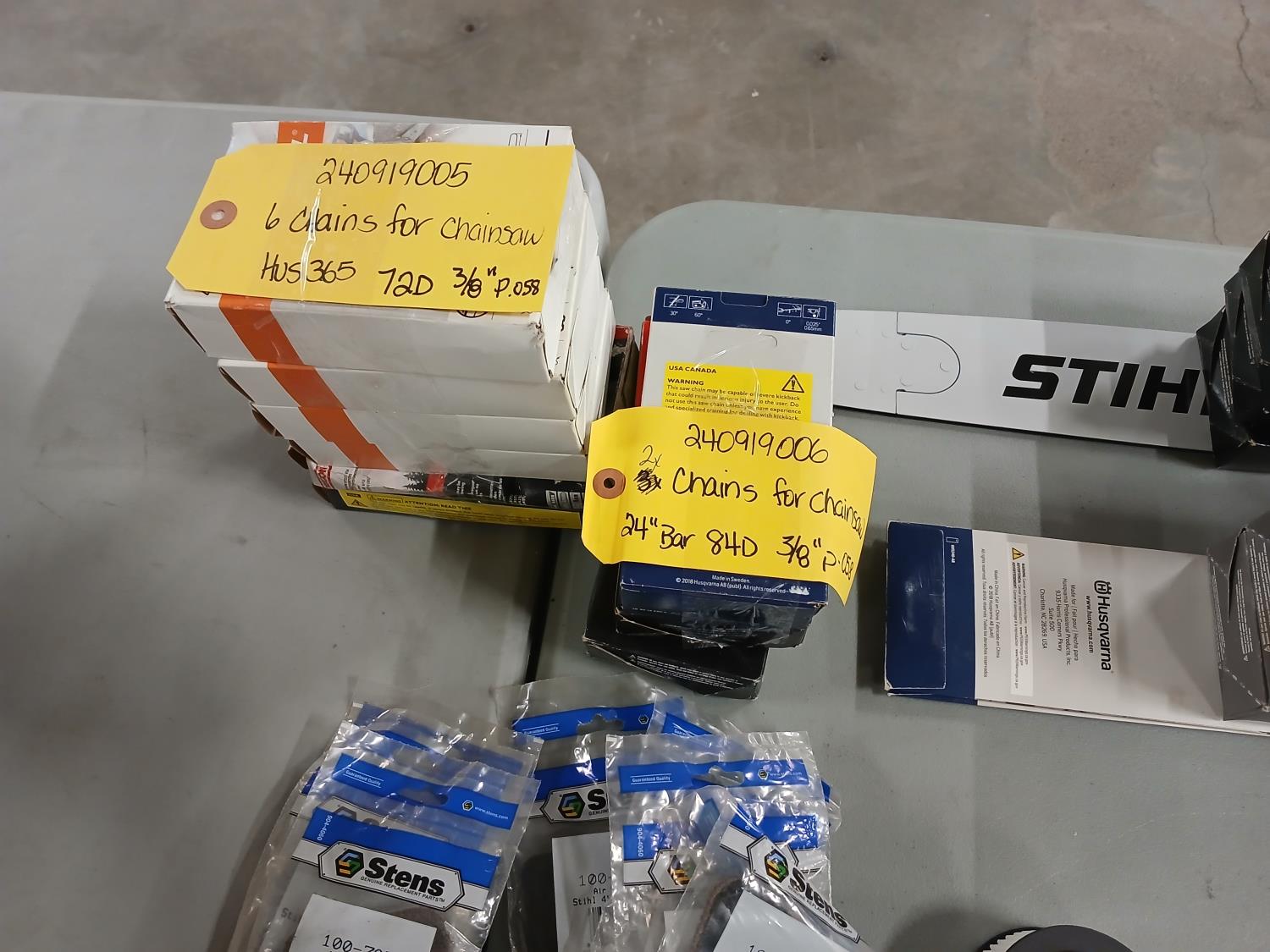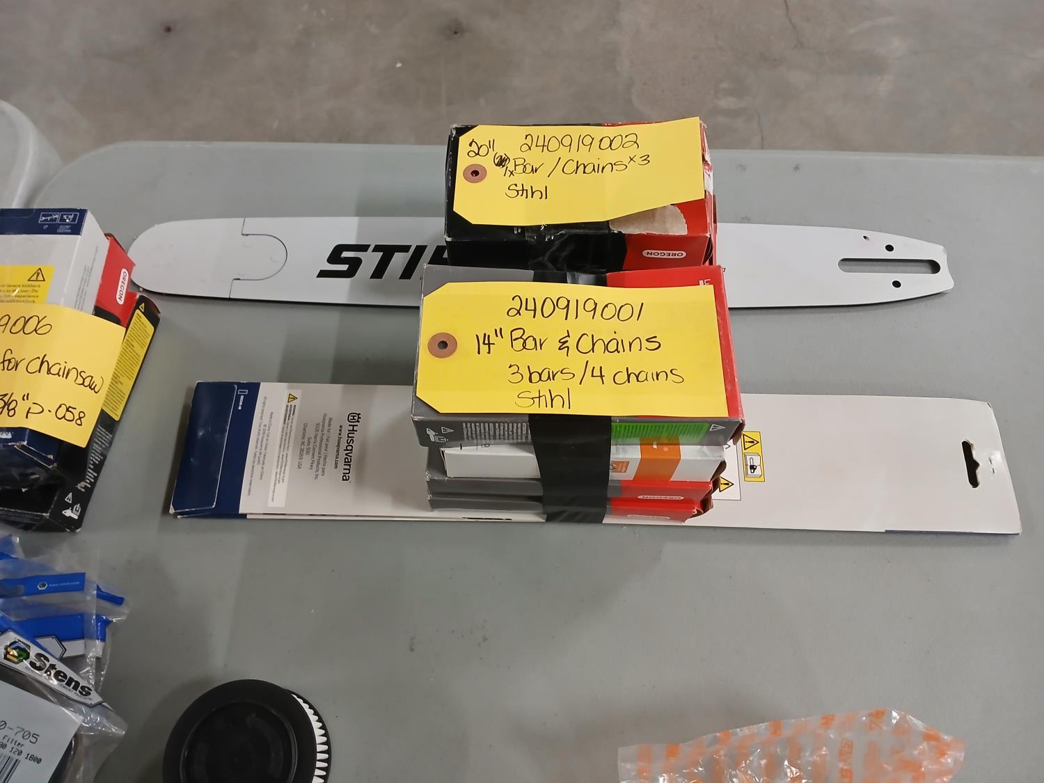 (7) Stihl 100-705 filters, (7) Husqvarna air filters, (4) Stihl air filters, (2) Stihl 1145-140-4401 air filters, (2) Stihl 14 inch bars with (4) chains, (3) 24 inch chains, (6) Husqvarna 365 chains.