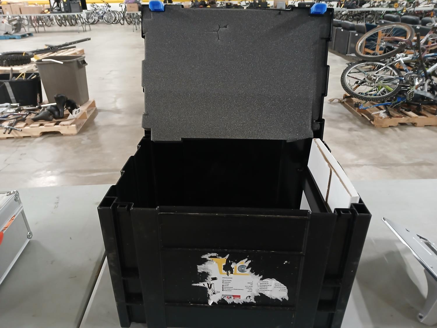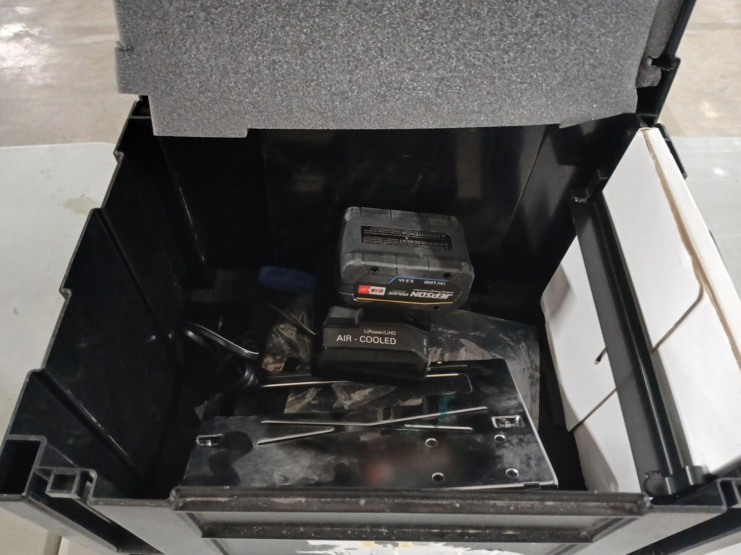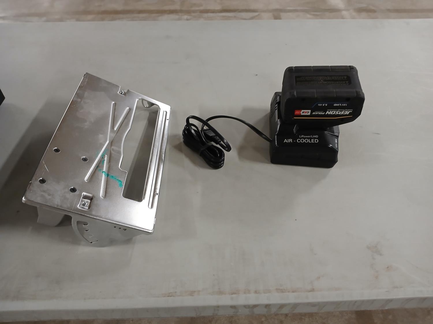 (1) steel saw guard, (1) bag of various small screws and knob, (1) flat head screwdriver, (1) Jepsen 18 volt battery with charger. (1) black tool case