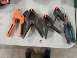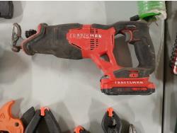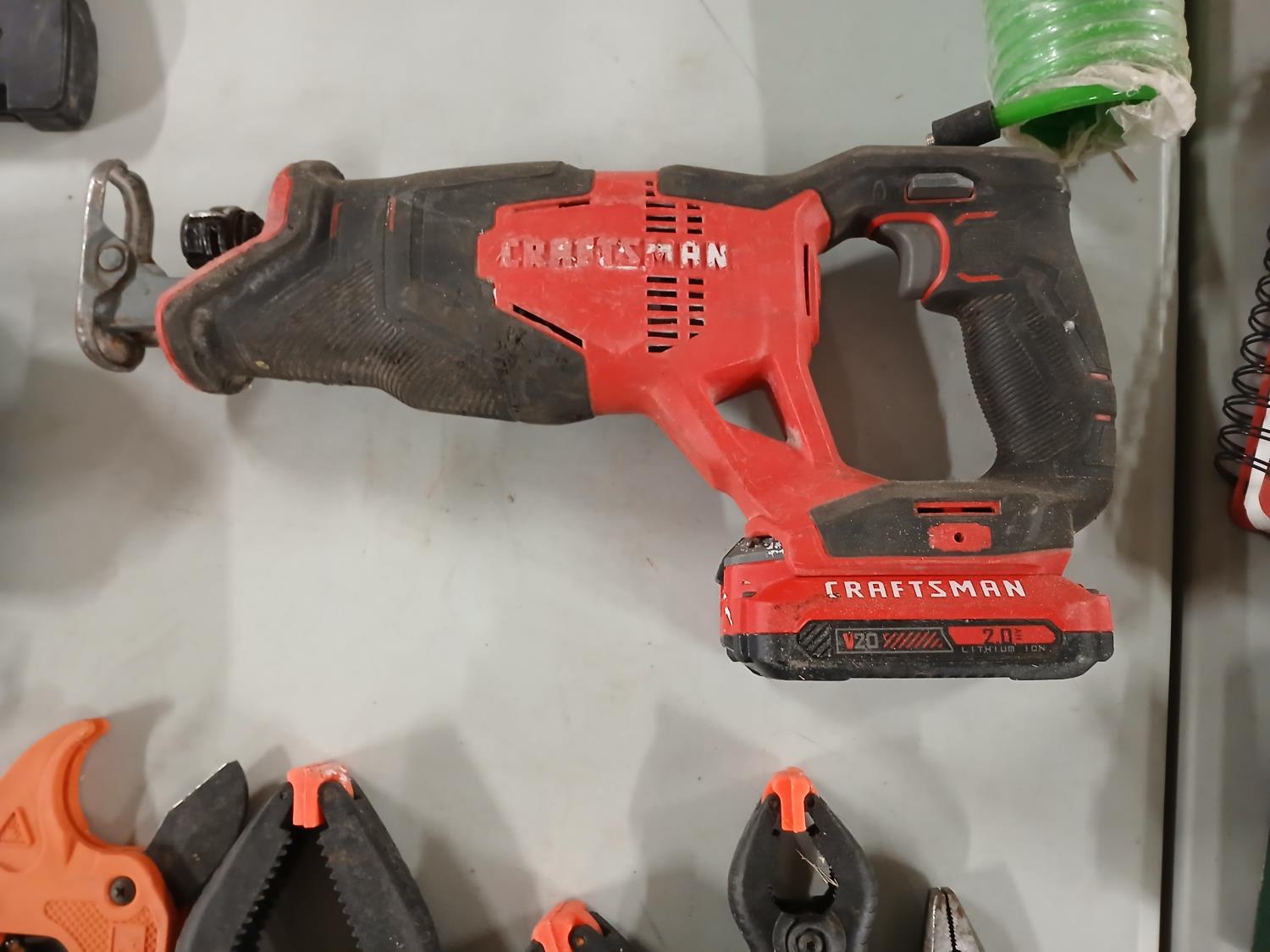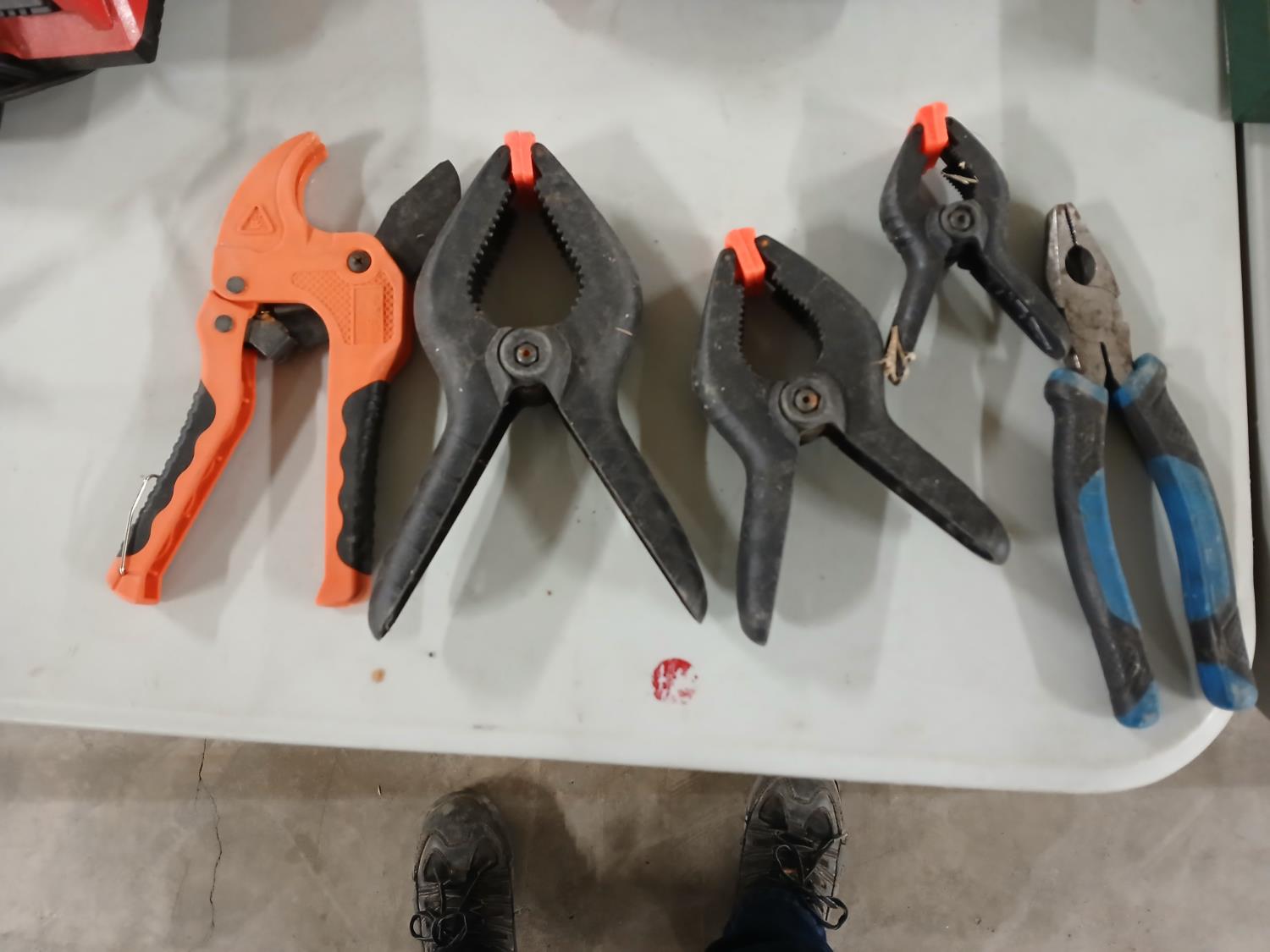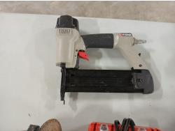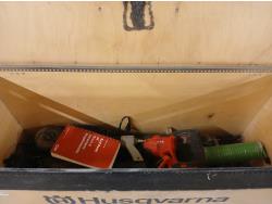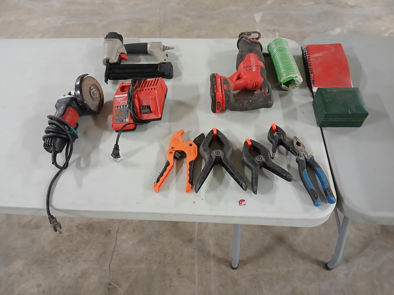 (1) Porter Cable brad nailer, (1) Milwaukee charger, (1) Craftman reciprocating saw, (1) Job mate angle grinder, (1) engineering red book of track and structure requirements, (1) air hose, (4) various sized clamps, 1 large Husqvarna wood tool box.