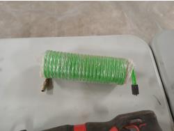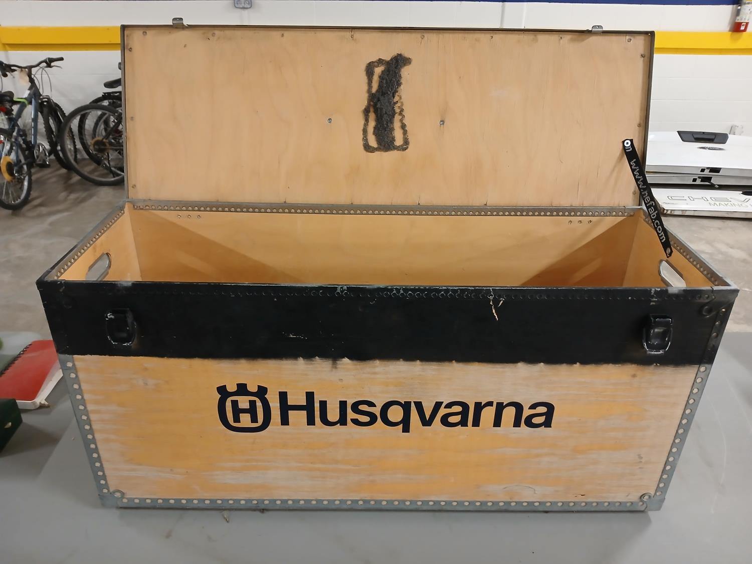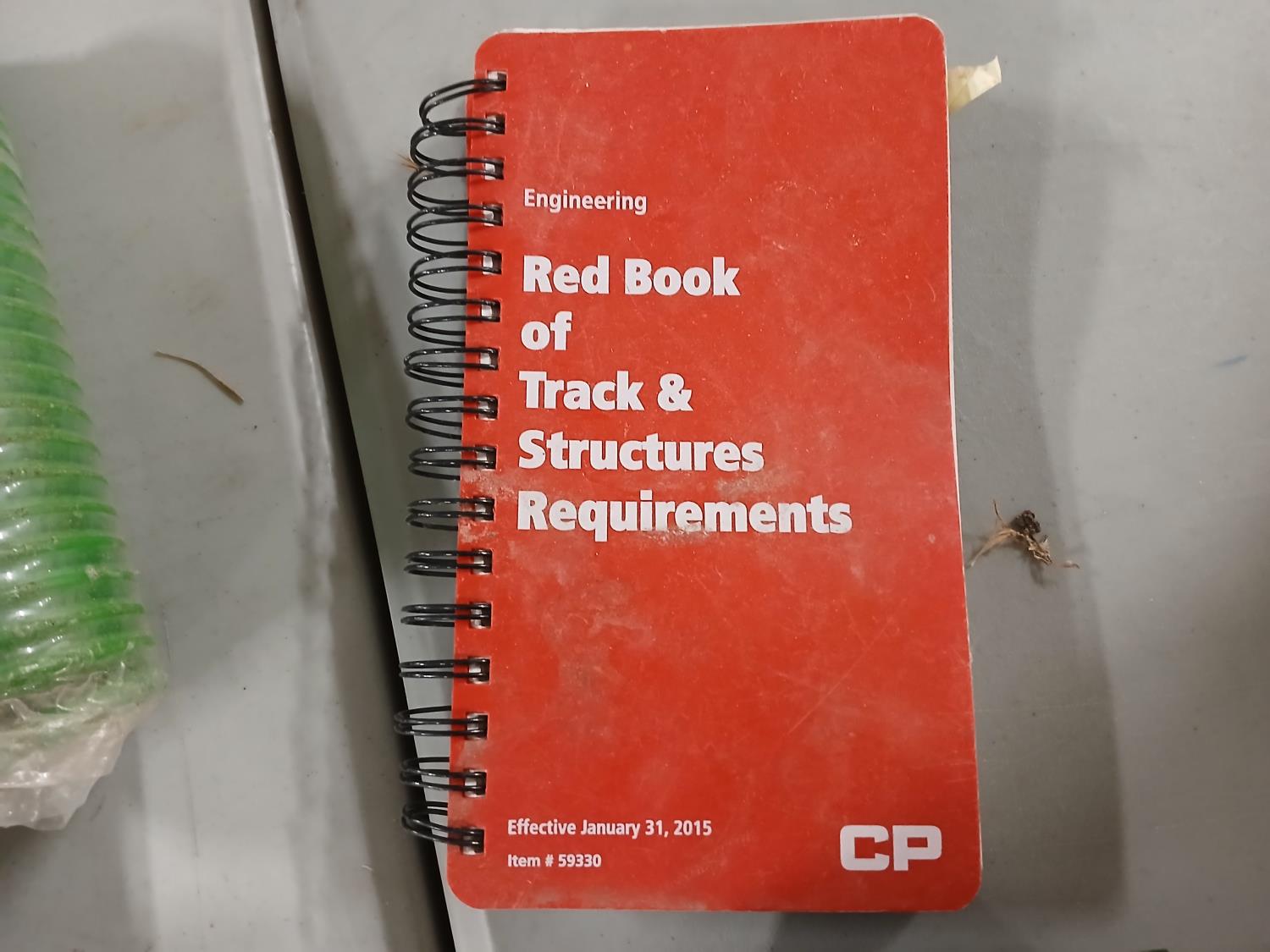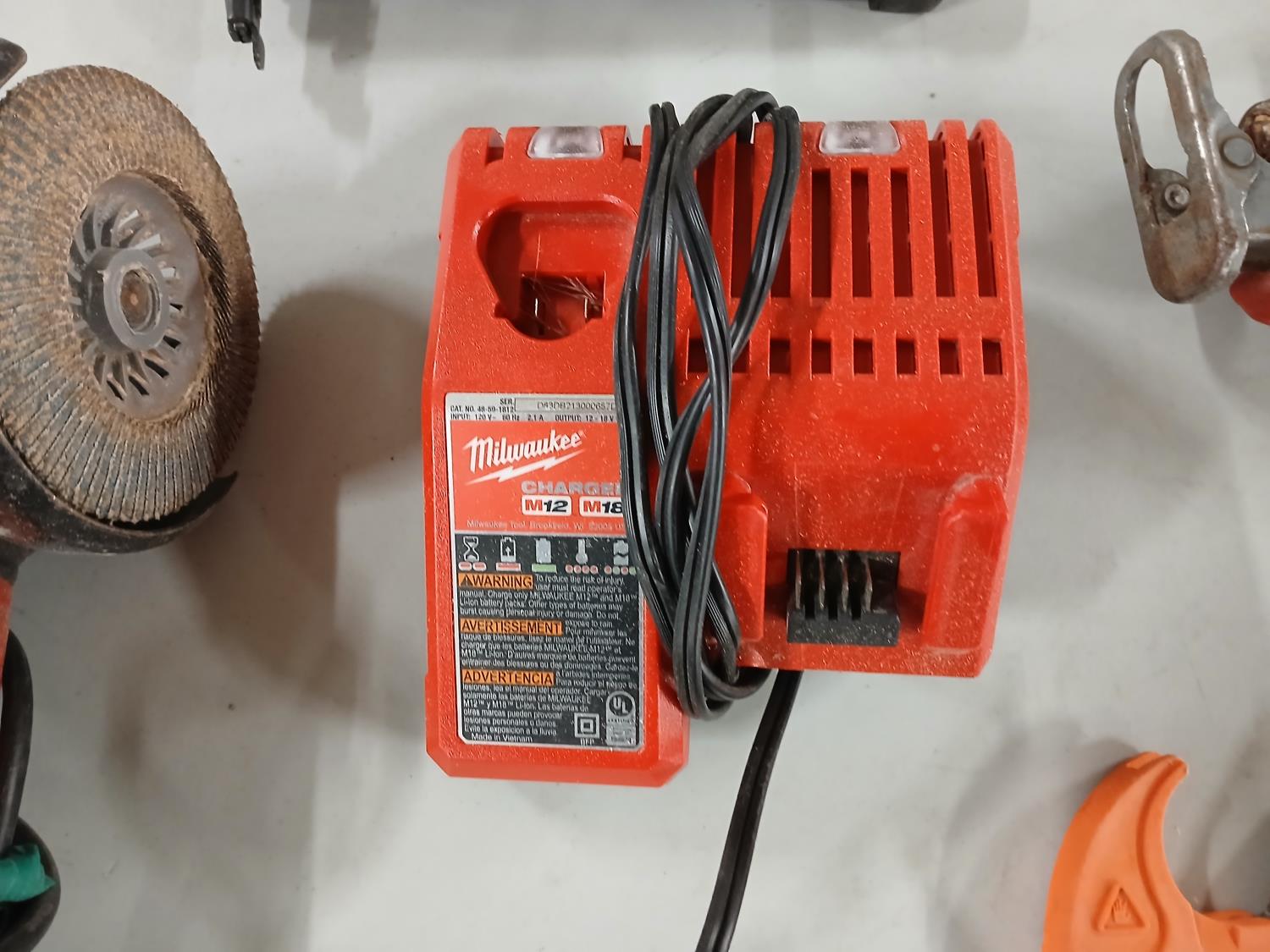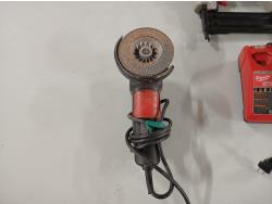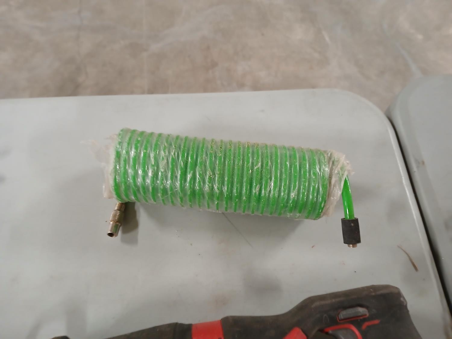 (1) Porter Cable brad nailer, (1) Milwaukee charger, (1) Craftman reciprocating saw, (1) Job mate angle grinder, (1) engineering red book of track and structure requirements, (1) air hose, (4) various sized clamps, 1 large Husqvarna wood tool box.