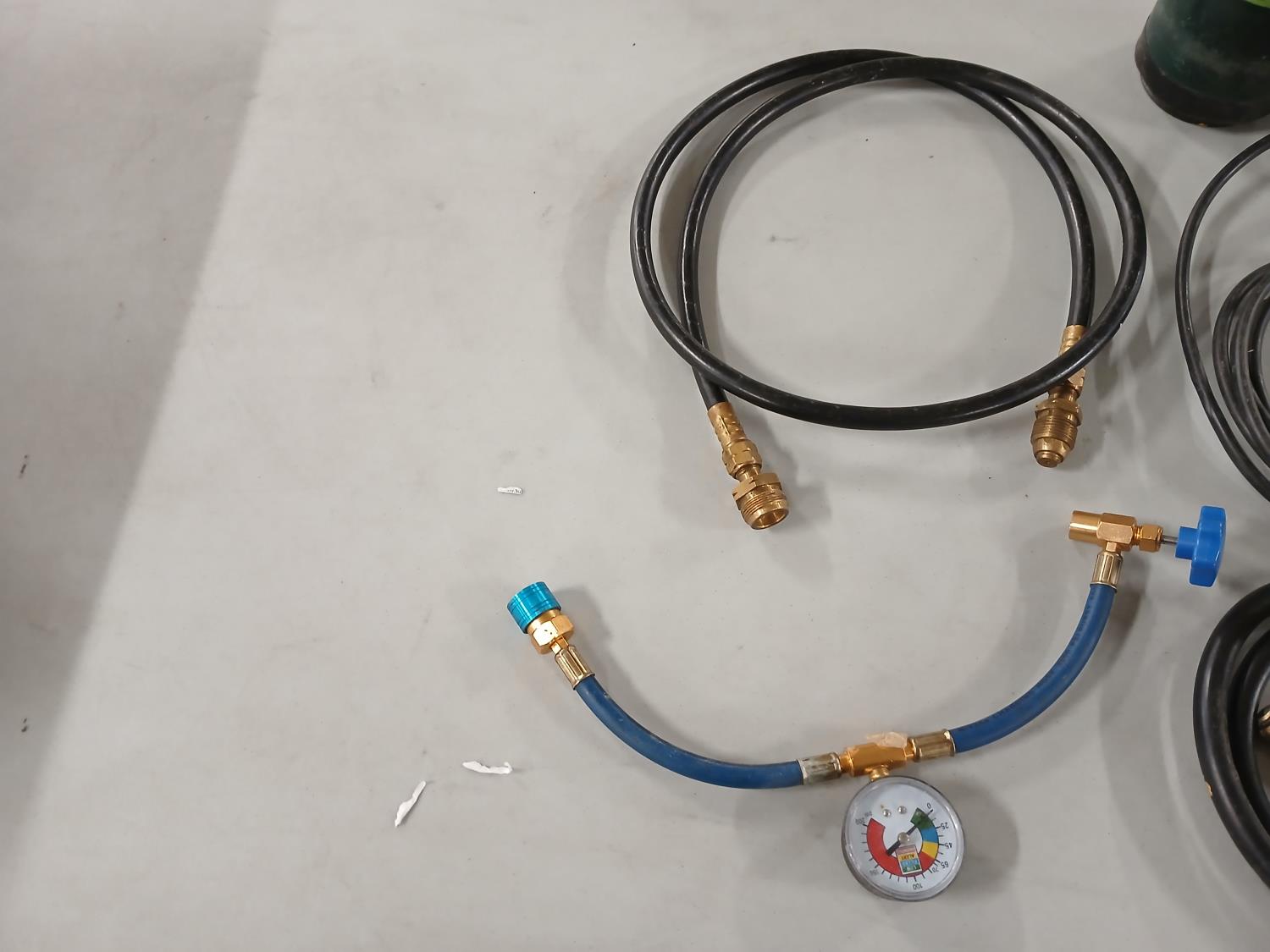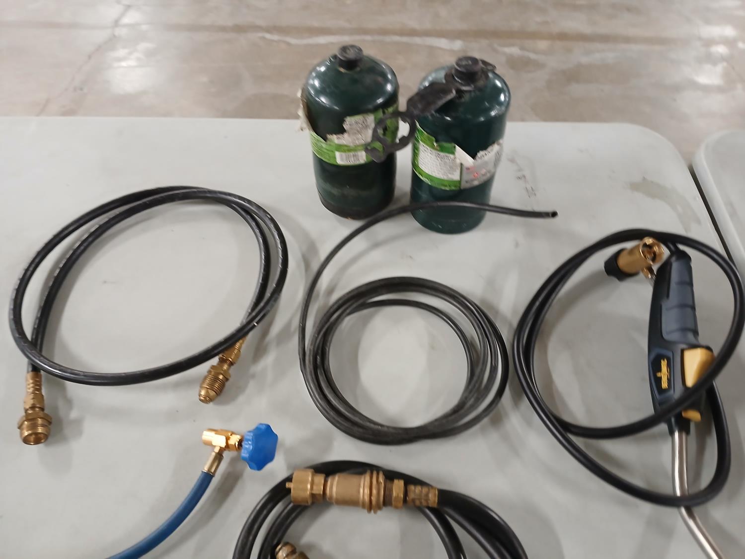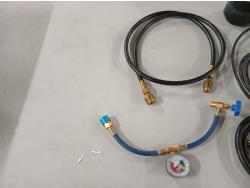 (1) Benzomatic hose torch, 3.5 ft tubing, (2) propane hoses, (1) R134a AC refrigerant charge hose with pressure sensor gauge, (2) propane canisters.