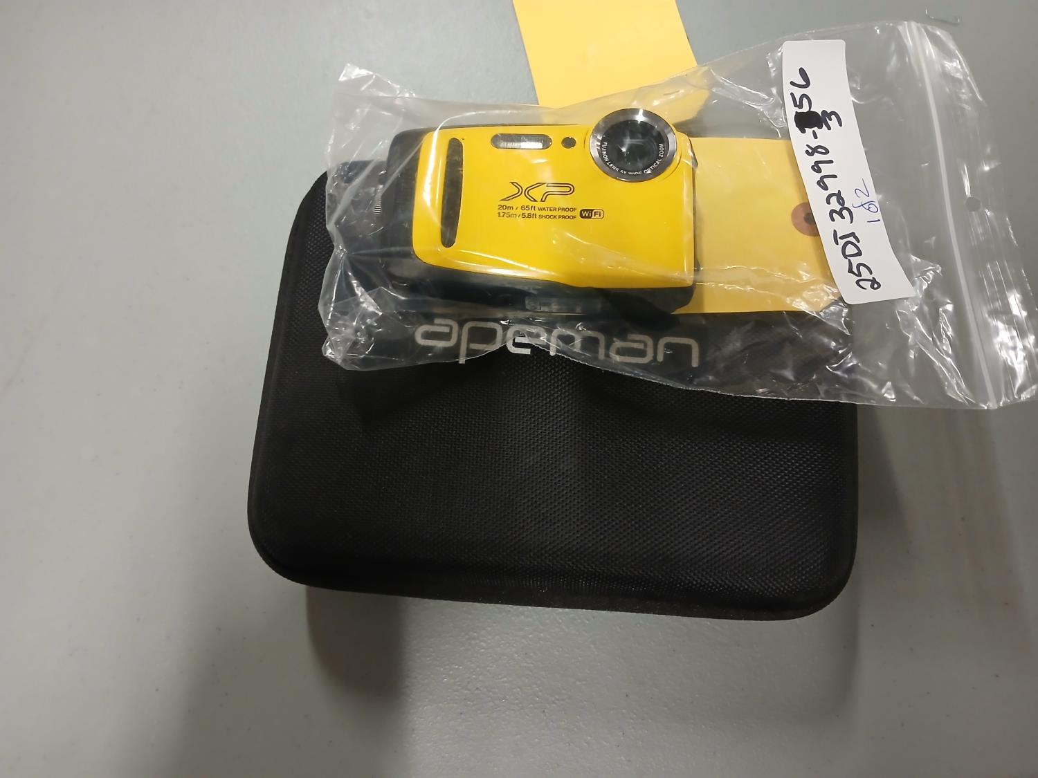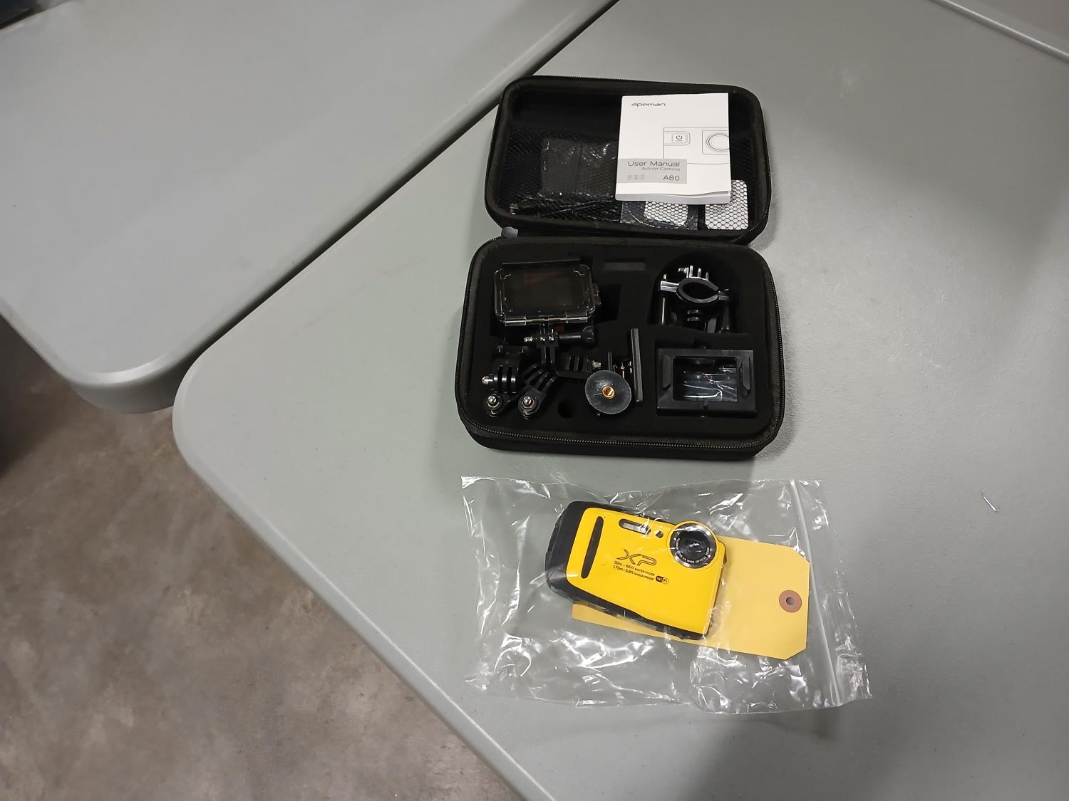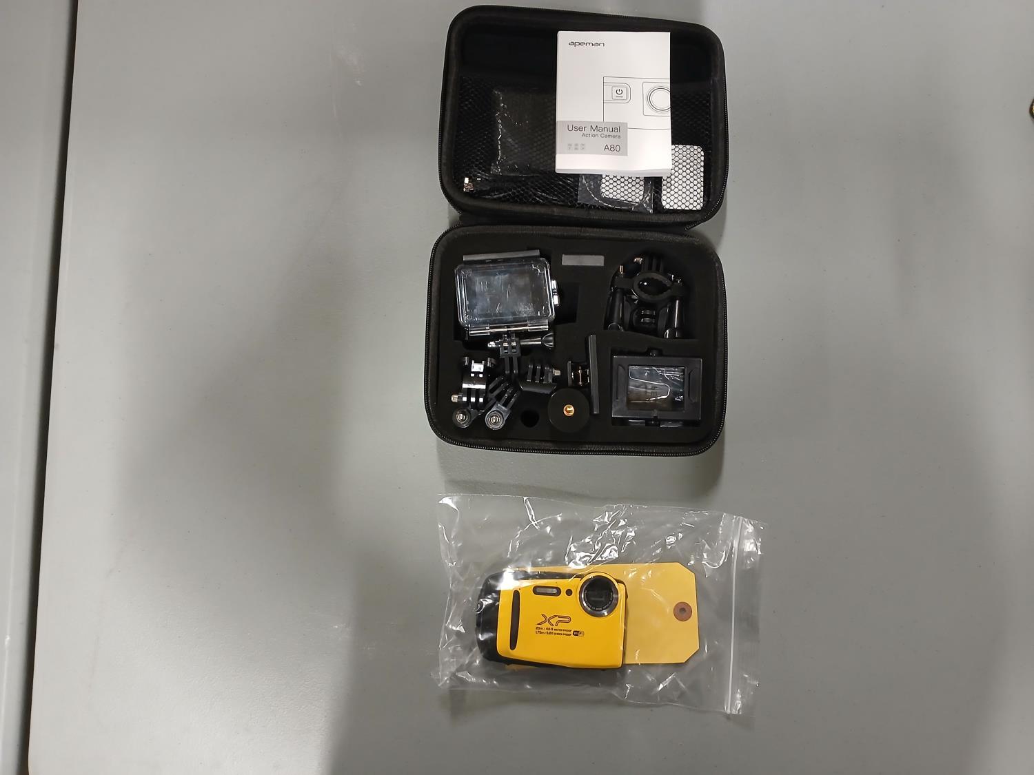 (1) XP Waterproof (up to 65 ft) yellow camera, (1) Apeman A80 Action mountable camera with accessories.