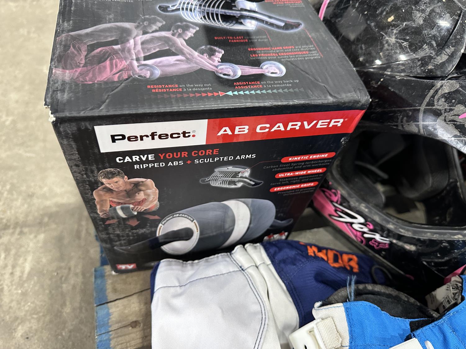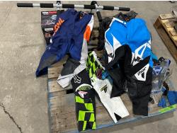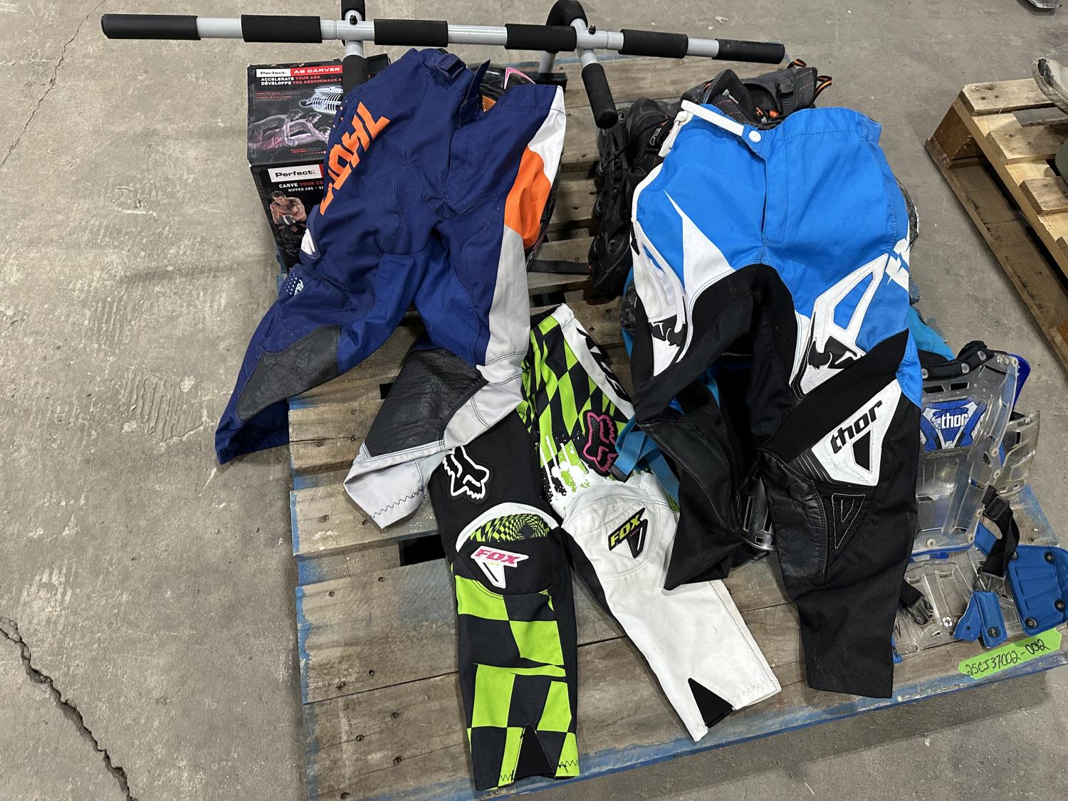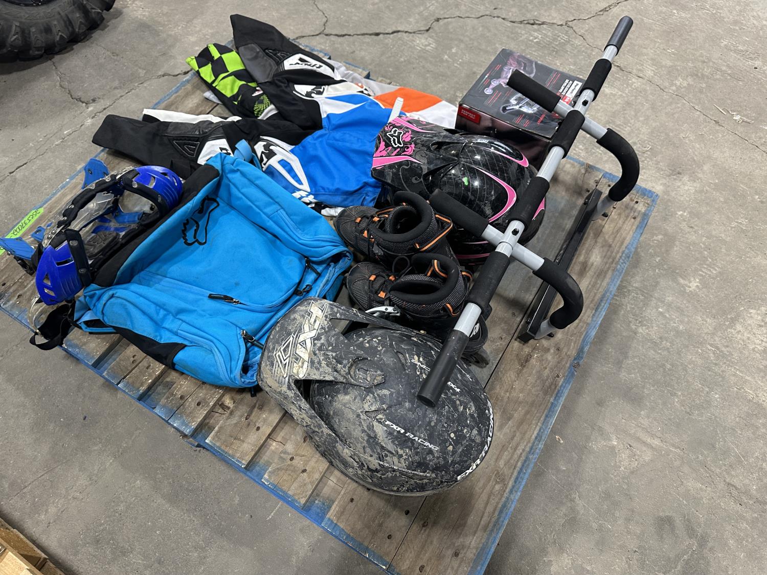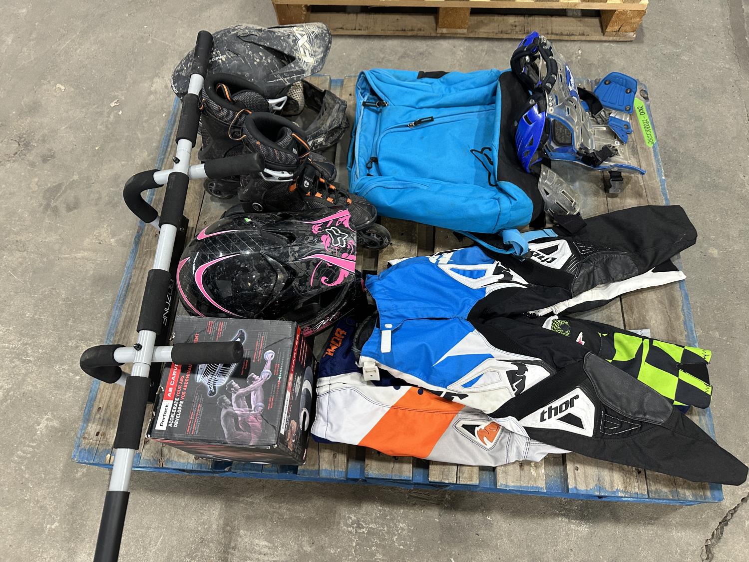 (3) motocross pants youth sizes, (2) helmets, pair of roller skates, door jam pull up bar, ab roller, FOX backpack