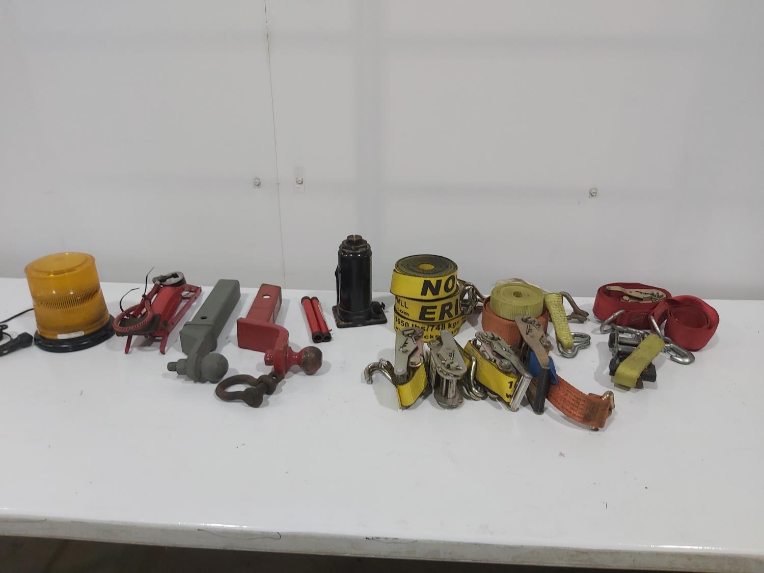 (1) 12V rotating amber beacon lamp, (6) ratchet straps, (1) 8 ton bottle jack, (1) foot air pump, (2) 2 inch trailer hitch and (1) shackle