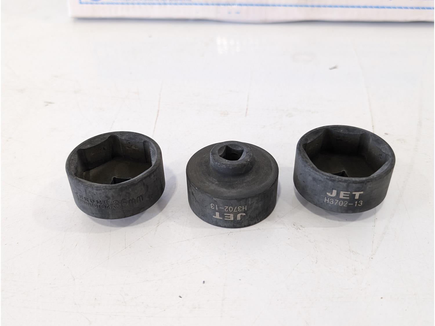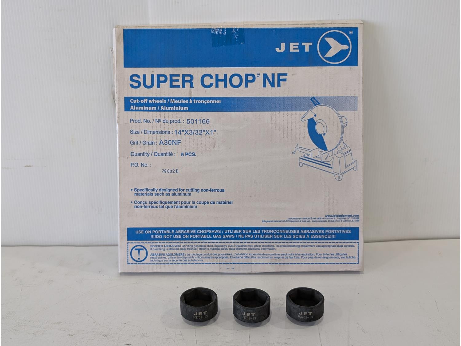 (5) Super chop NF 14 inch x 3/32 inch x 1 inch cut off wheels, (3) 36 mm 3/8 inch drive sockets