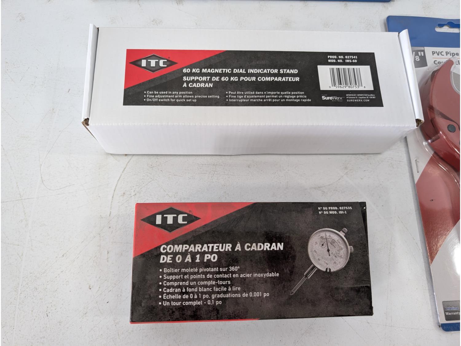 3 piece socket organizer set, 60 kg magnetic dial indicator stand, tire buffer, 1-5/8 inch PVC pipe cutter, 0-1 inch dial indicator