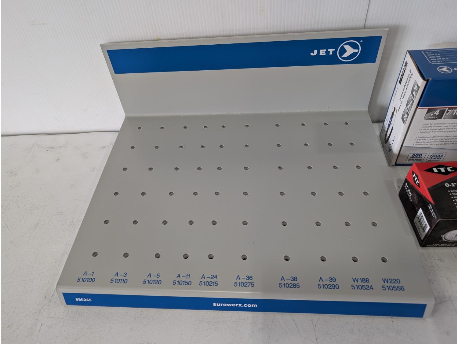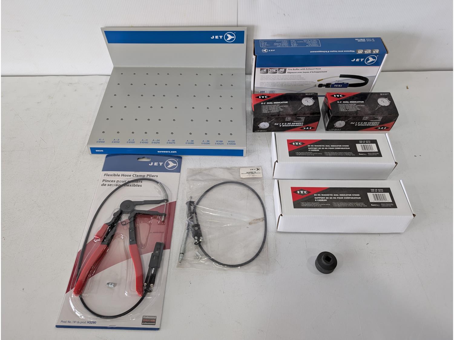 (2) 60 kg magnetic dial indicator stand, tire buffer, (2) 0-1 inch dial indicator, 27 mm 3/8 inch drive sockets, plastic display, flexible hose clamp pliers with extra cable