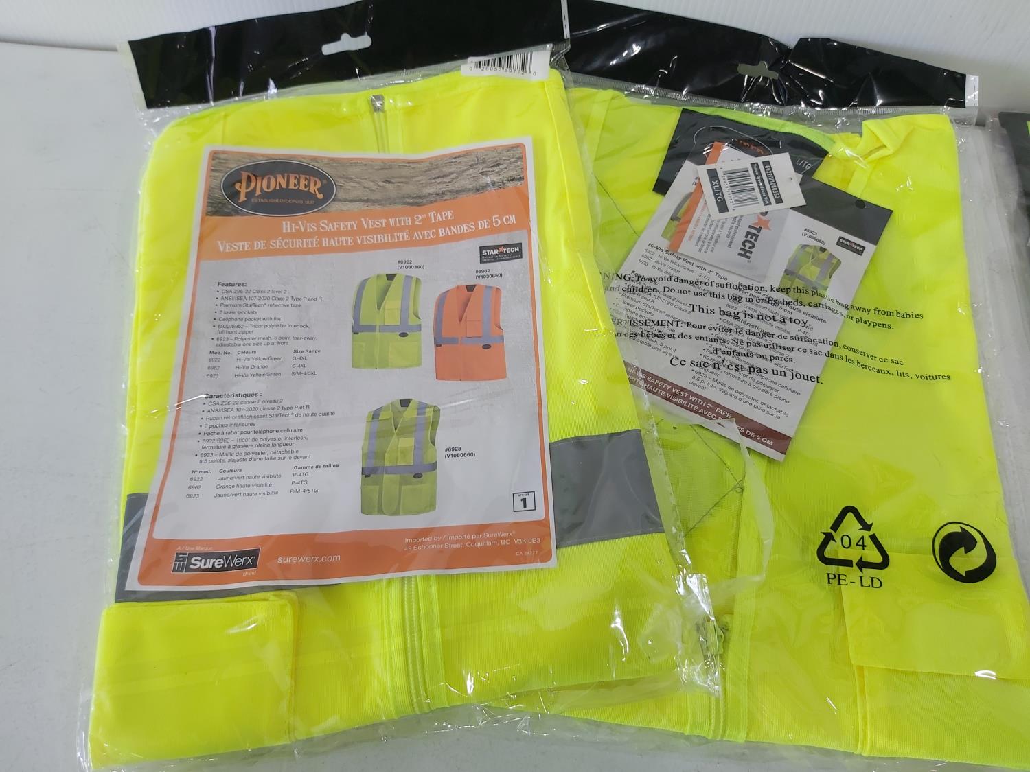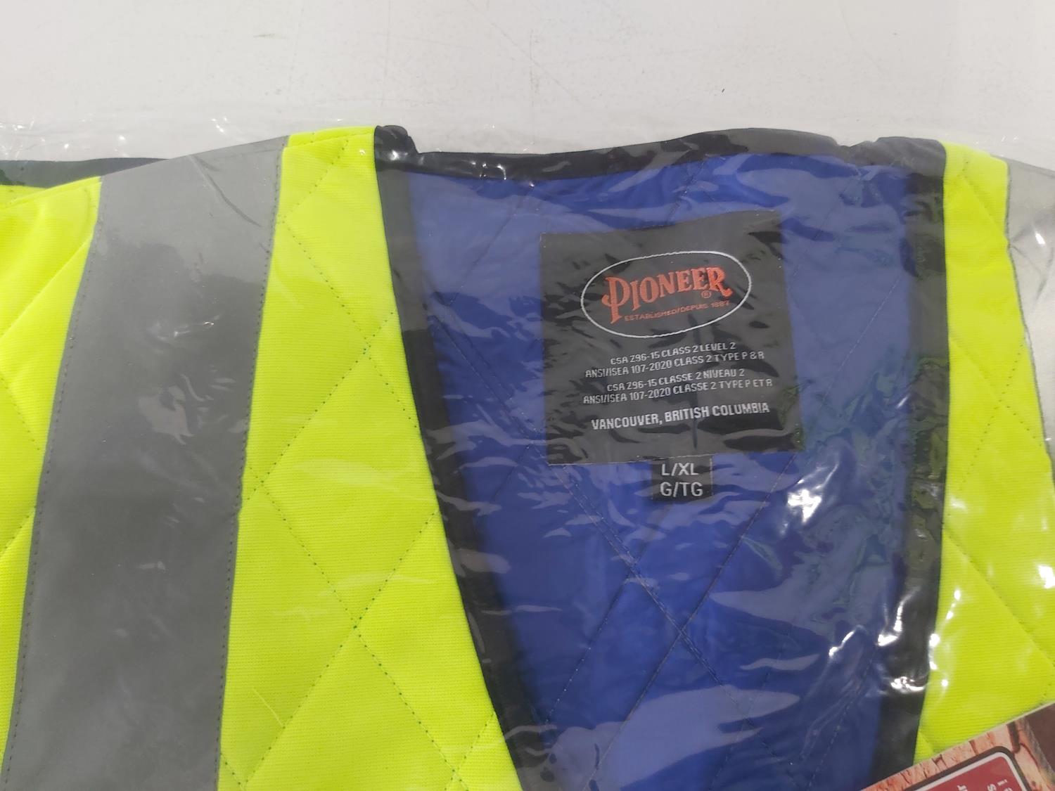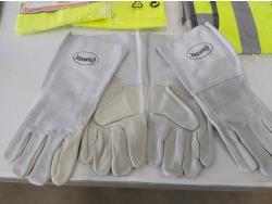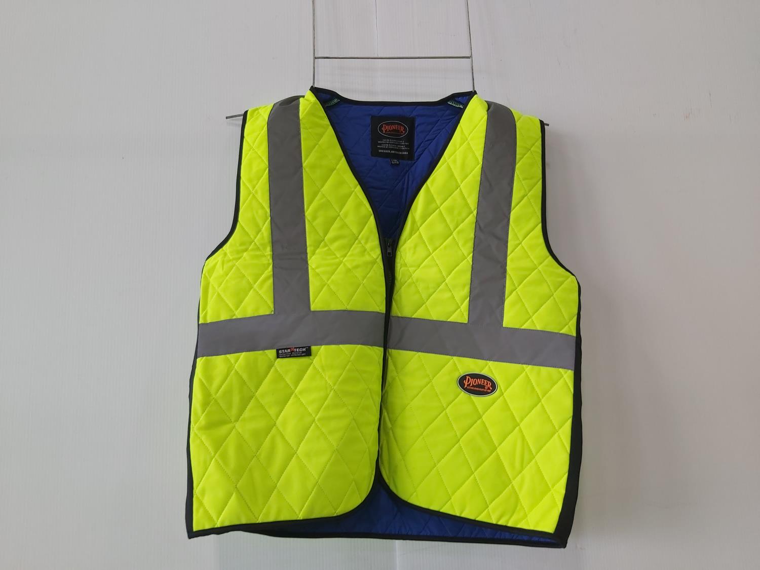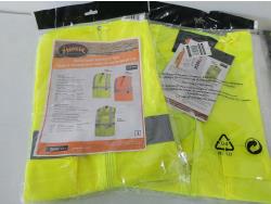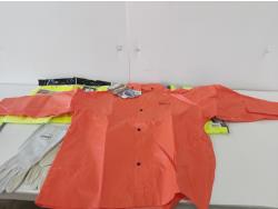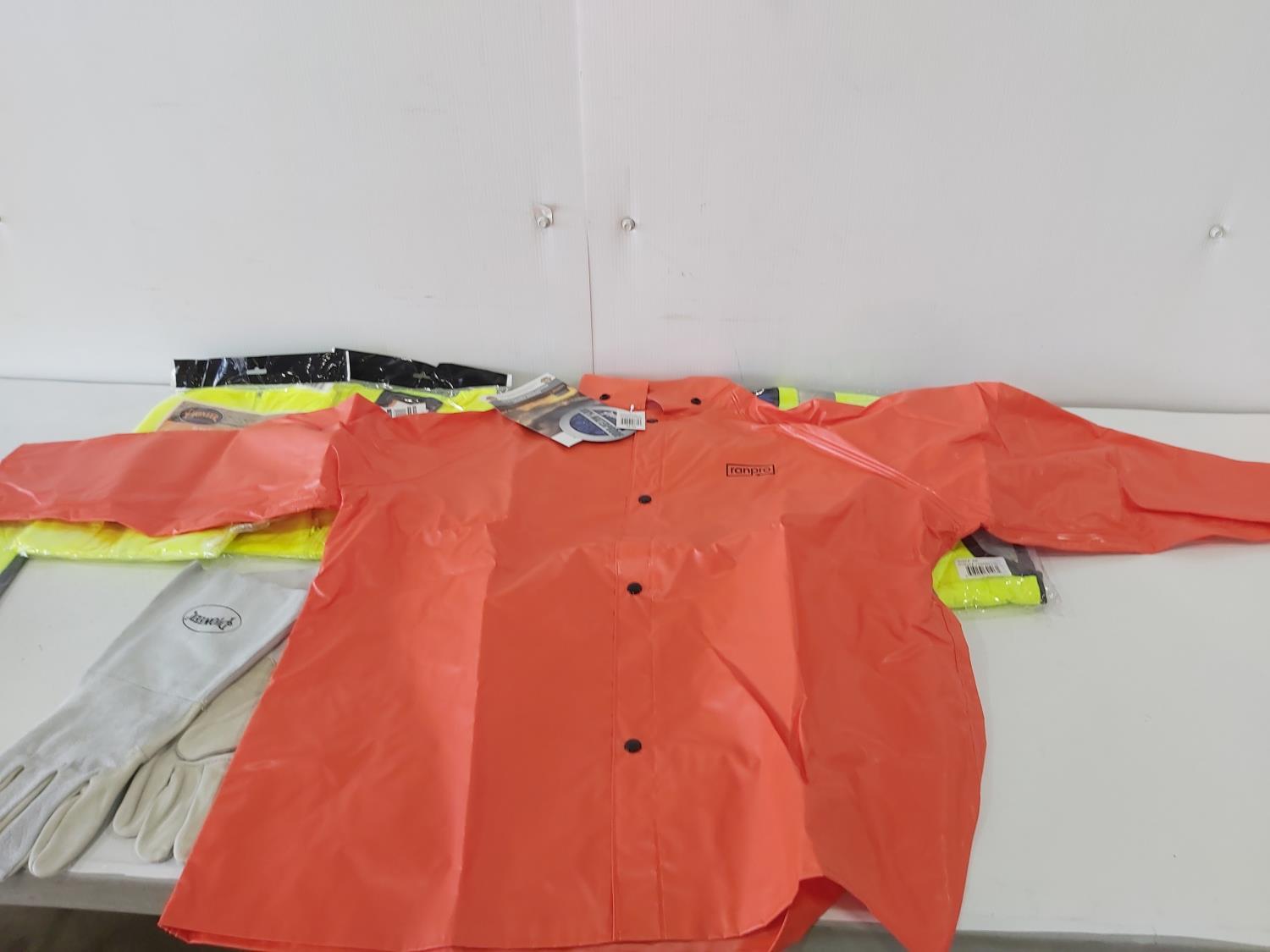 (3) L-XL quilted safety vests, (1) medium rain jacket, (2) XL safety vests, (2) pairs of XL leather gloves