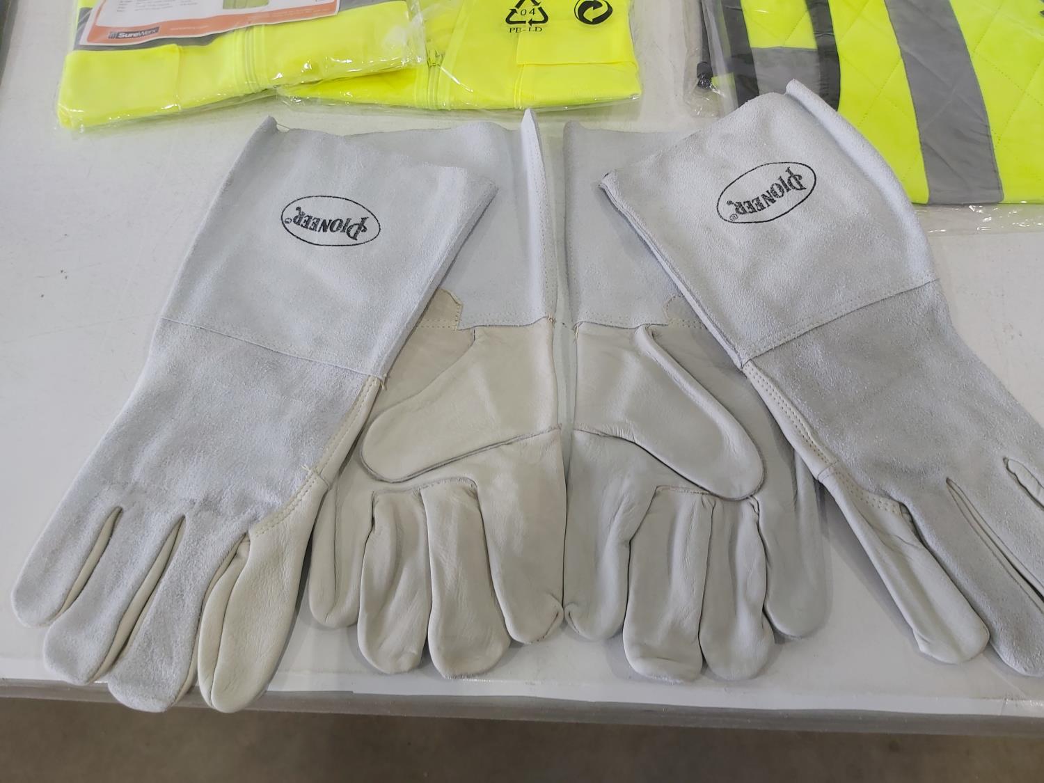 (3) L-XL quilted safety vests, (1) medium rain jacket, (2) XL safety vests, (2) pairs of XL leather gloves