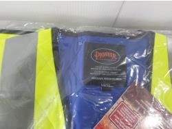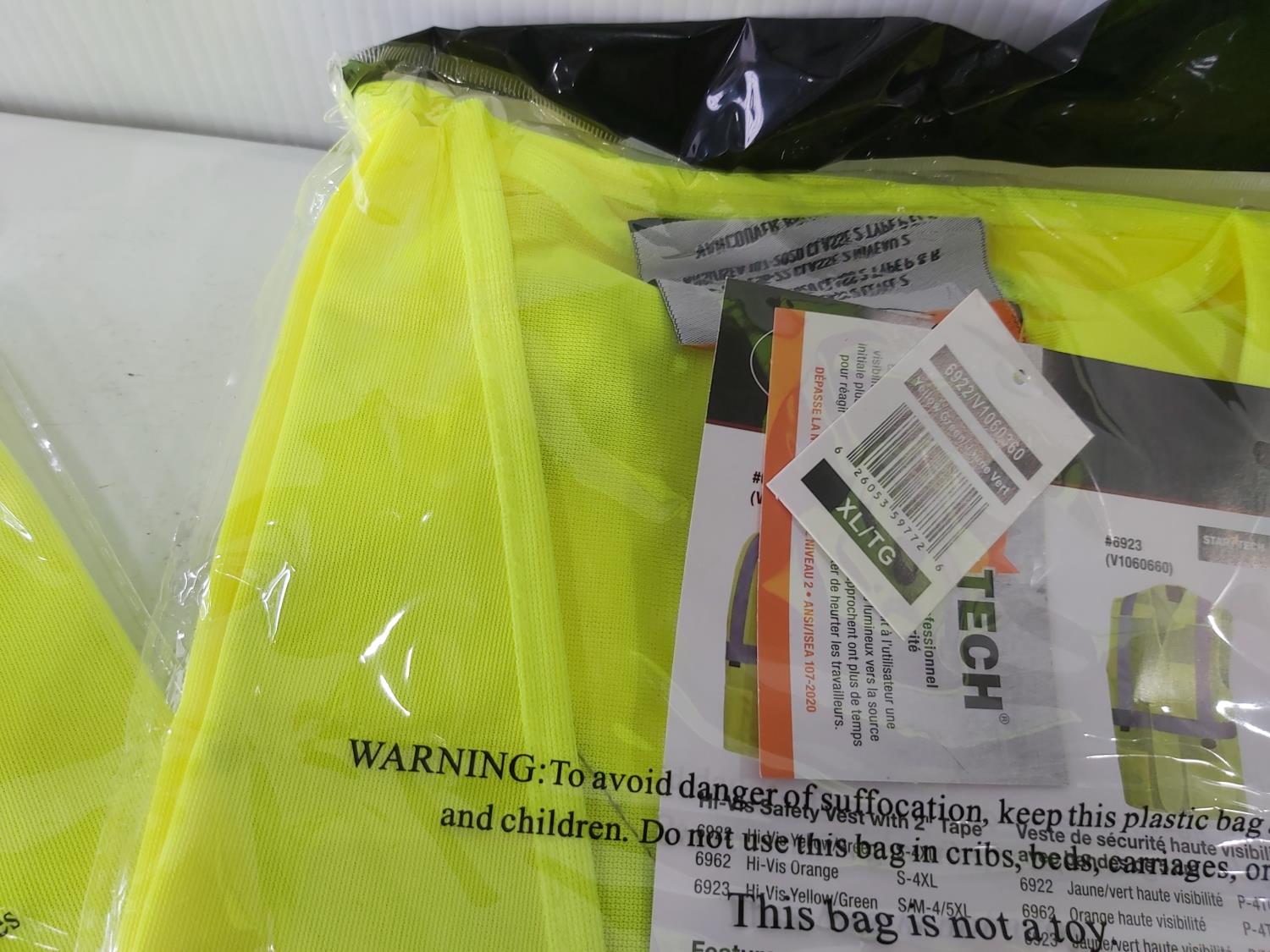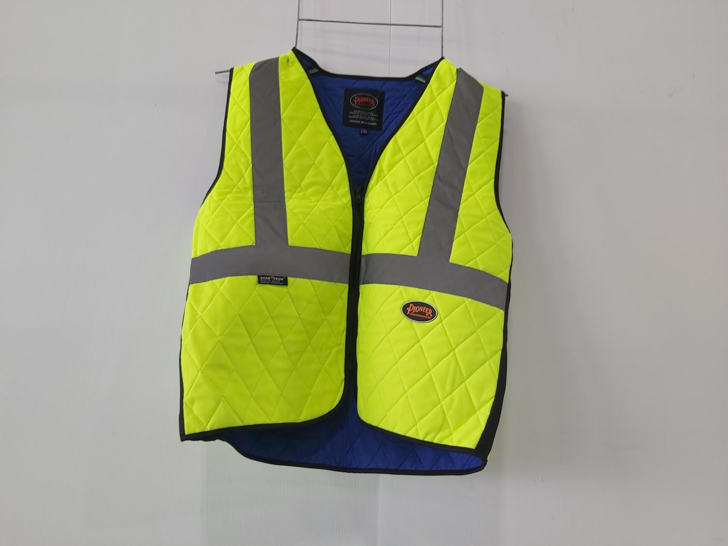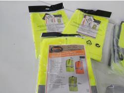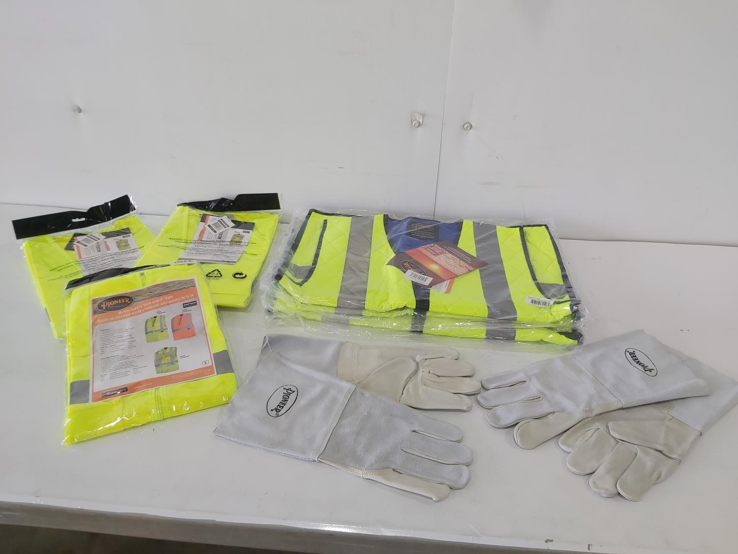 (3) L-XL quilted safety vests, (3) XL safety vests, (2) pairs of XL leather welding gloves