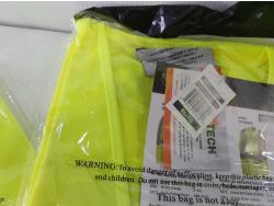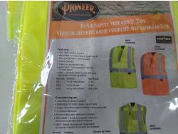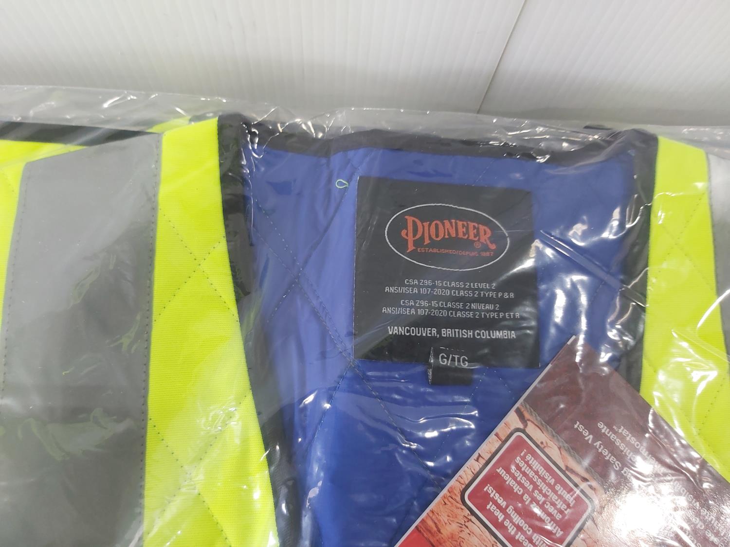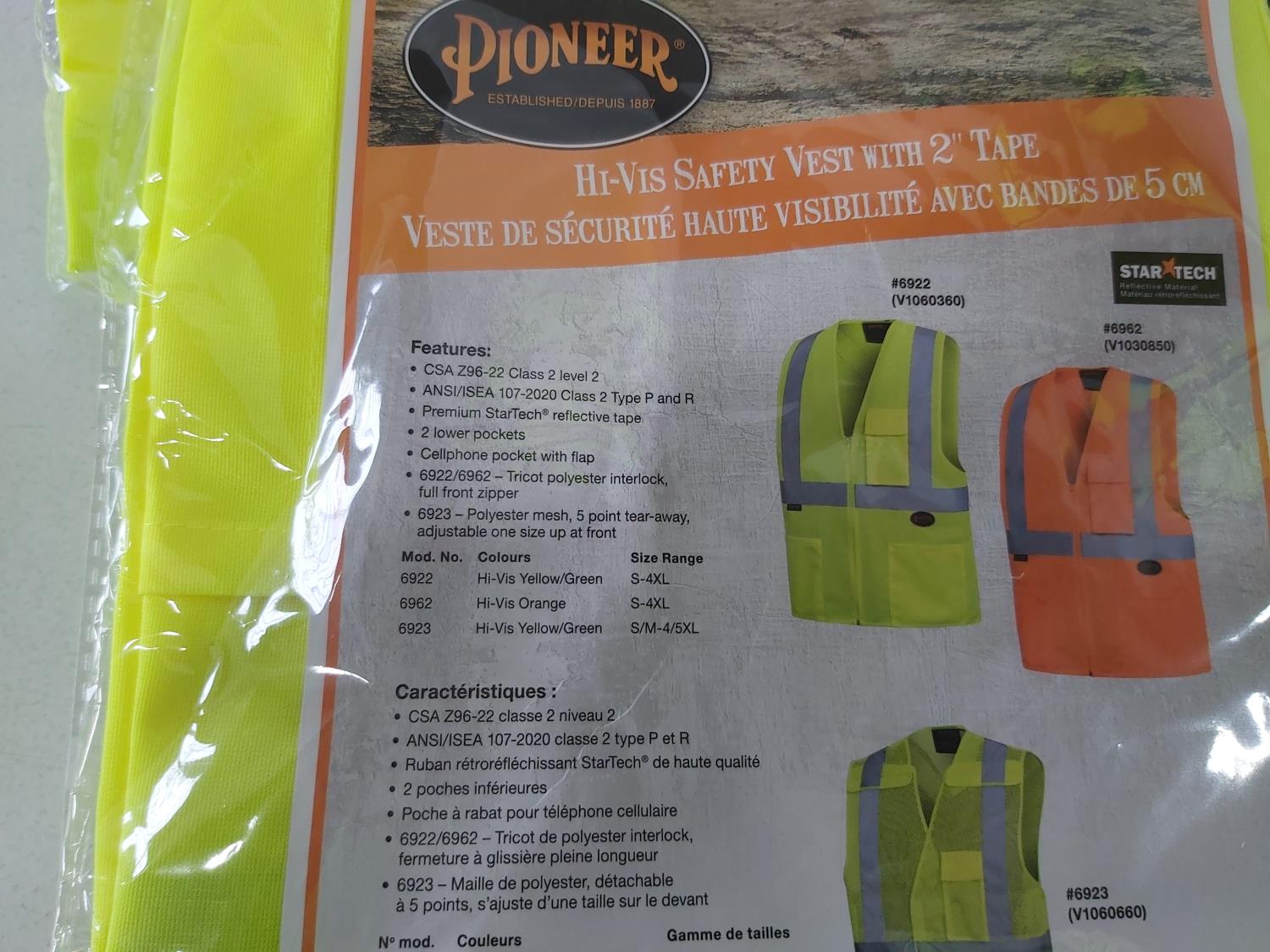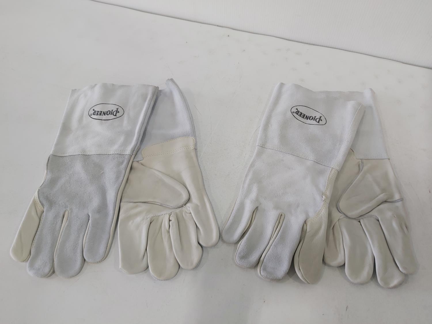 (3) L-XL quilted safety vests, (3) XL safety vests, (2) pairs of XL leather welding gloves