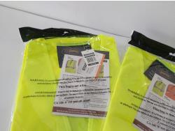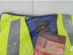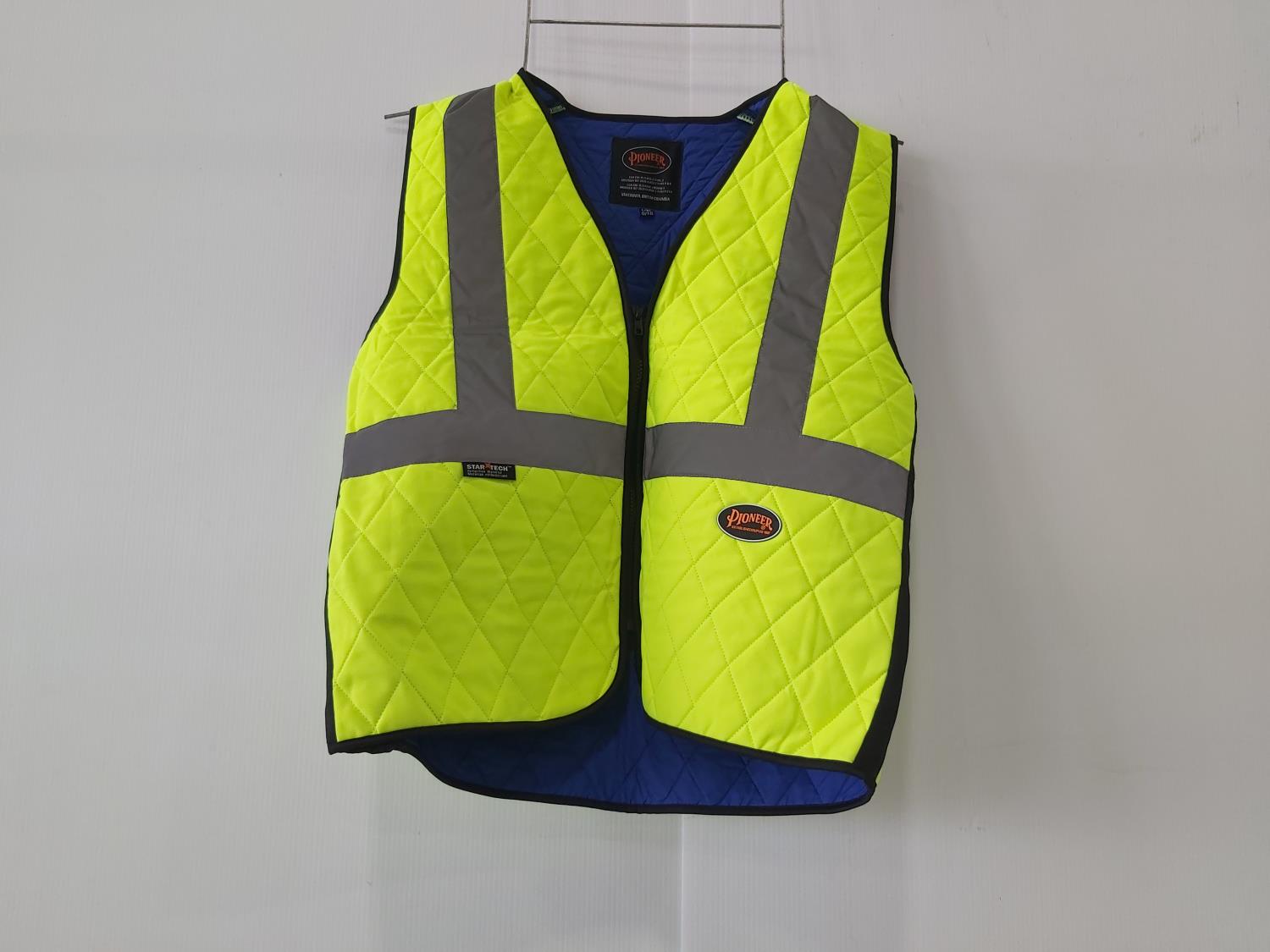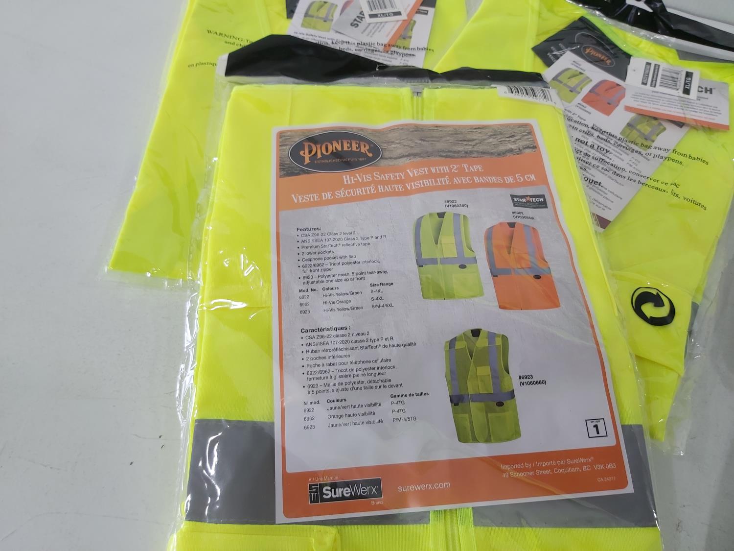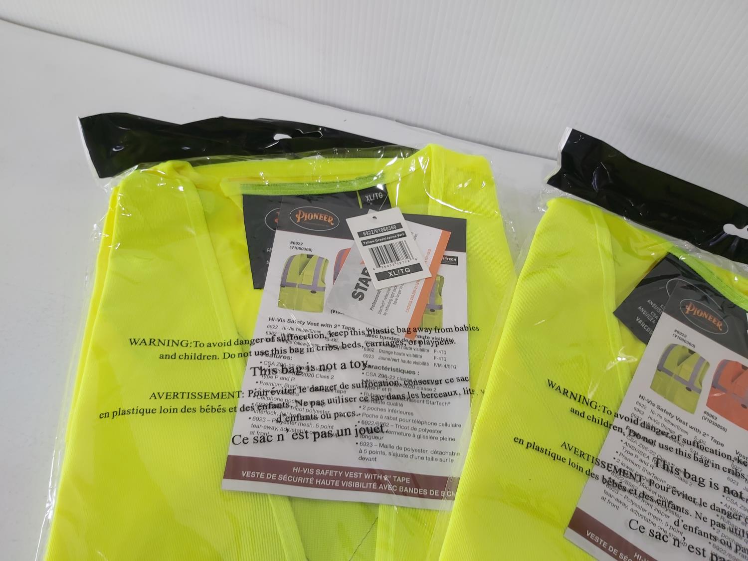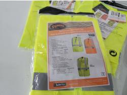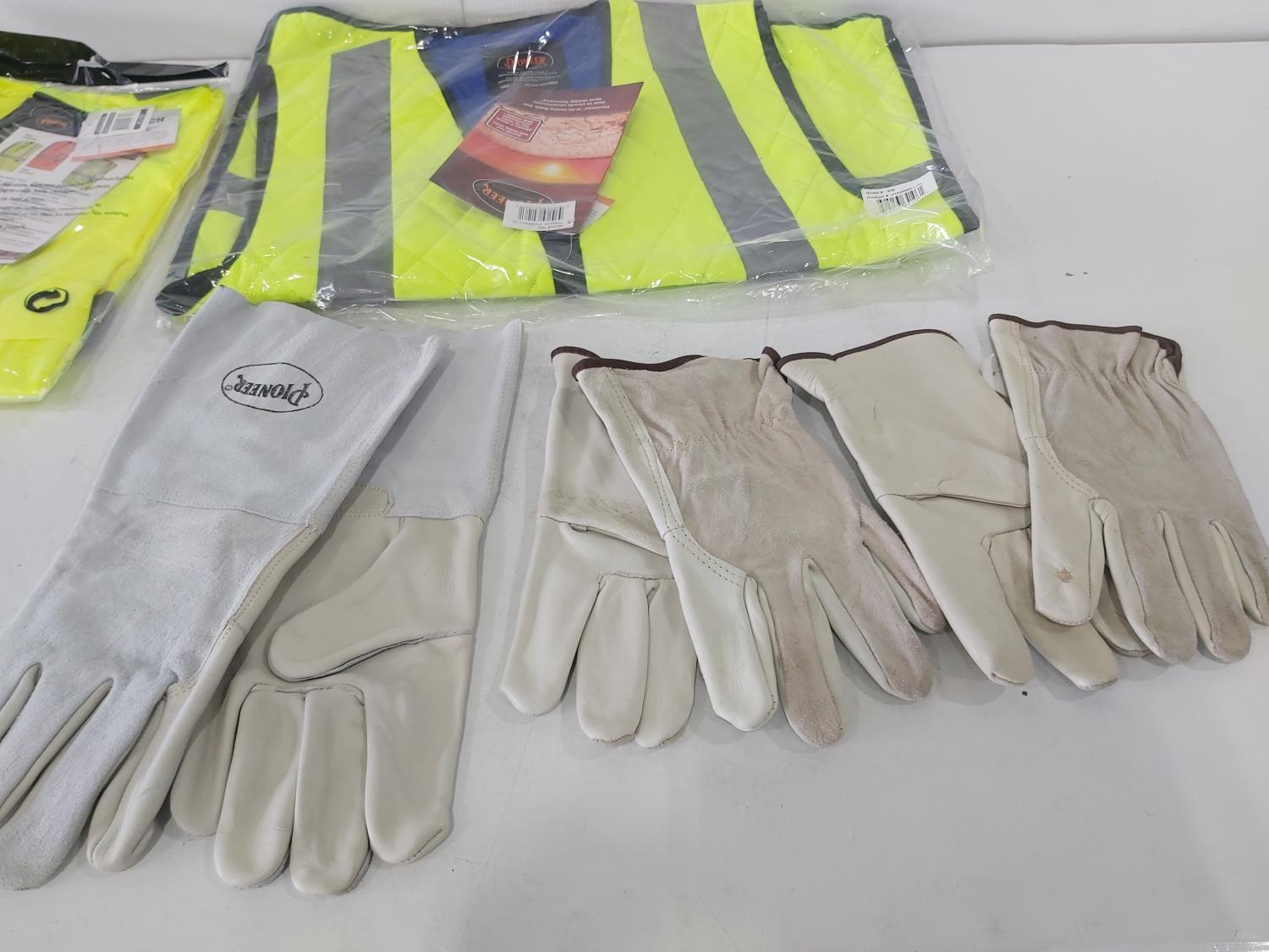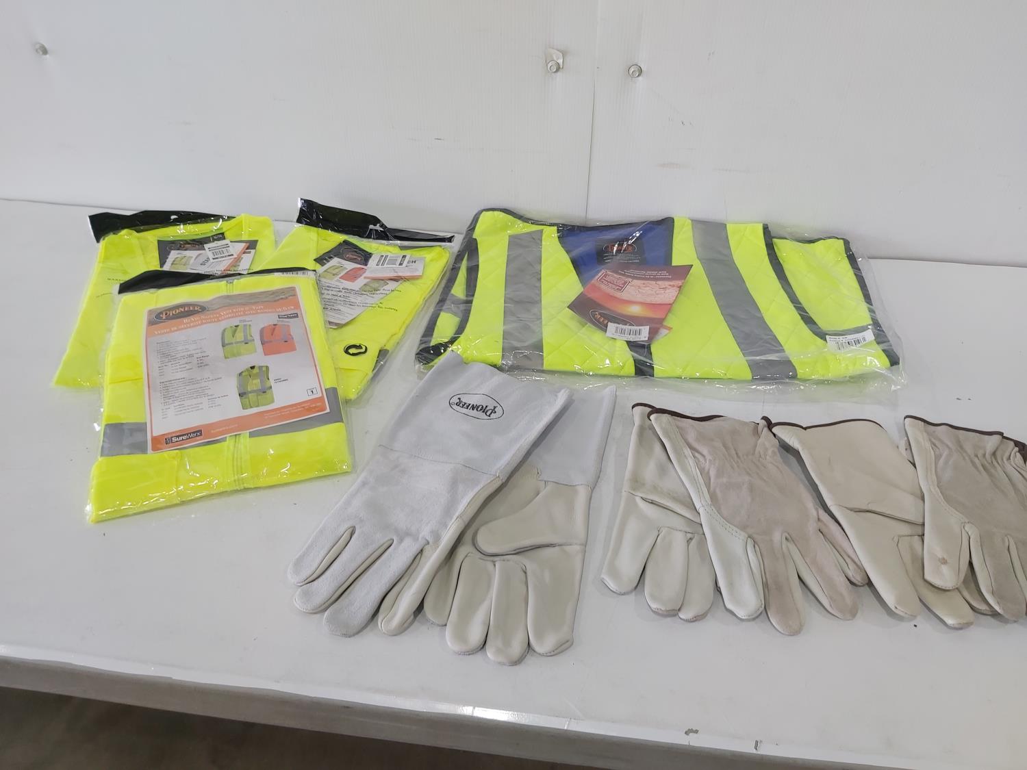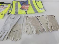 (2) L-XL quilted safety vests, (3) XL safety vests, (1) pair of XL leather welding gloves, (2) pairs of large leather work gloves