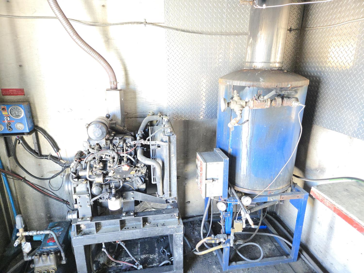 Cummins 6 cylinder diesel engine, 6 speed manual transmission, steamer 650 Fat Pump, Isuzu 3LB1 engine, (2) poly water storage tanks, 21' van body, spring suspension, 12,000 lb front axle, 23,000 lb rear axles, 11R22.5 tires