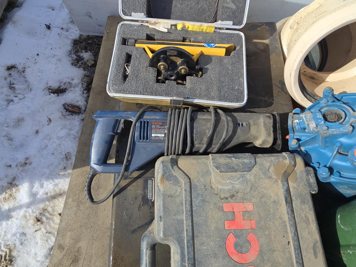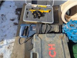 tools include Burger 190B level, Bosch 18V drill with (3) batteries, Ryobi sawzall, miscellaneous pipe fittings