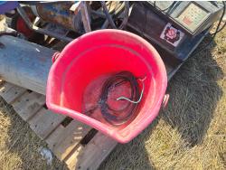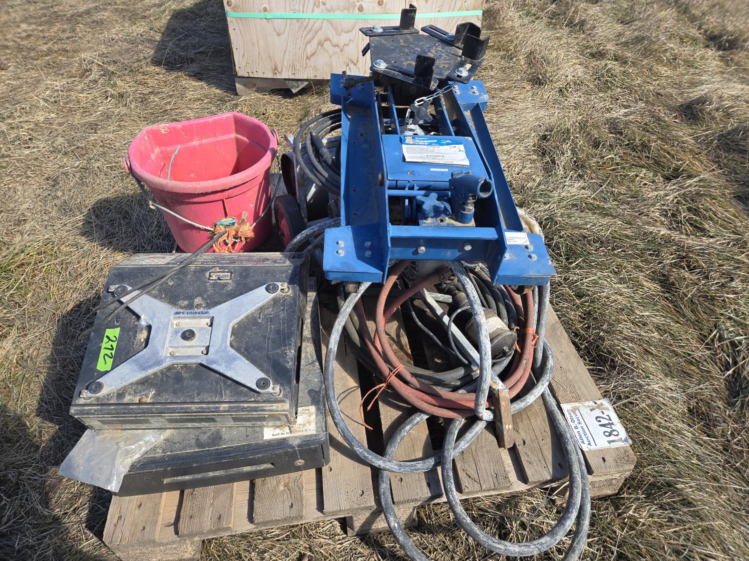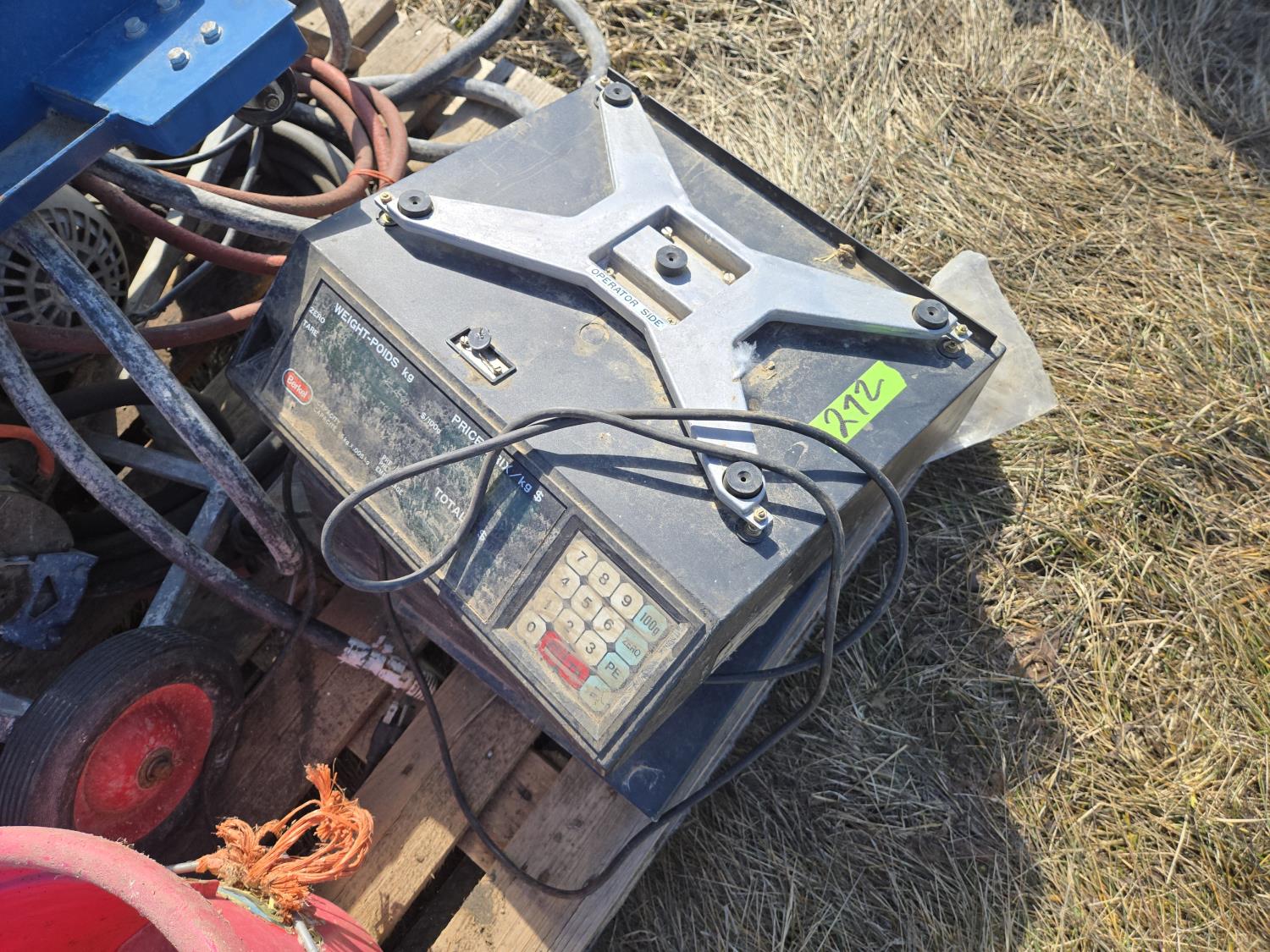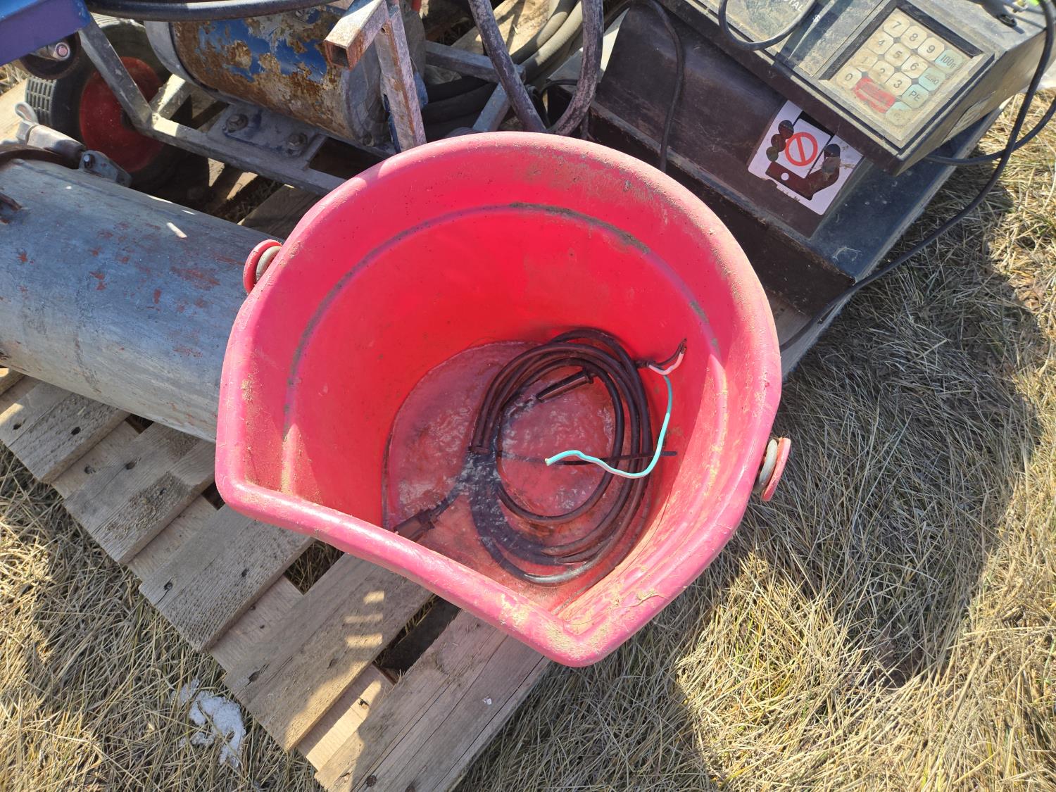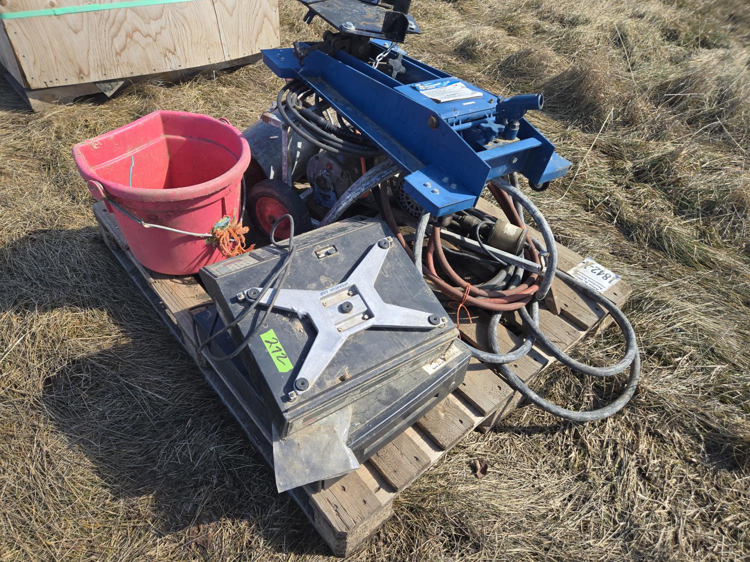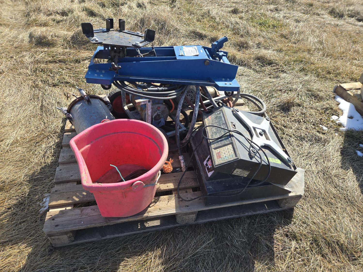 transmission jack, paint sprayer, poly feed bucket, scale head