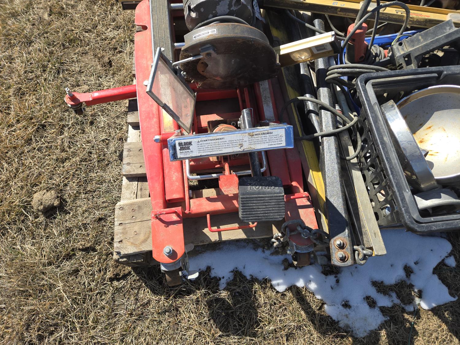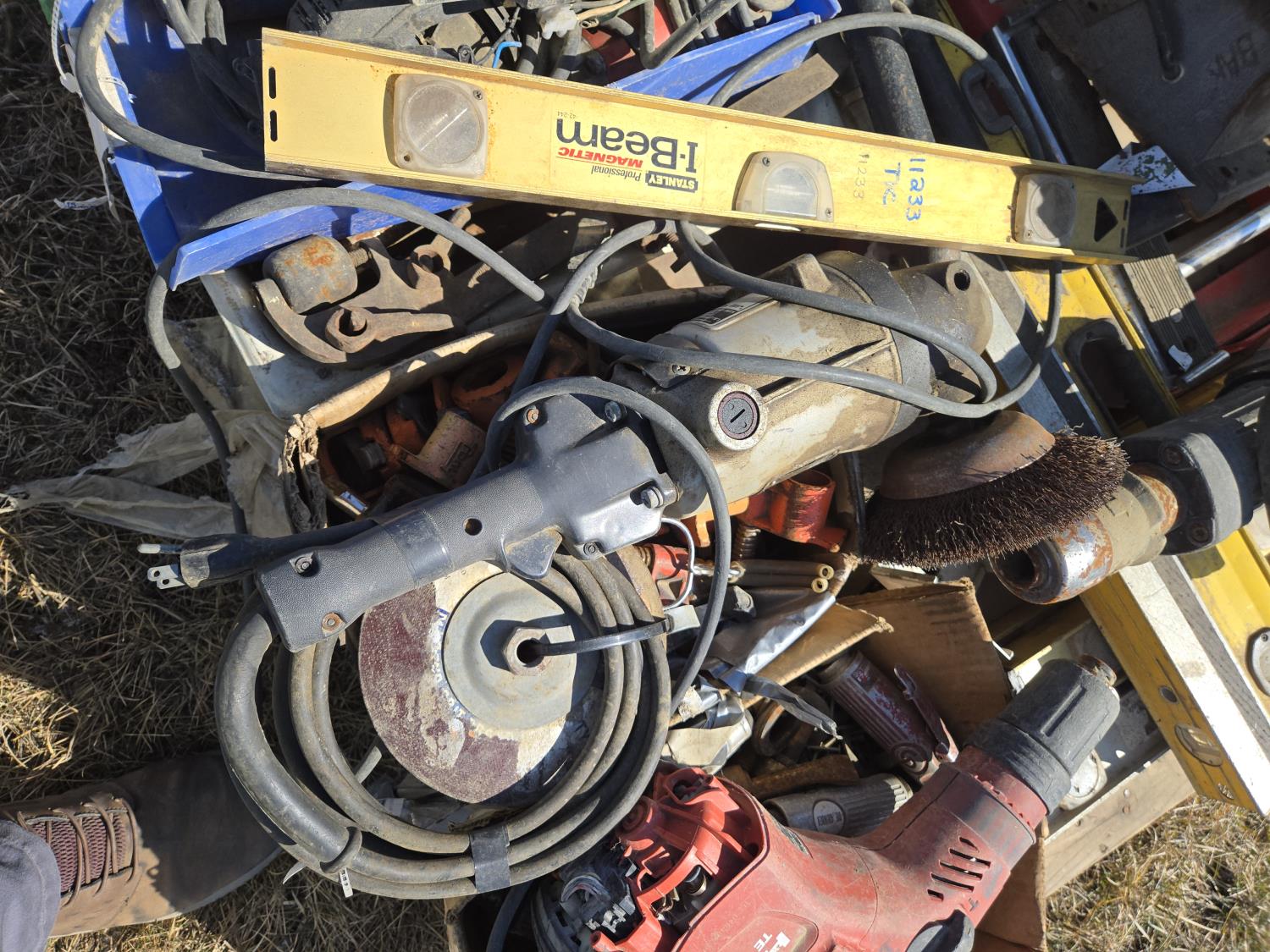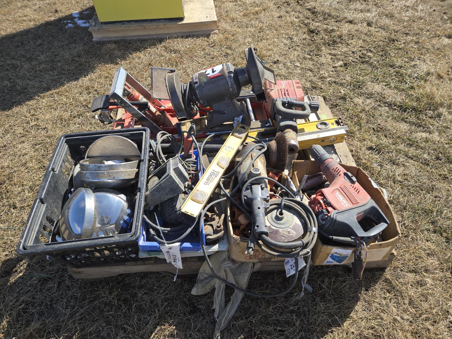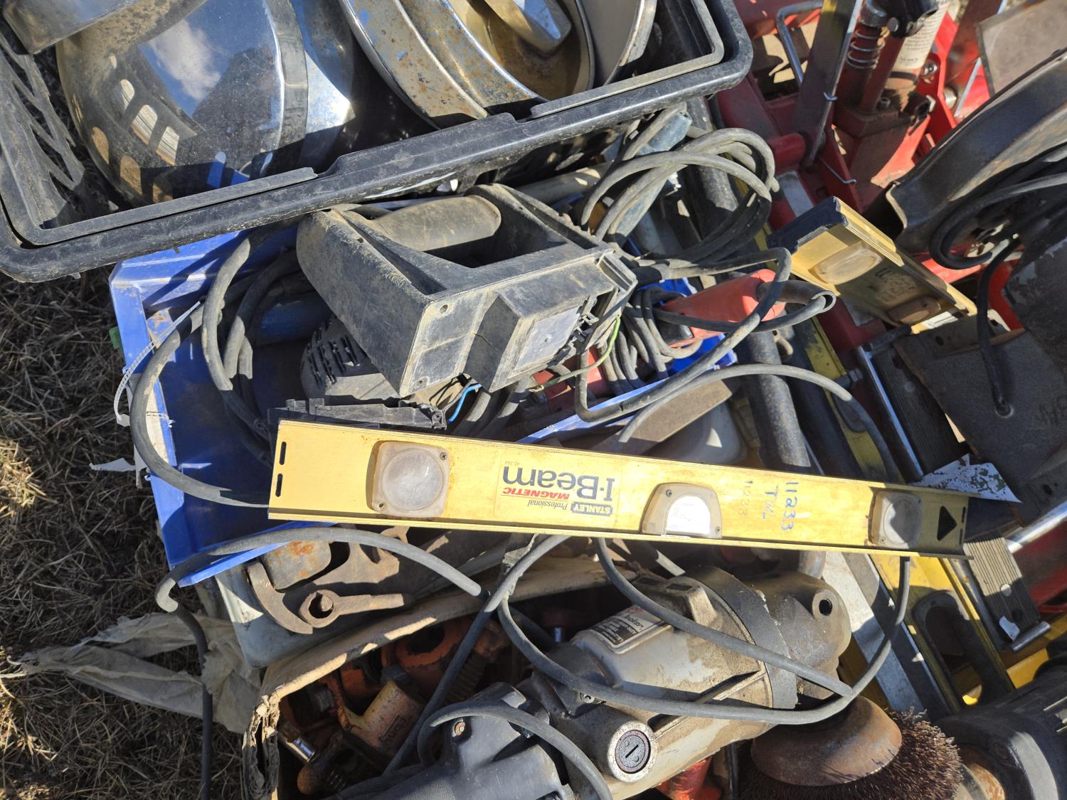 levels, motorcycle lift, bench grinder, miscellaneous tools