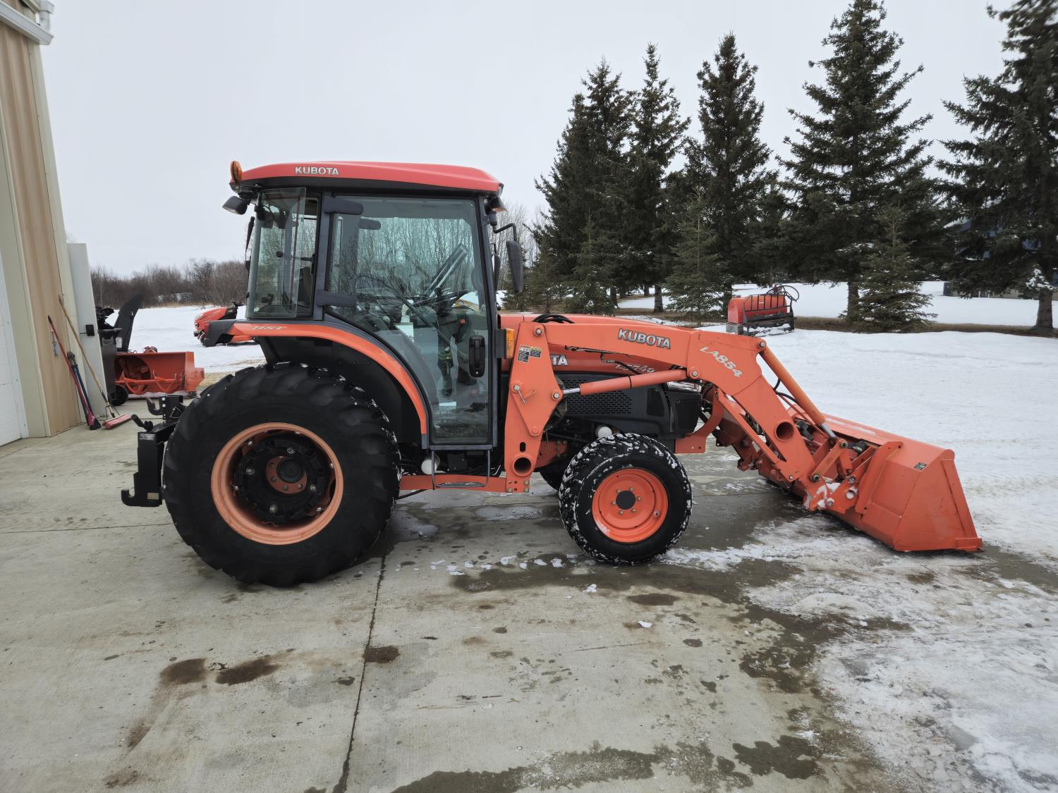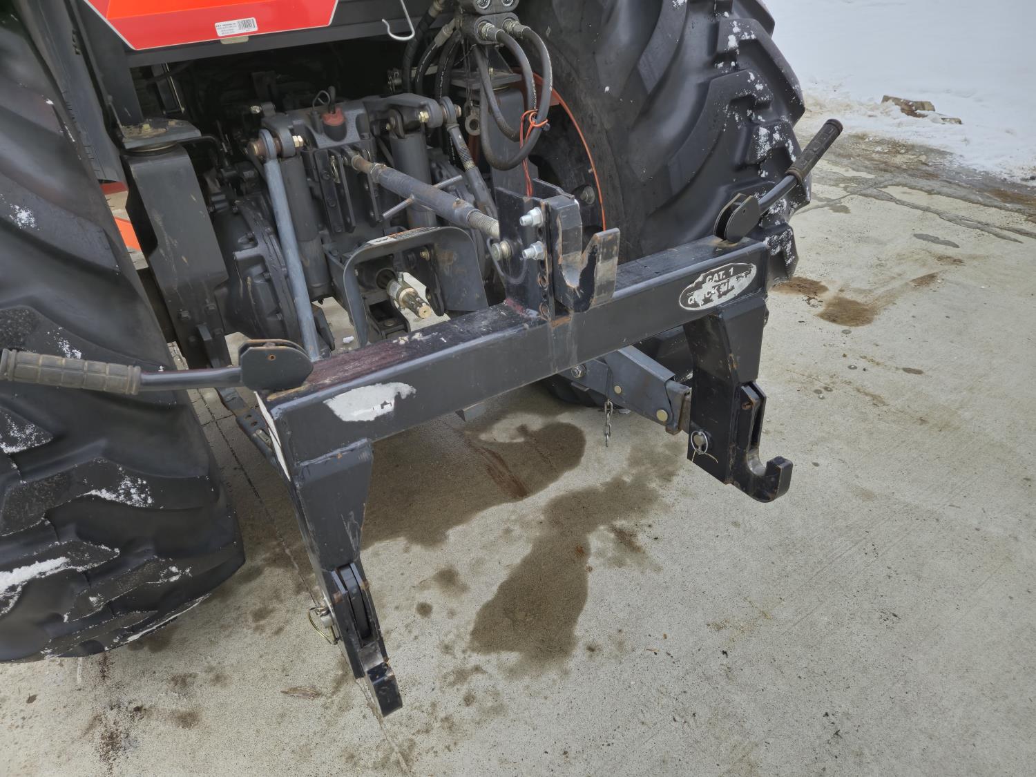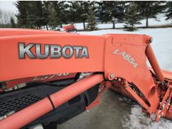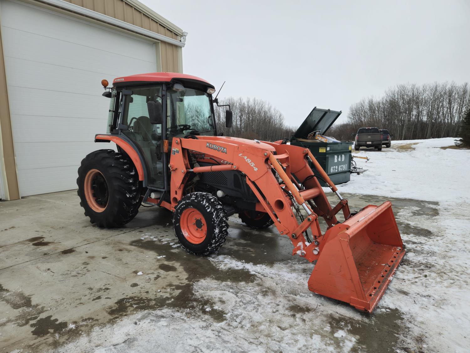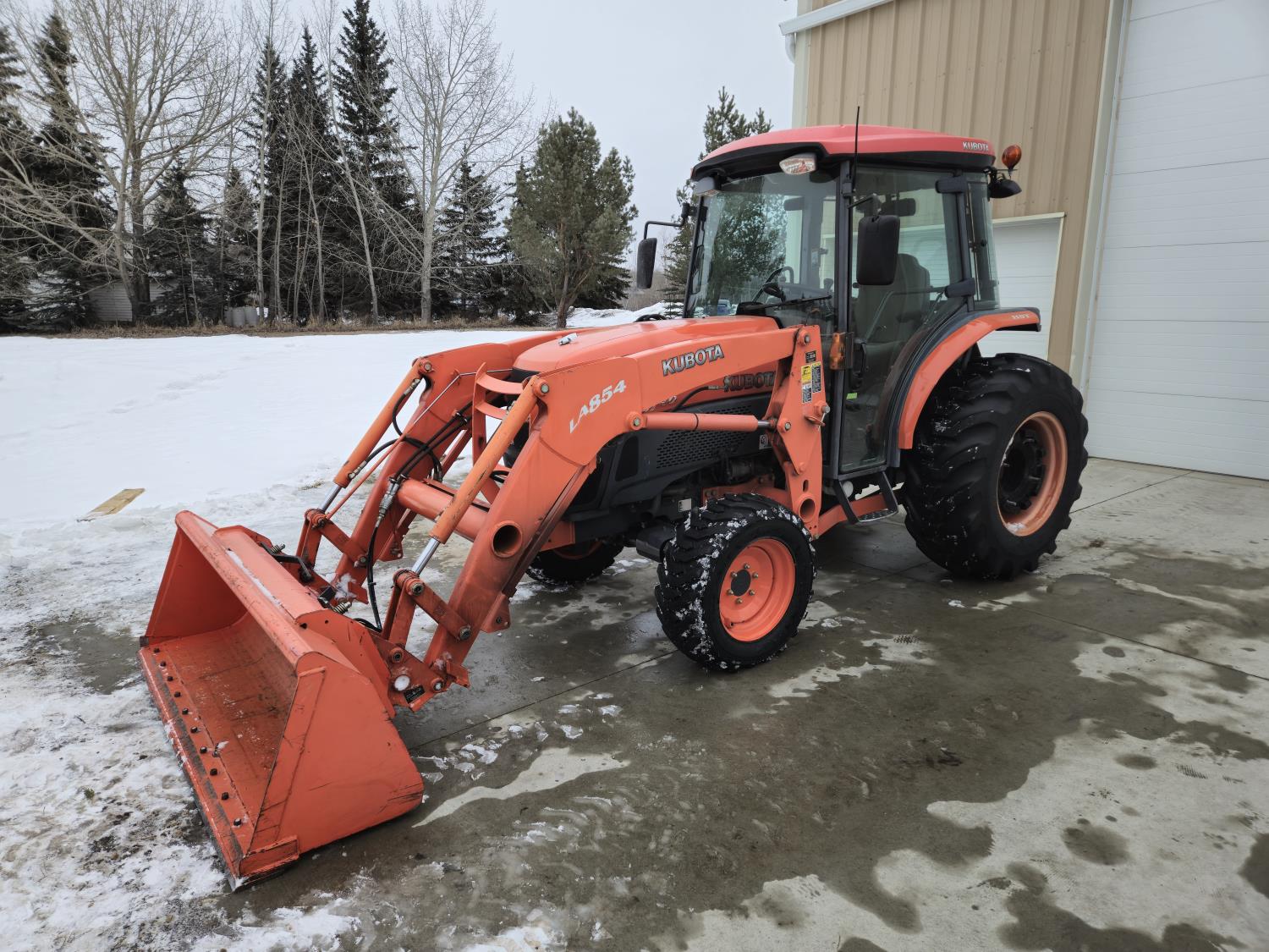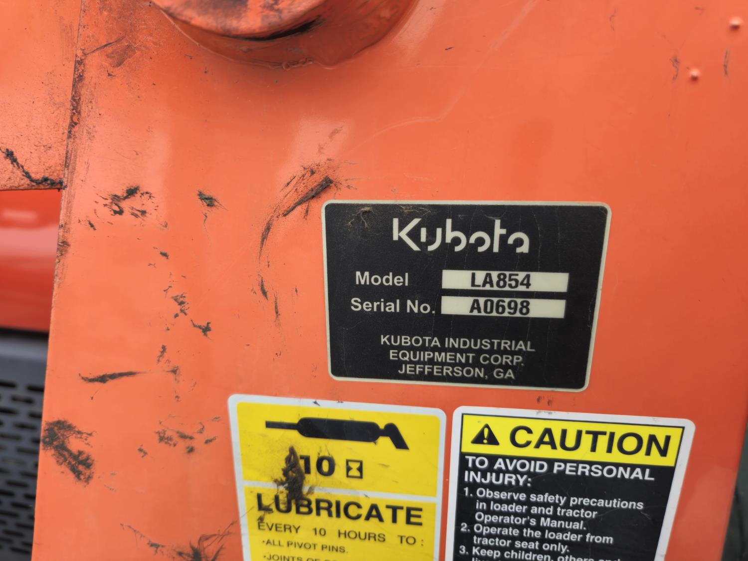 Kubota LA854 loader, 72 inch bucket, grill guard, Kubota 2.4 4 cylinder 59 HP, diesel engine, 50 PTO HP, hydro 3 range transmission, cab, rear differential lock, joystick, A/C, radio, hydraulic Q/A bucket, 540 PTO, Q/A 3 point hitch, 2 rear hydraulic outlets, rear wheel weights, 10-16.5 front tires, 17.5L-24 rear tires