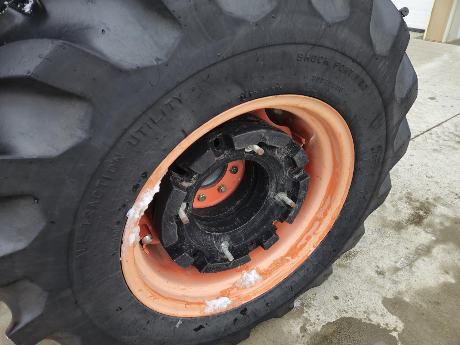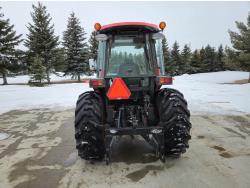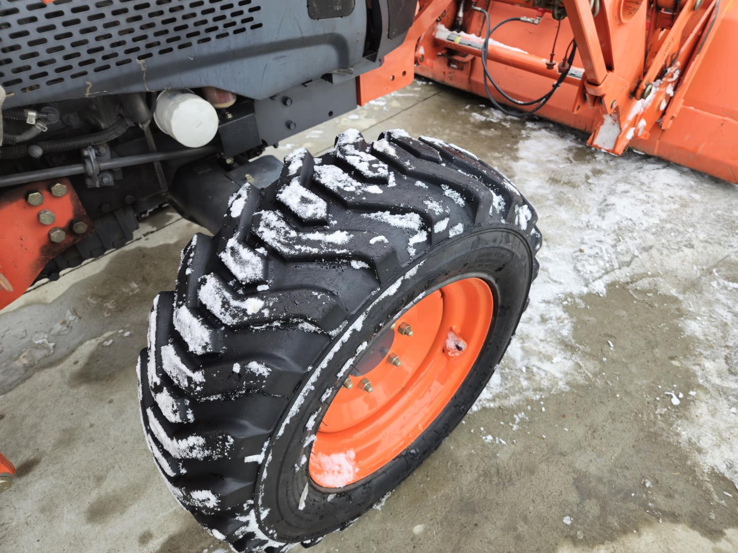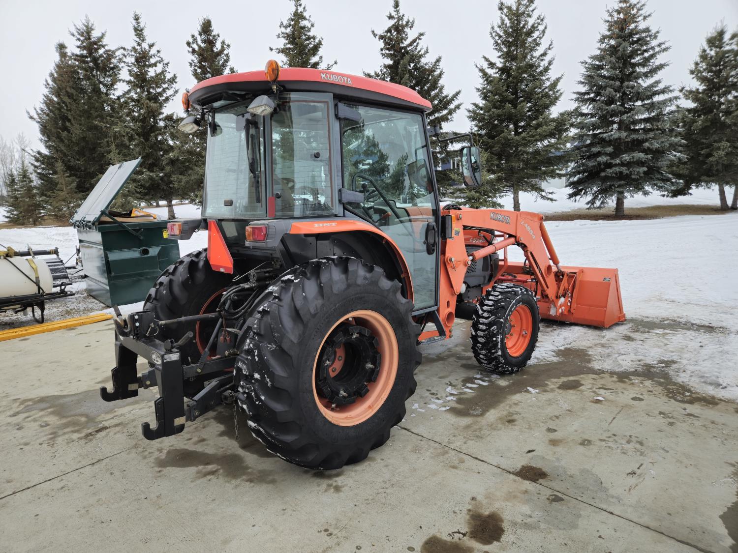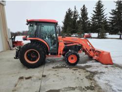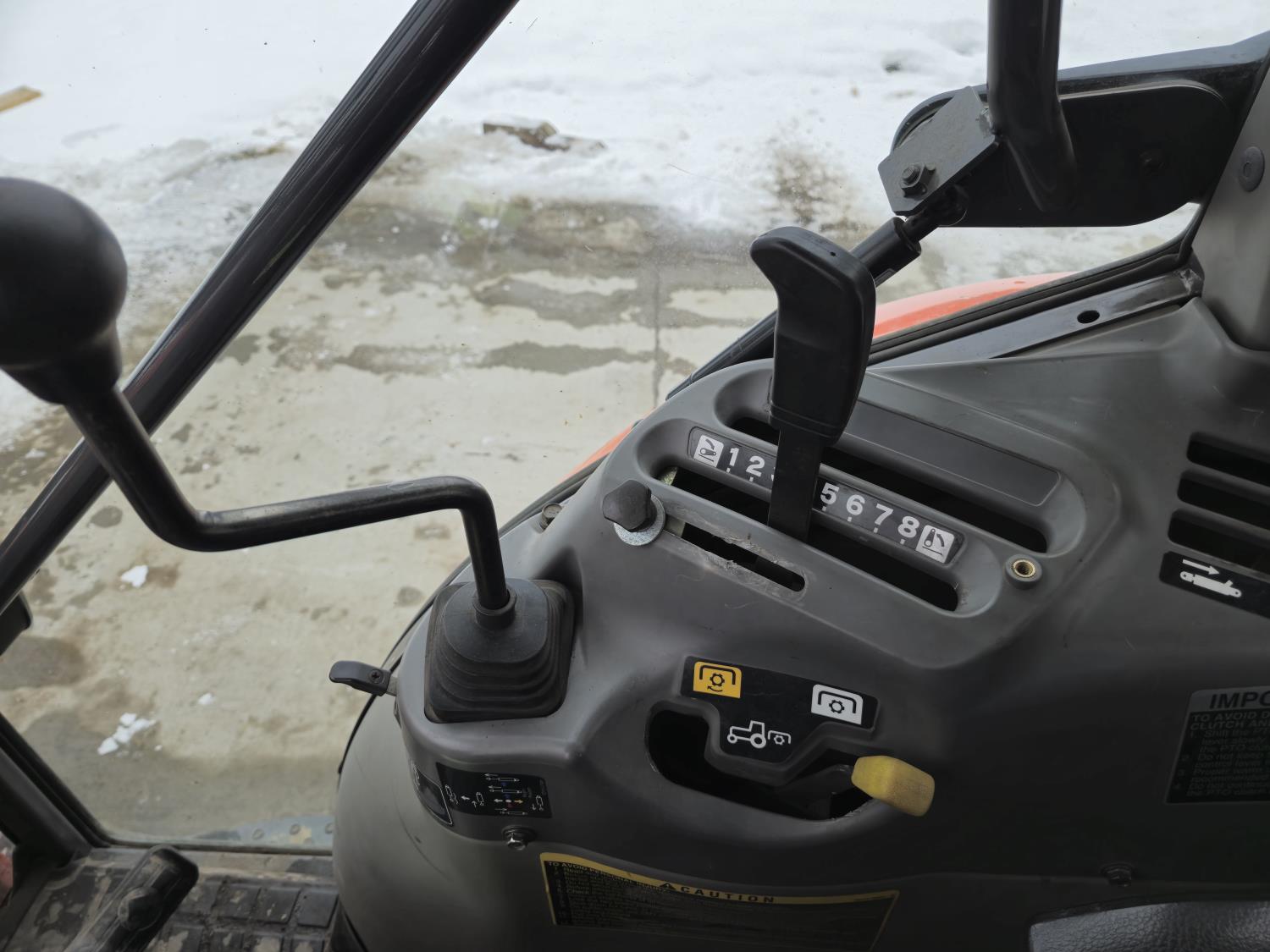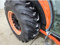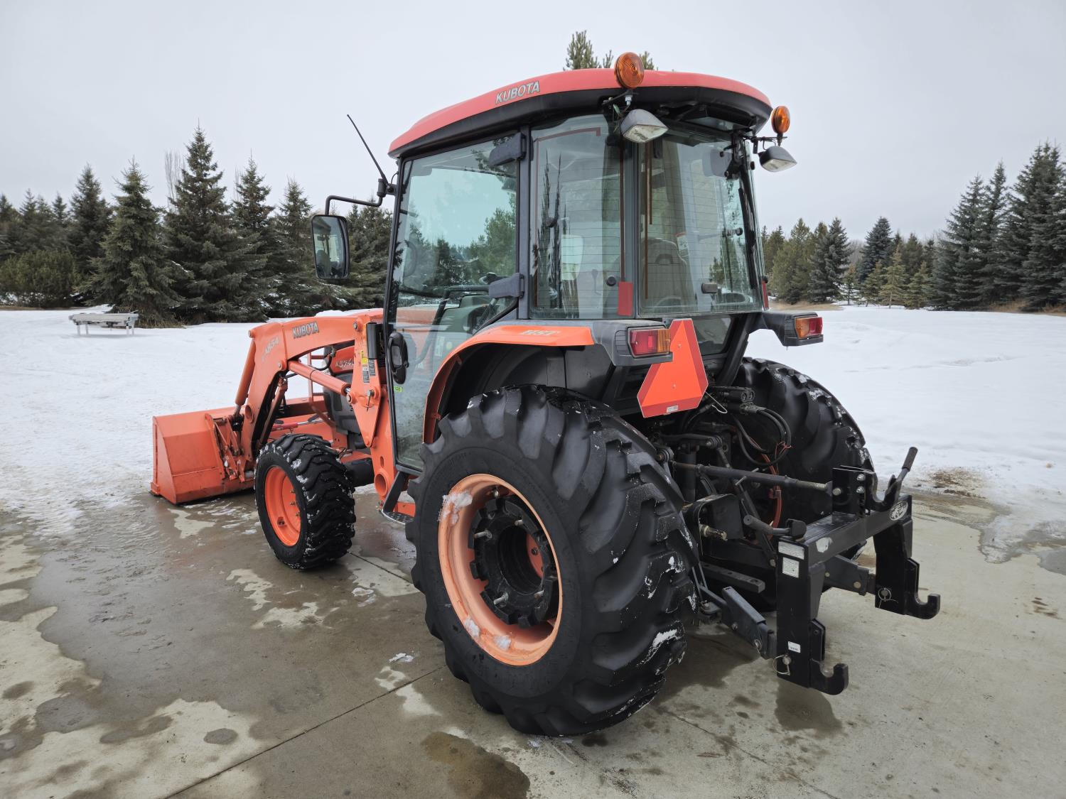 Kubota LA854 loader, 72 inch bucket, grill guard, Kubota 2.4 4 cylinder 59 HP, diesel engine, 50 PTO HP, hydro 3 range transmission, cab, rear differential lock, joystick, A/C, radio, hydraulic Q/A bucket, 540 PTO, Q/A 3 point hitch, 2 rear hydraulic outlets, rear wheel weights, 10-16.5 front tires, 17.5L-24 rear tires