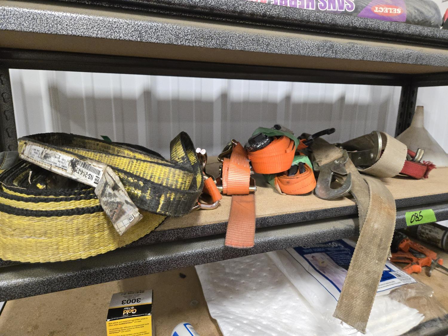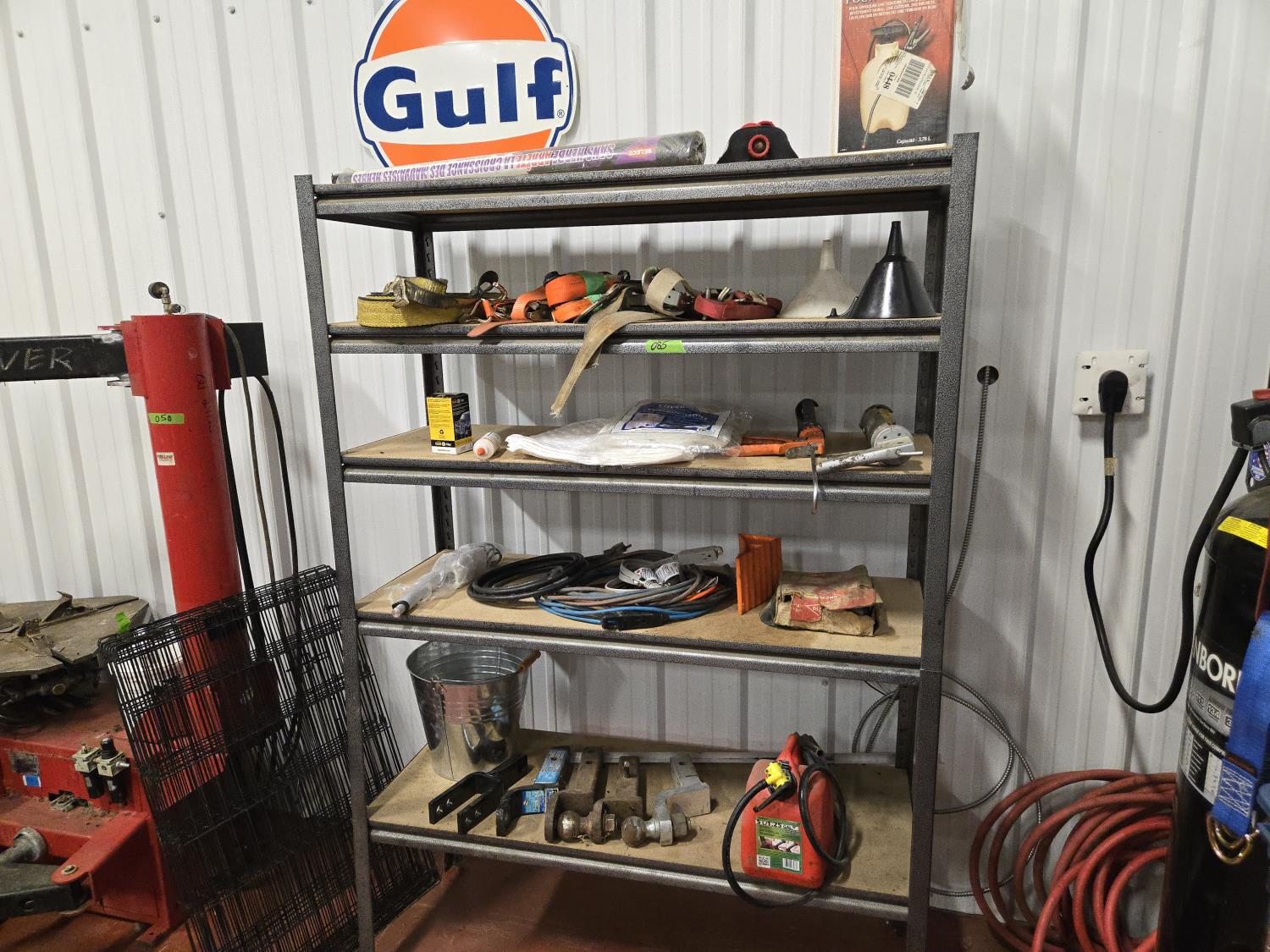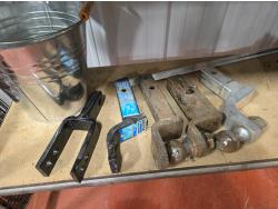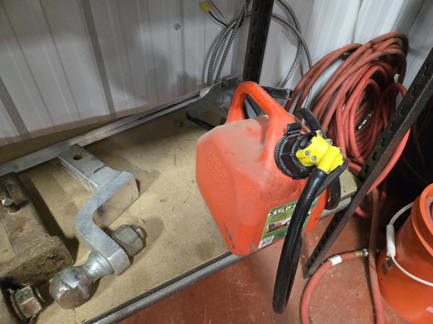 (5) trailer hitches, electrical extension cords, 1.25 poly fuel can, (2) grease guns, selection of cargo straps, hand sprayer, miscellaneous items