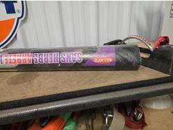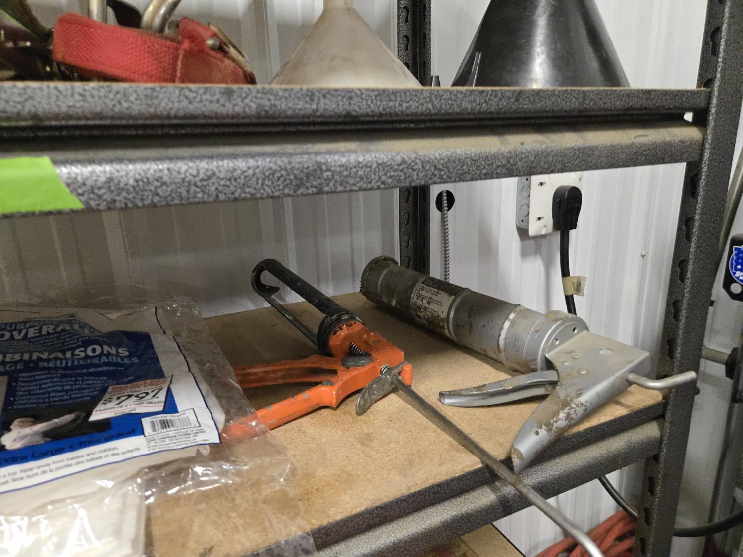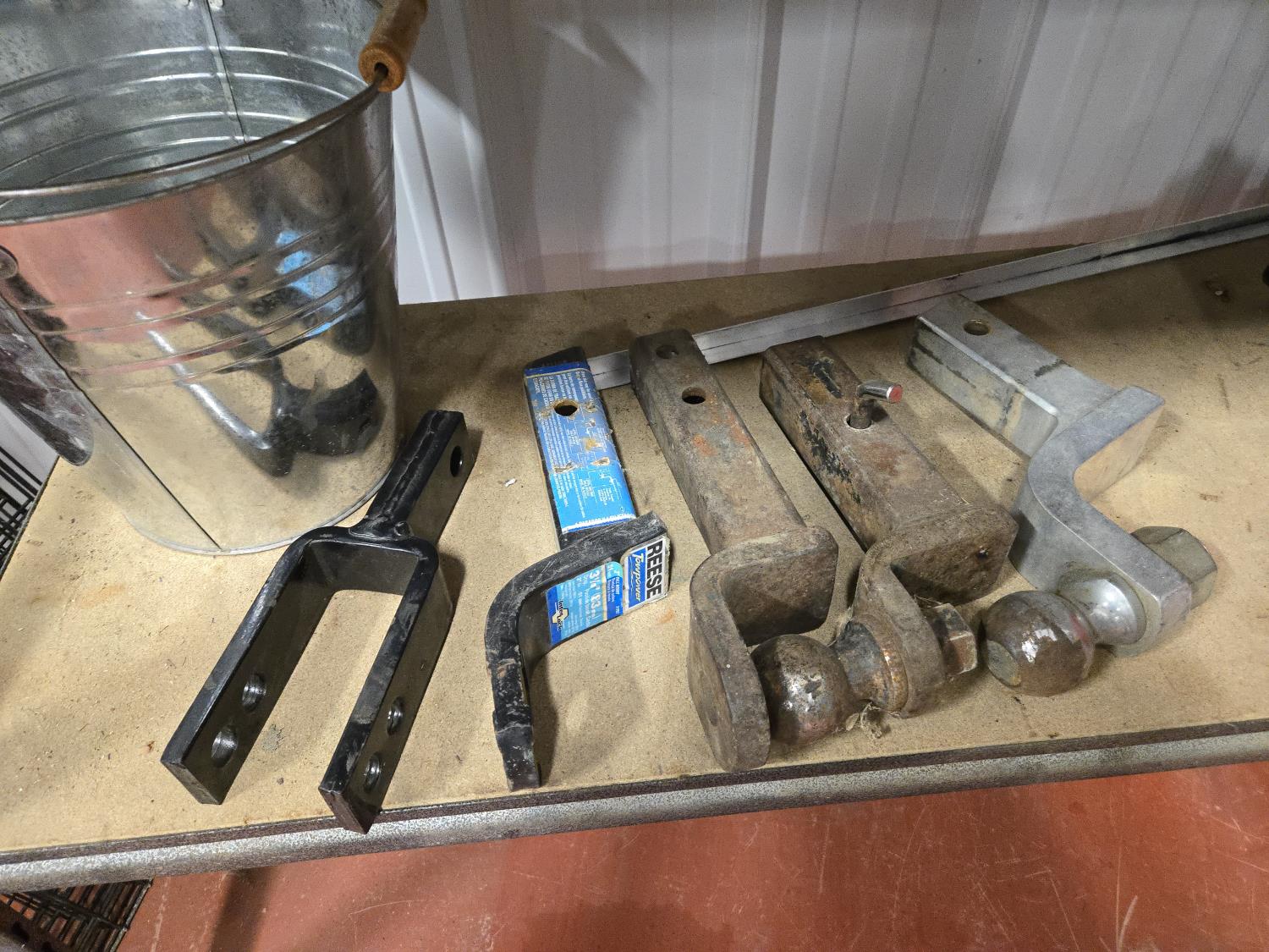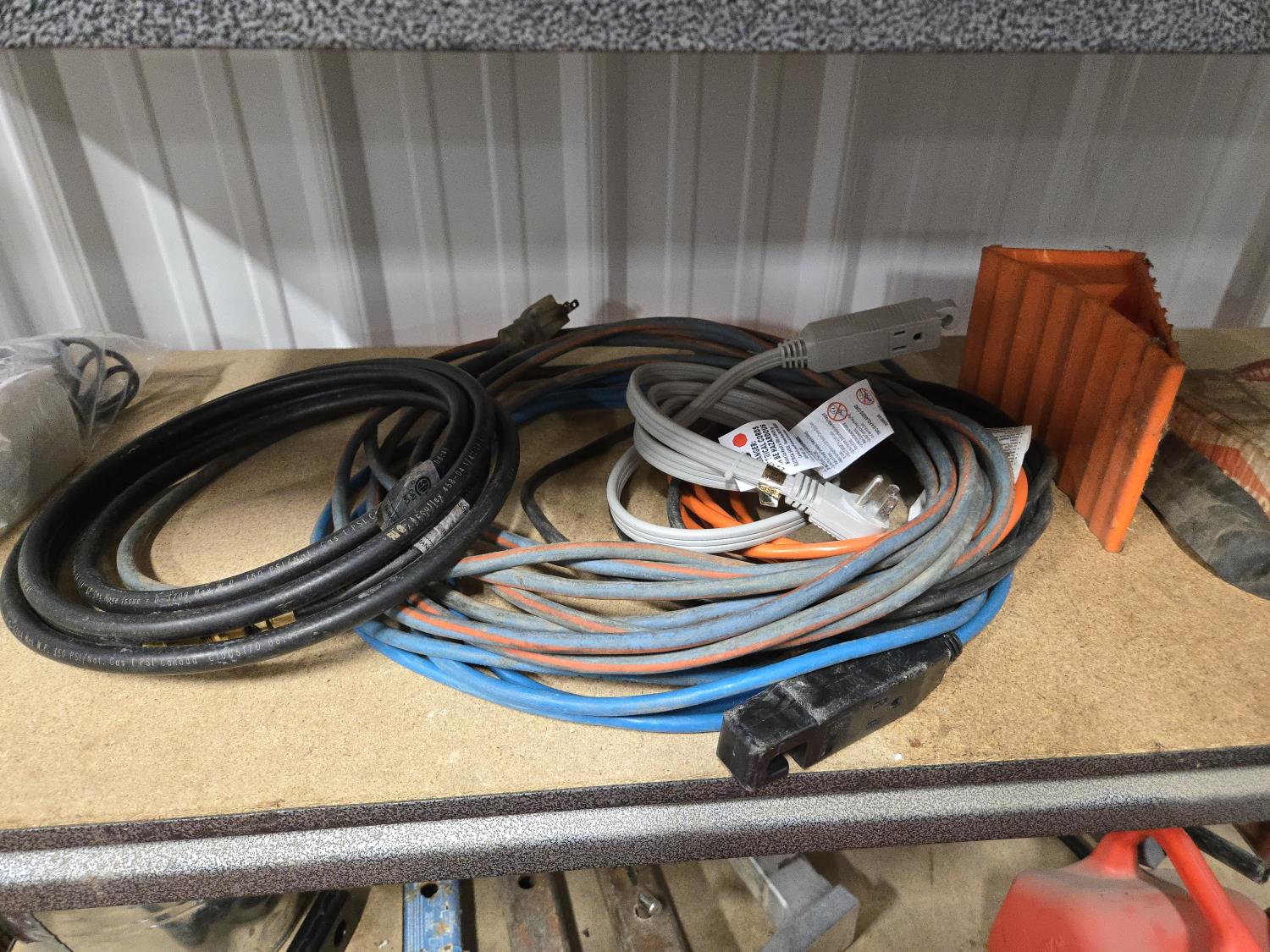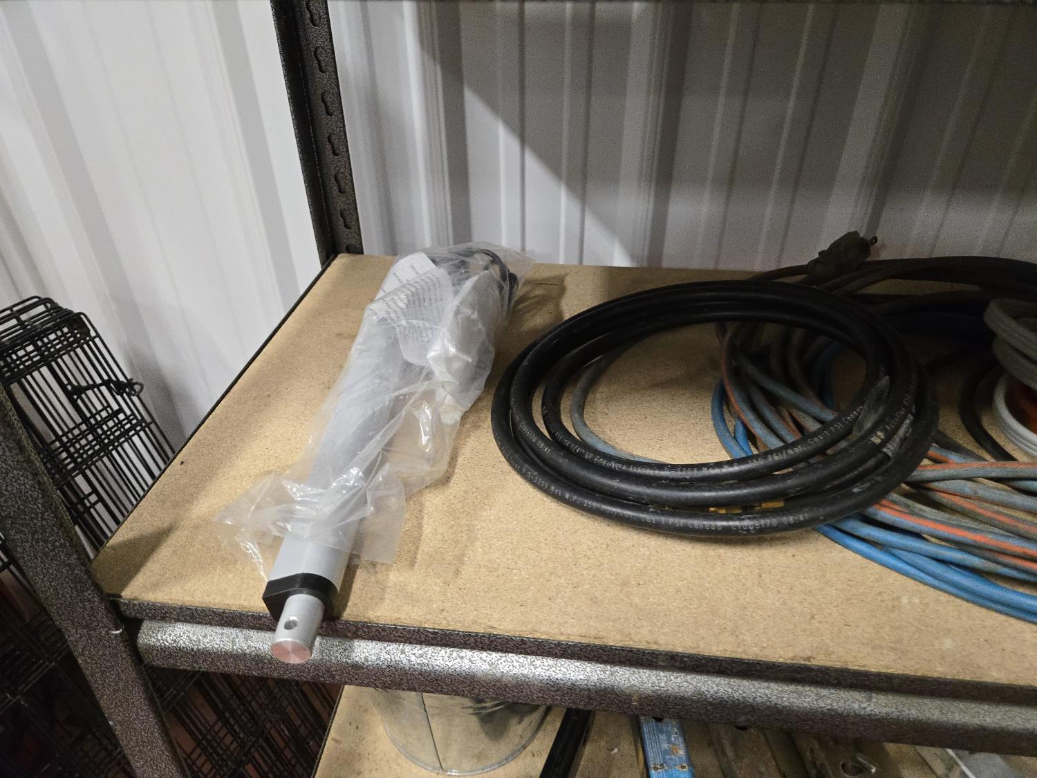 (5) trailer hitches, electrical extension cords, 1.25 poly fuel can, (2) grease guns, selection of cargo straps, hand sprayer, miscellaneous items