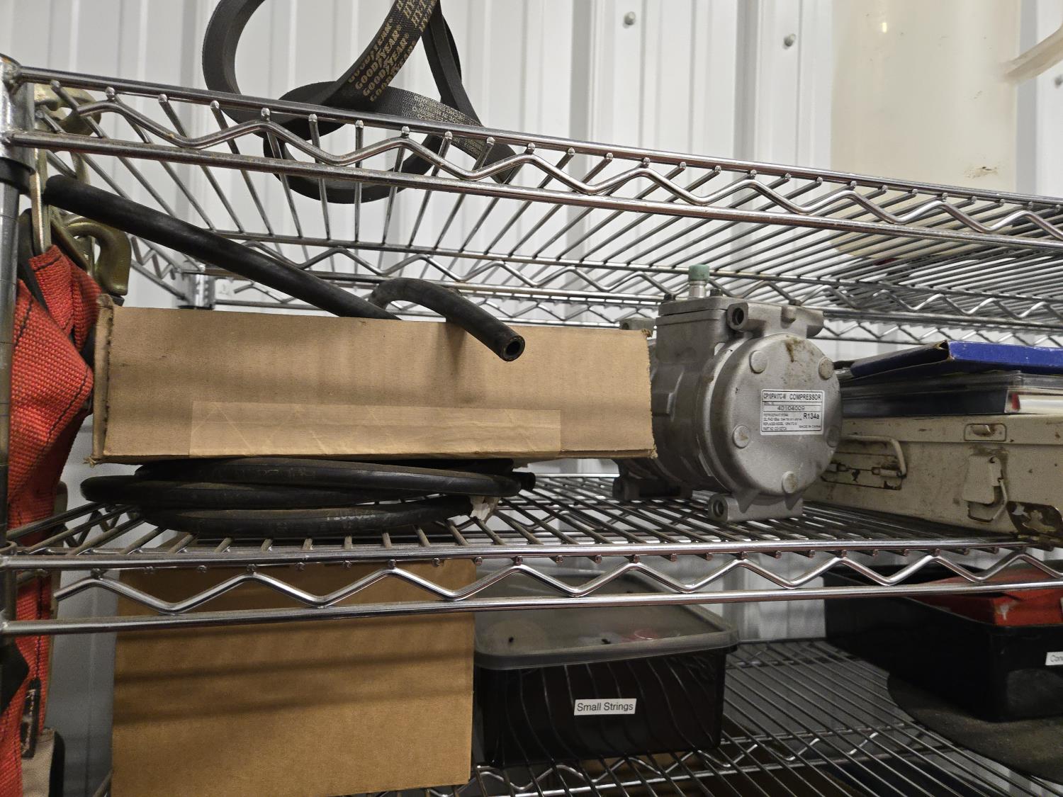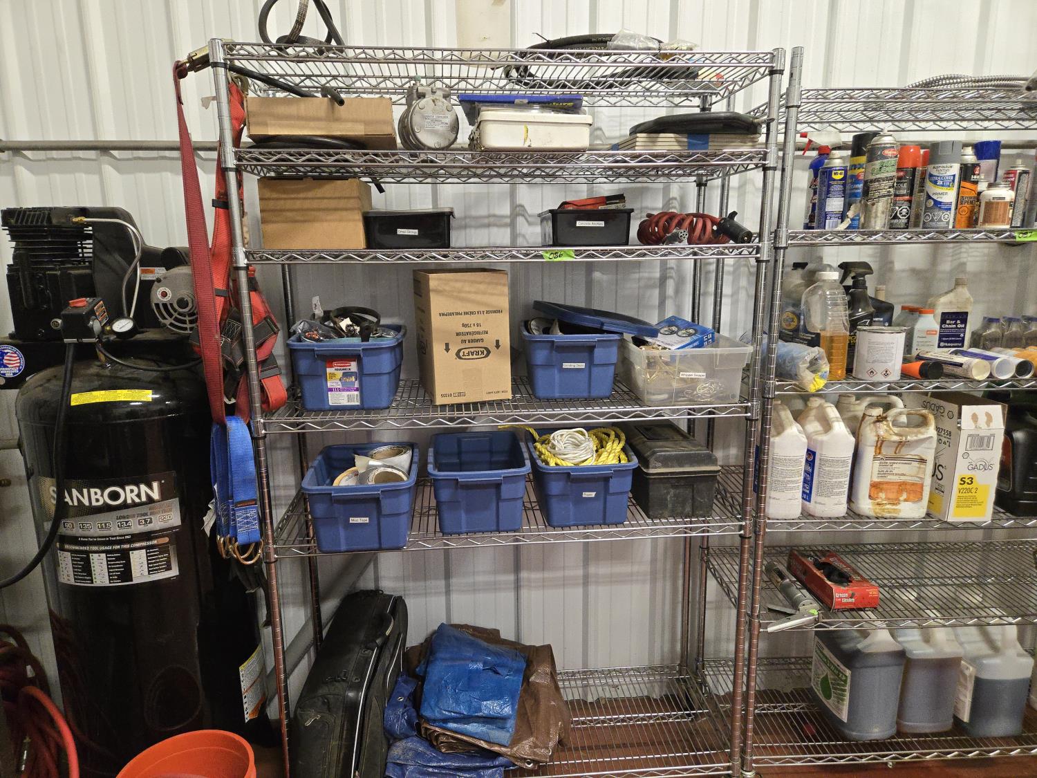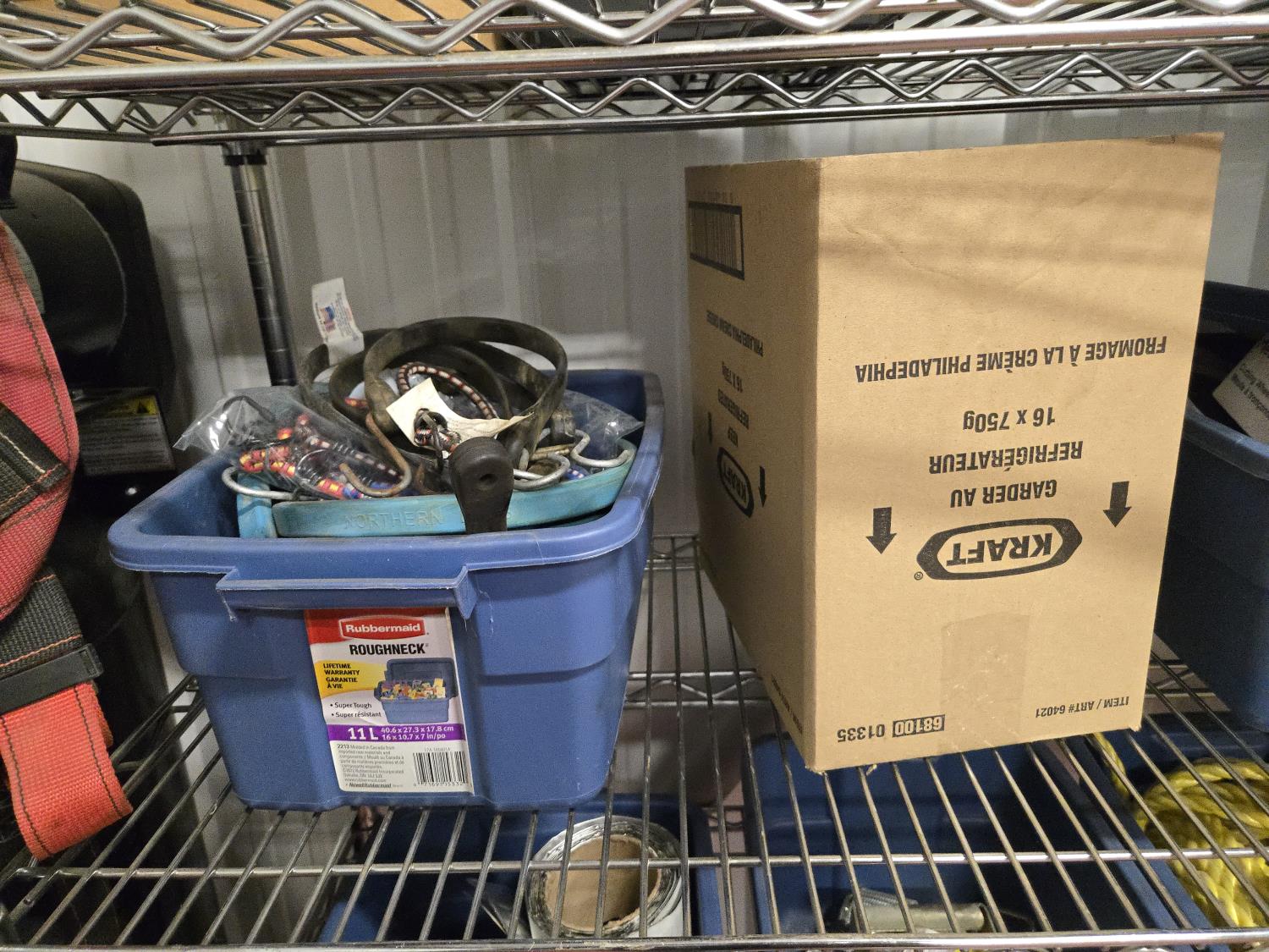 poly tarps, trailer connector harness, rope, string, miscellaneous tape, bungee cords, concrete anchors, steel fish tape, Flexible chrome trim, miscellaneous items